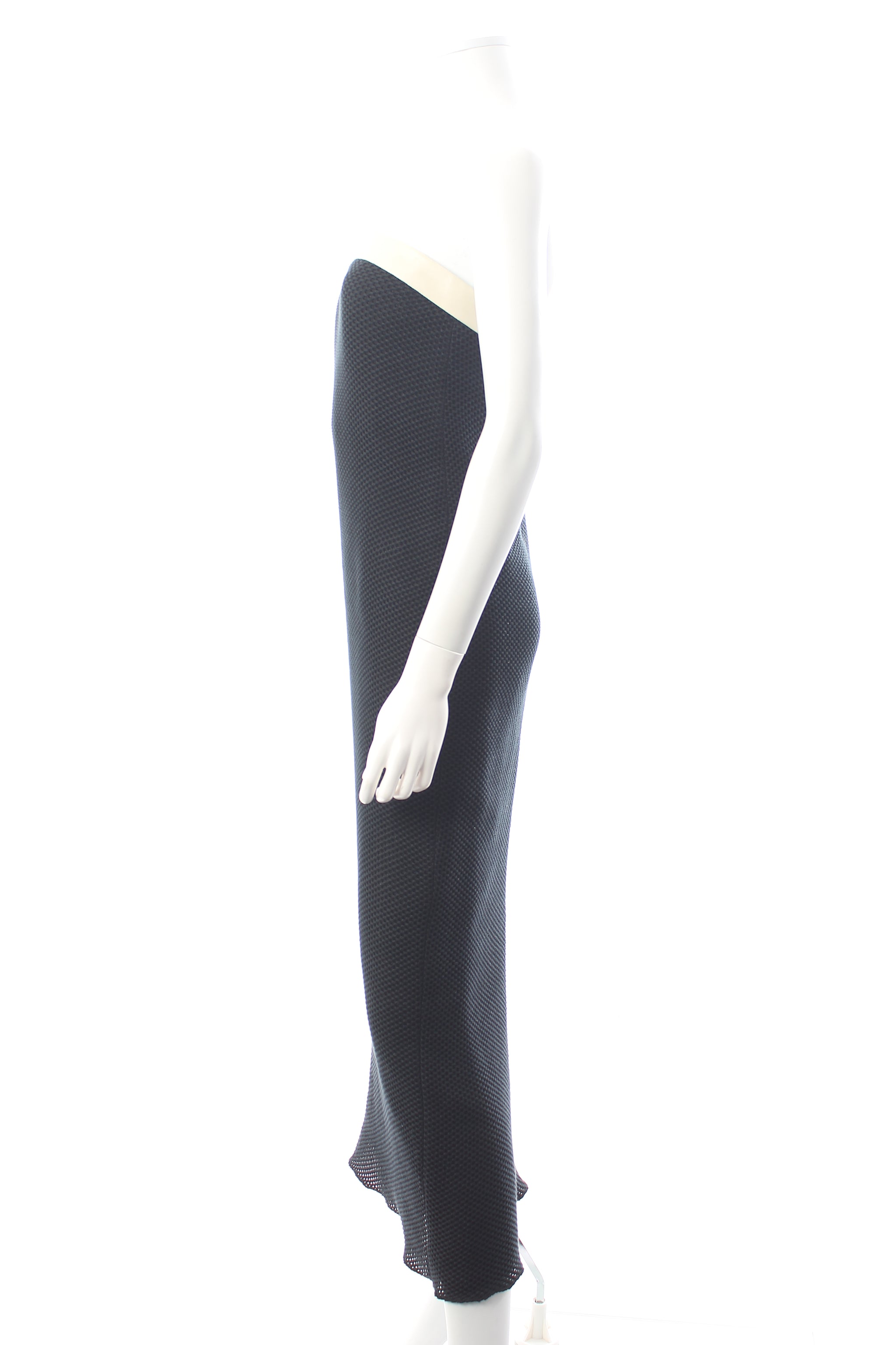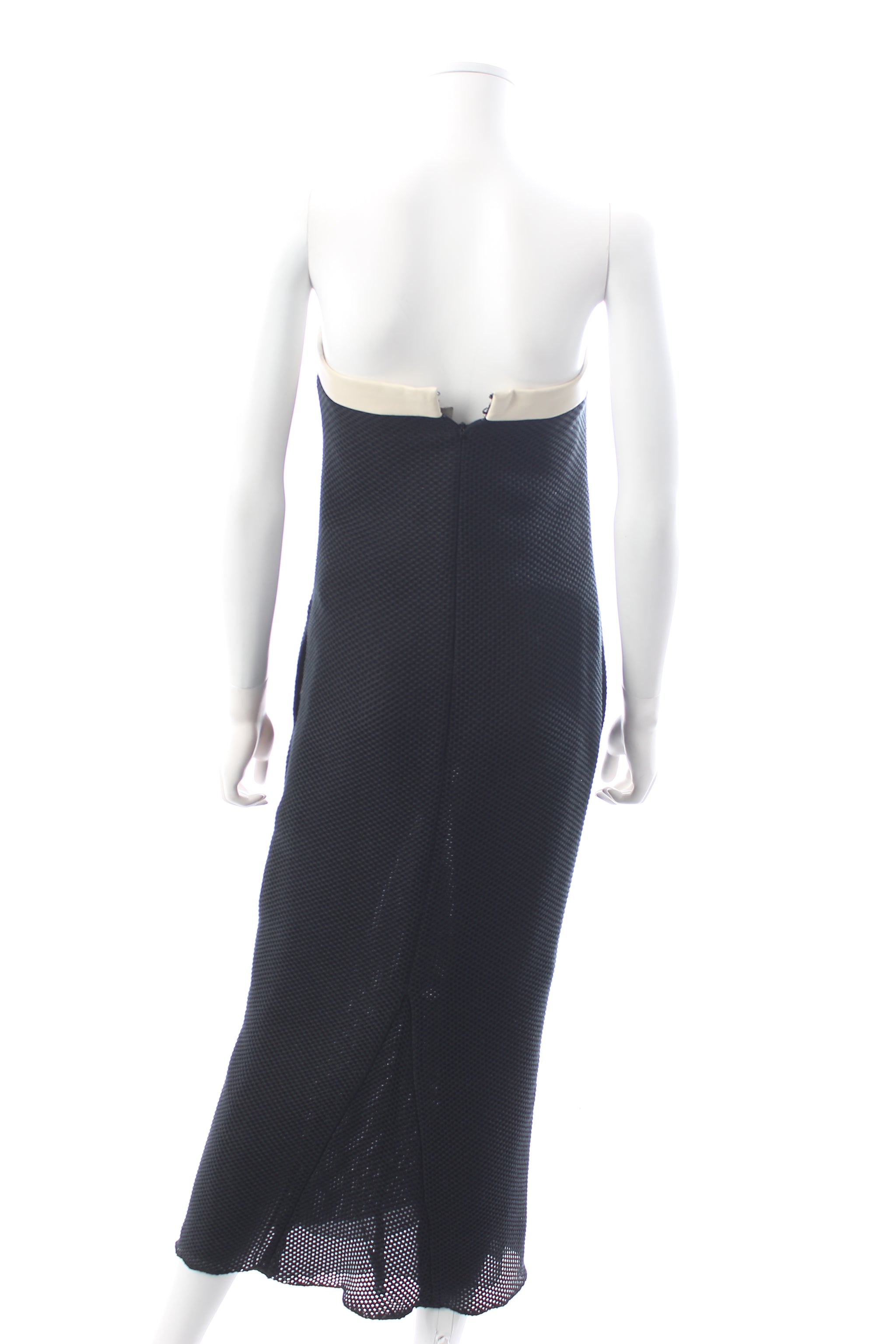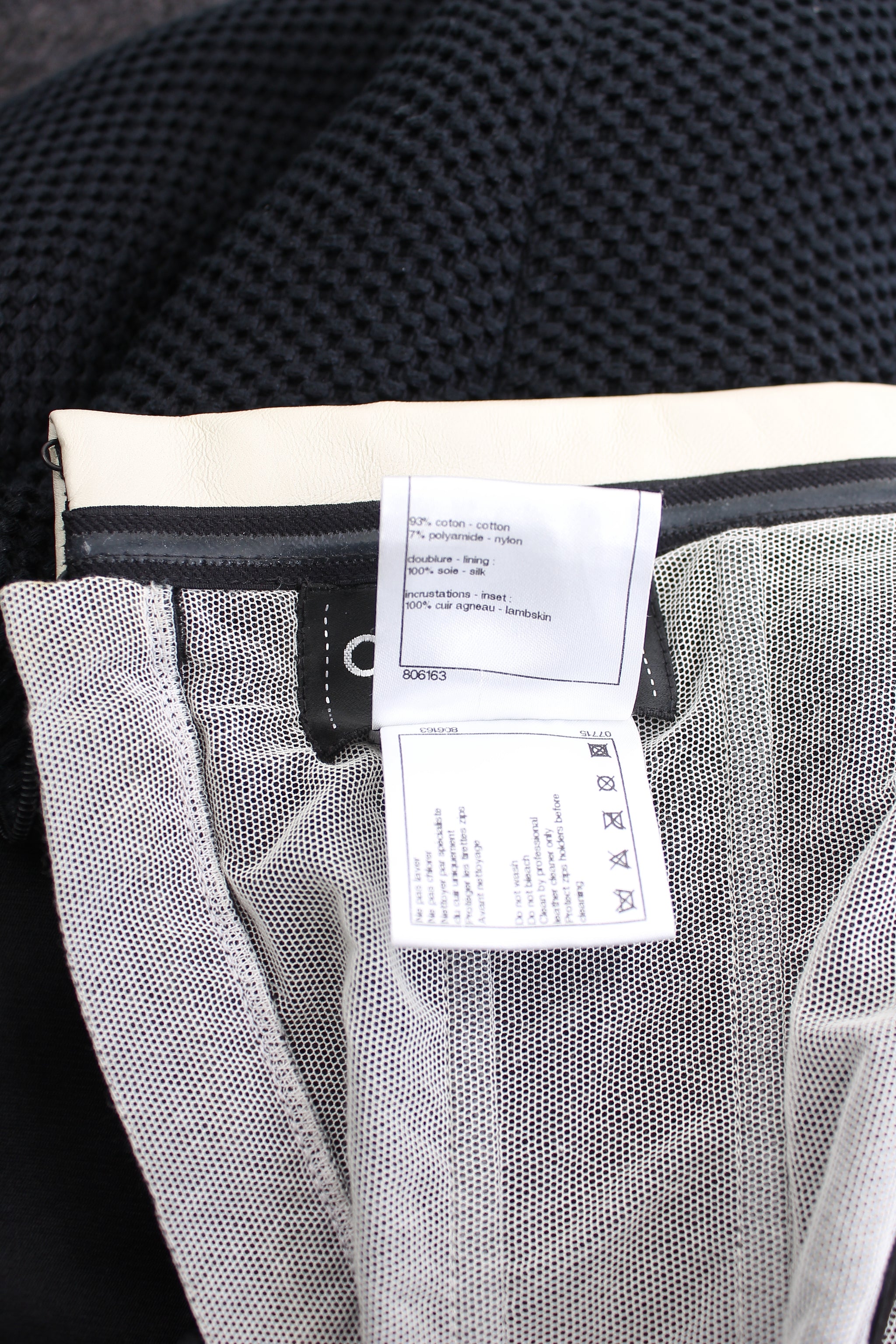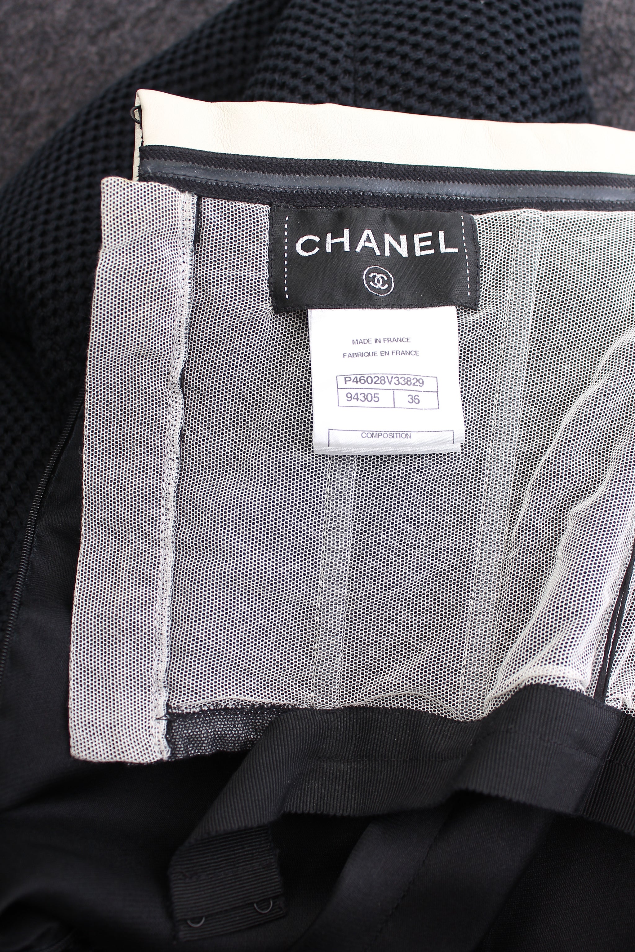 This elegant Chanel midi dress is made from cotton-blend knitted fabric with contrasting leather trim at the bust. Zip fastening at the back. Built-in corset. Made in France