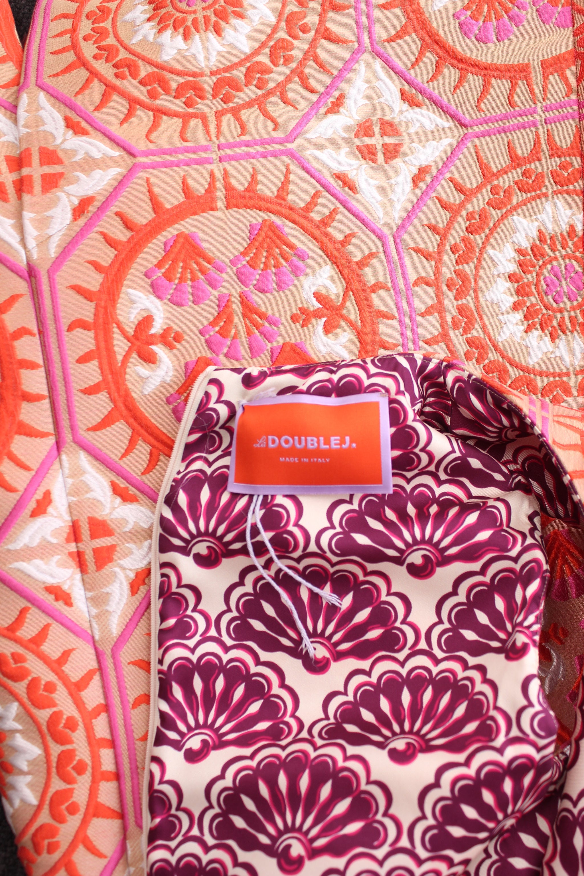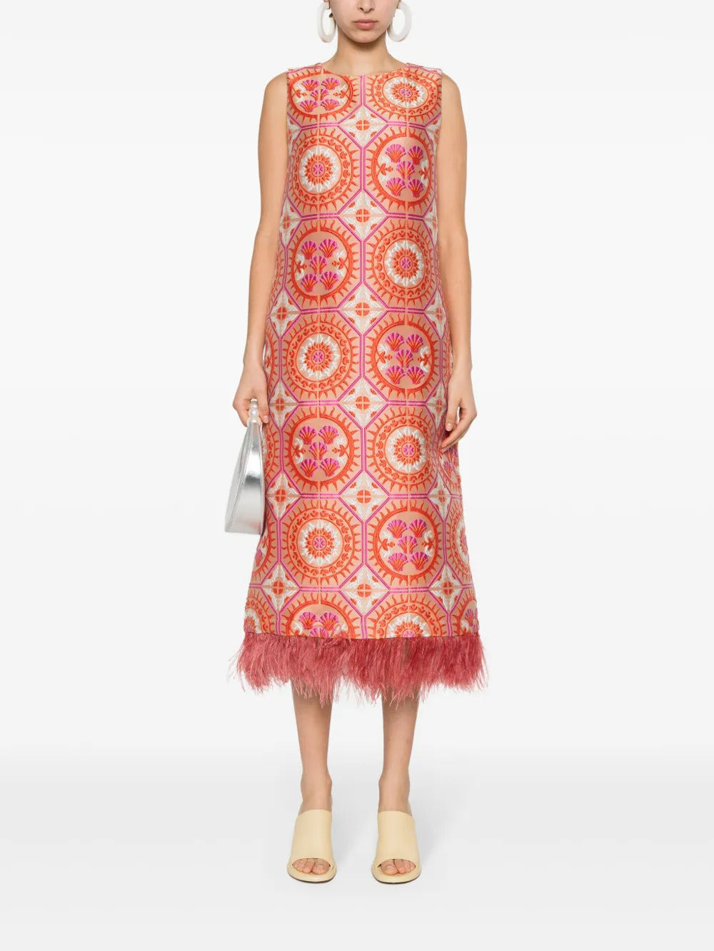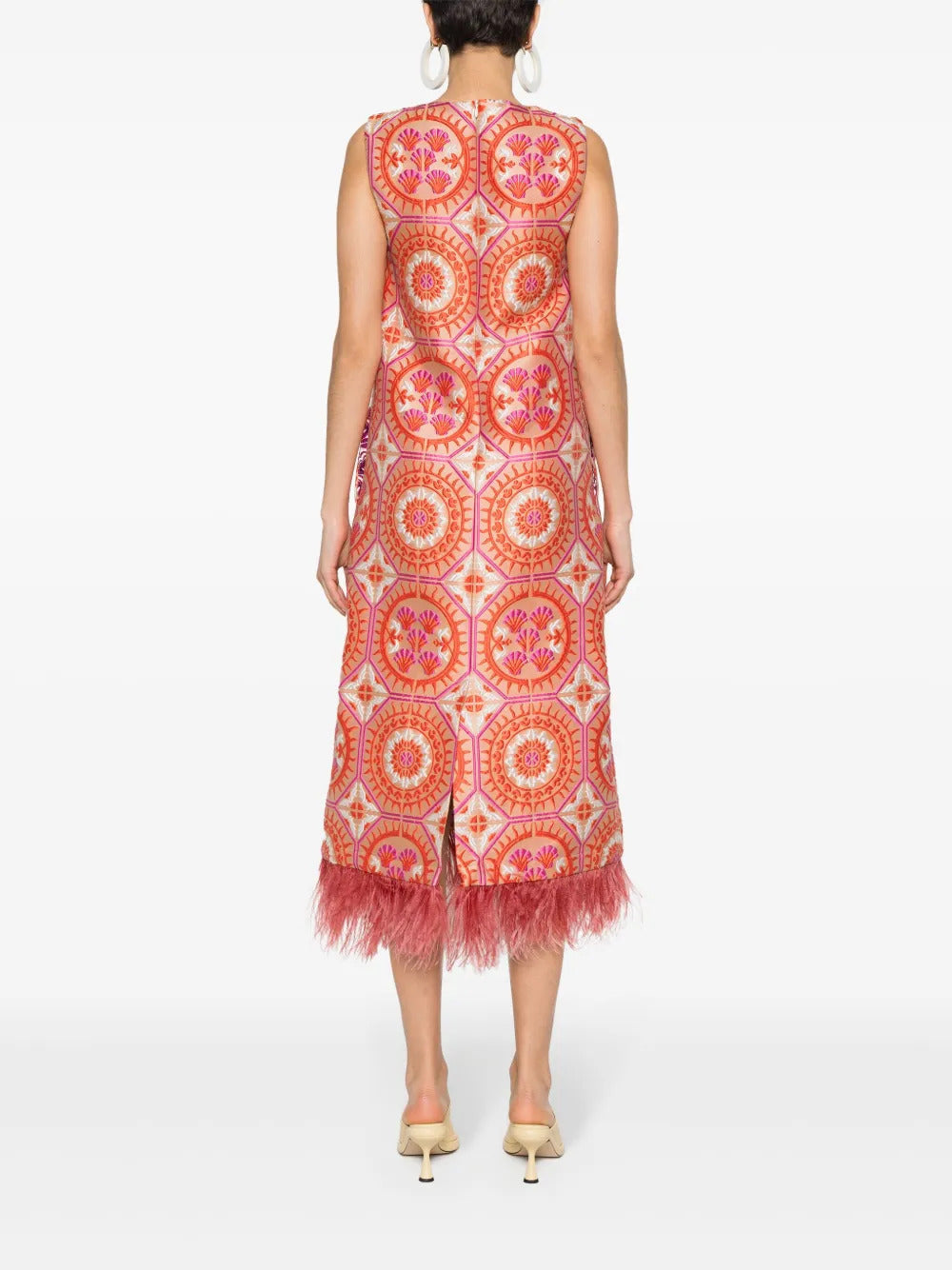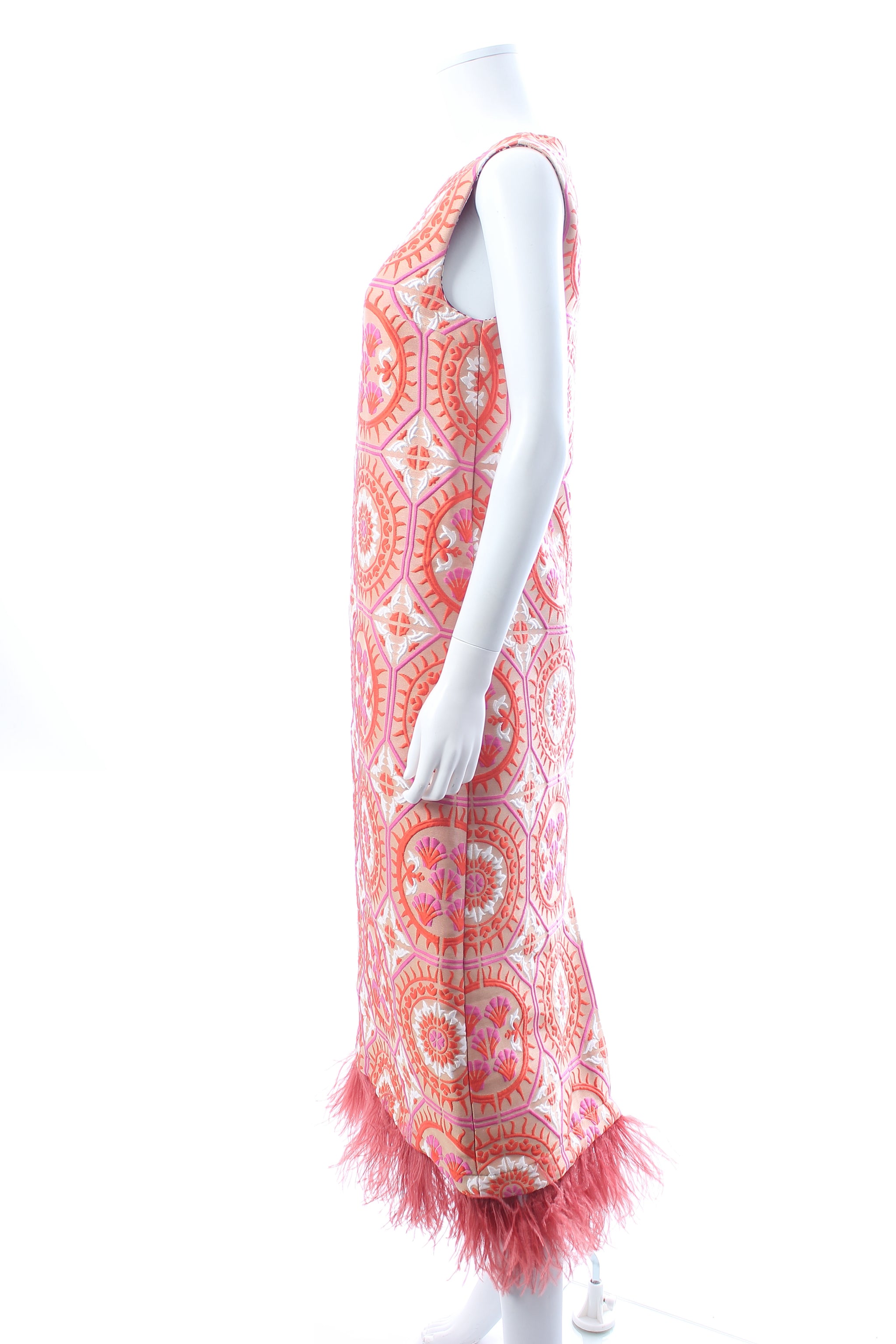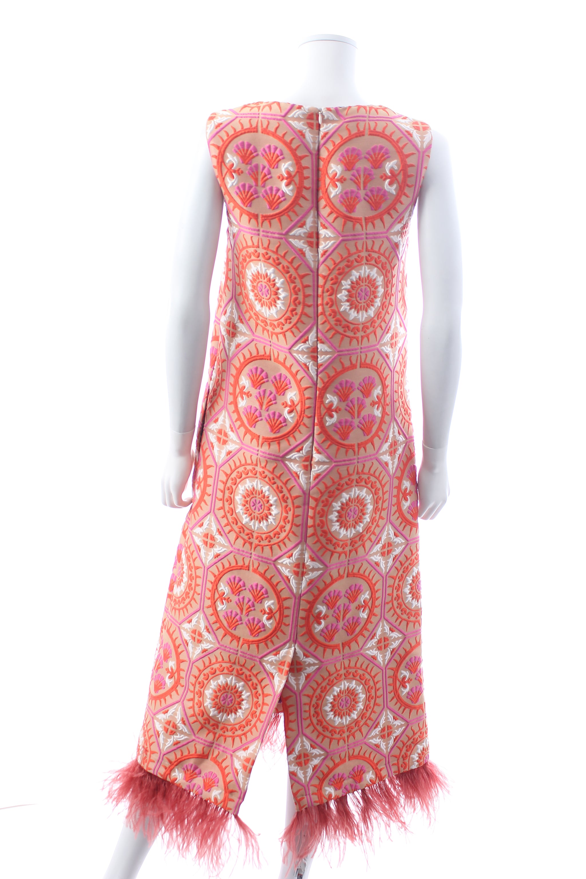 La DoubleJ Column Dress Edition 36 made from graphic patterned jacquard with ostrich feather detailing at the hem. The sleeveless dress has a round neck, a column shape, and a concealed rear zip fastening. Matching jacket available