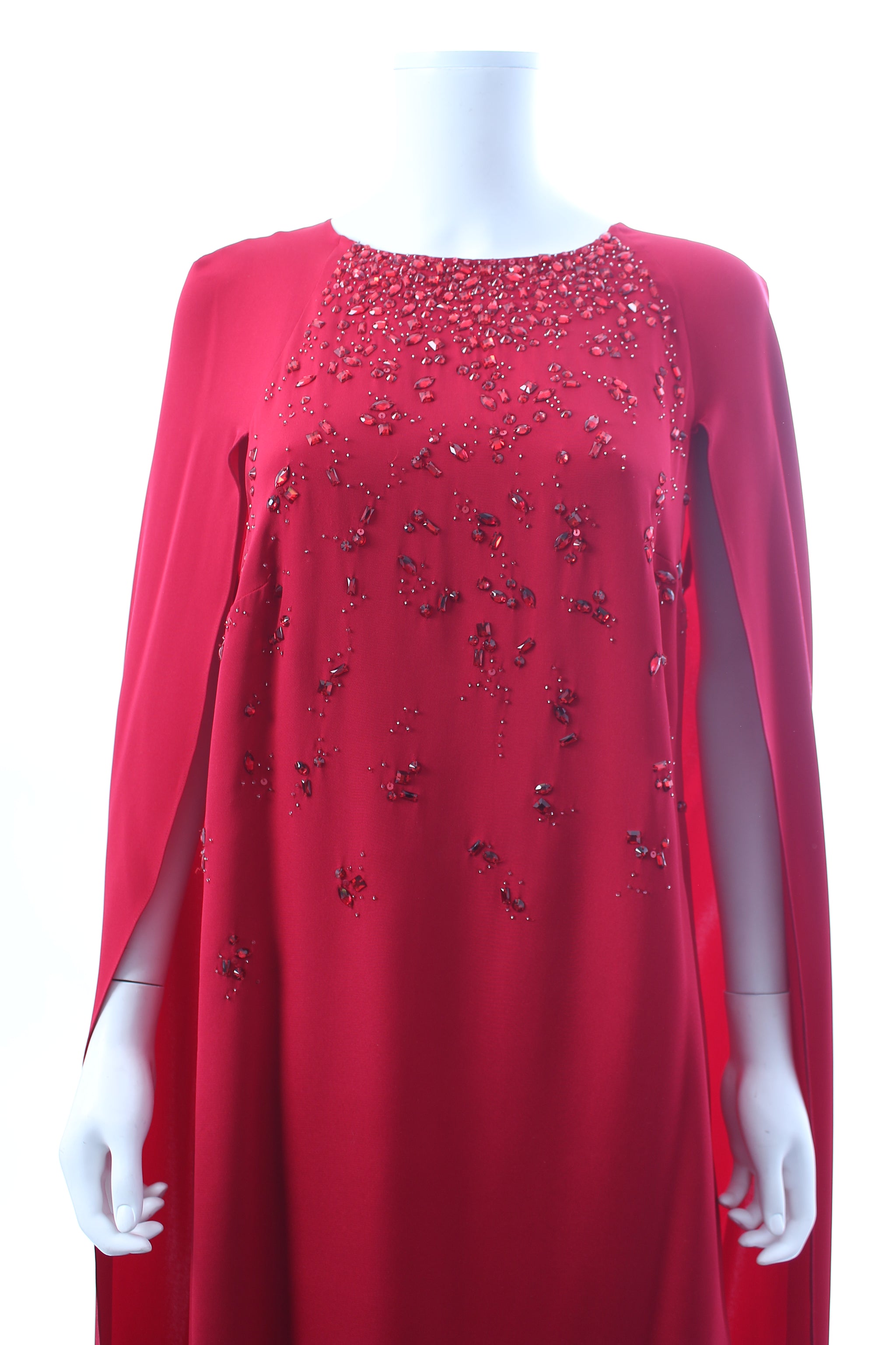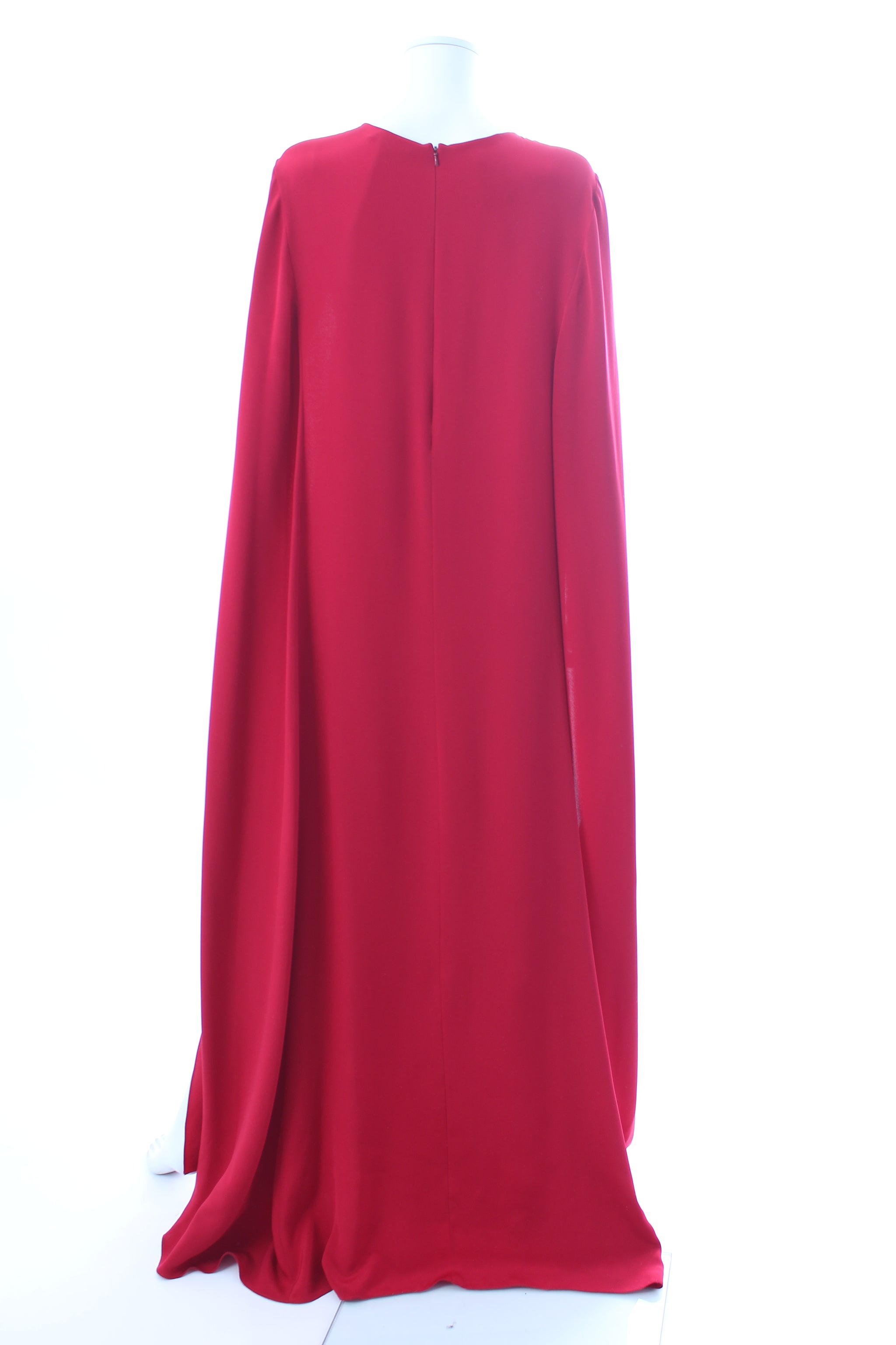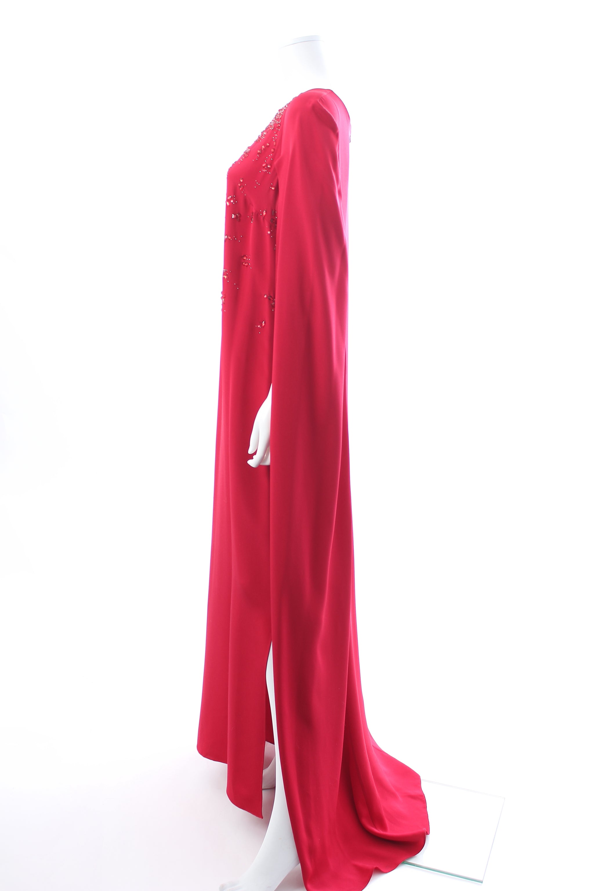 A stunning red carpet worthy gown from Oscar de la Renta. Finished with embellishments and cape style sleeves, it has a floor sweeping length and opening at the skirt. Zip fastening. Lined
