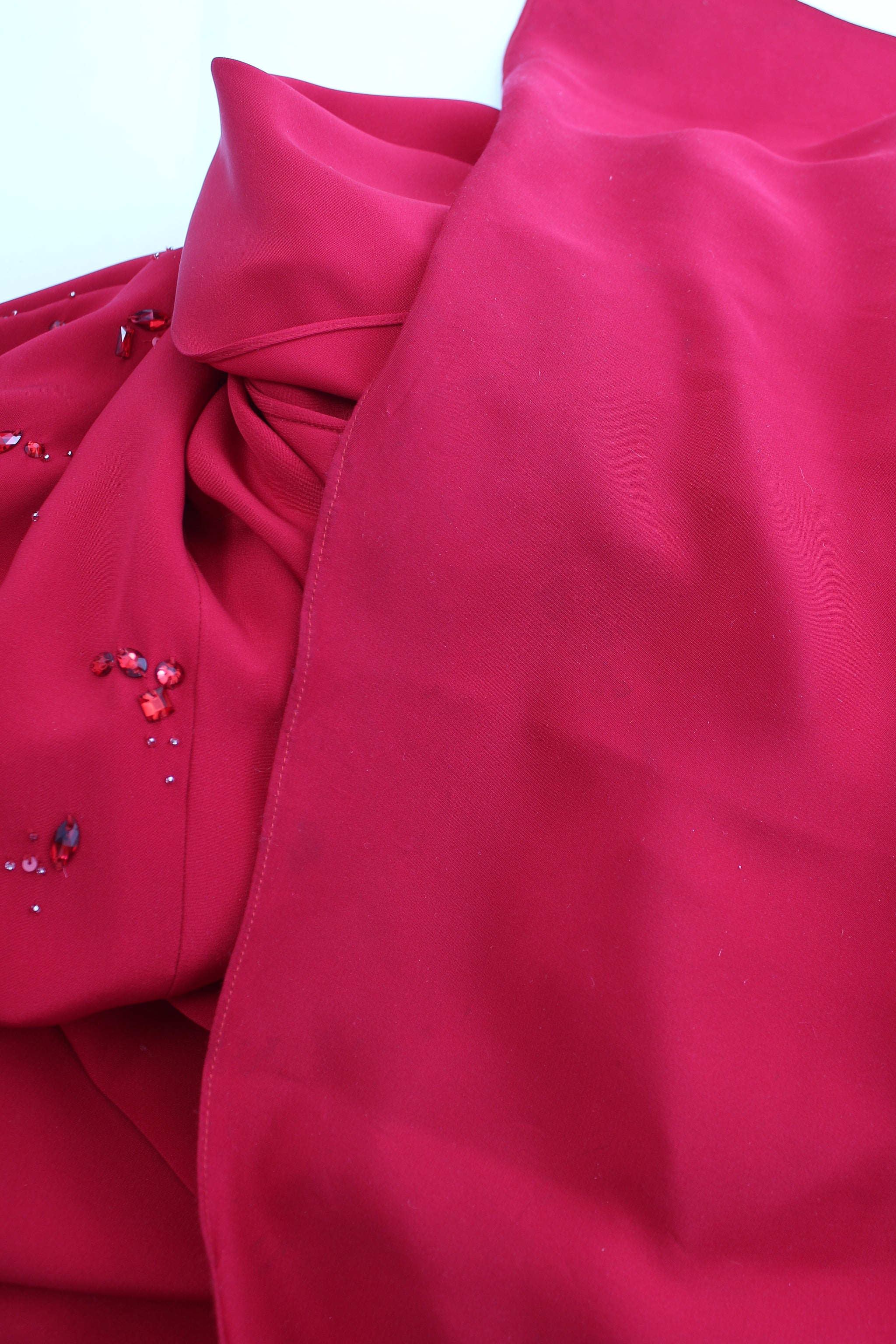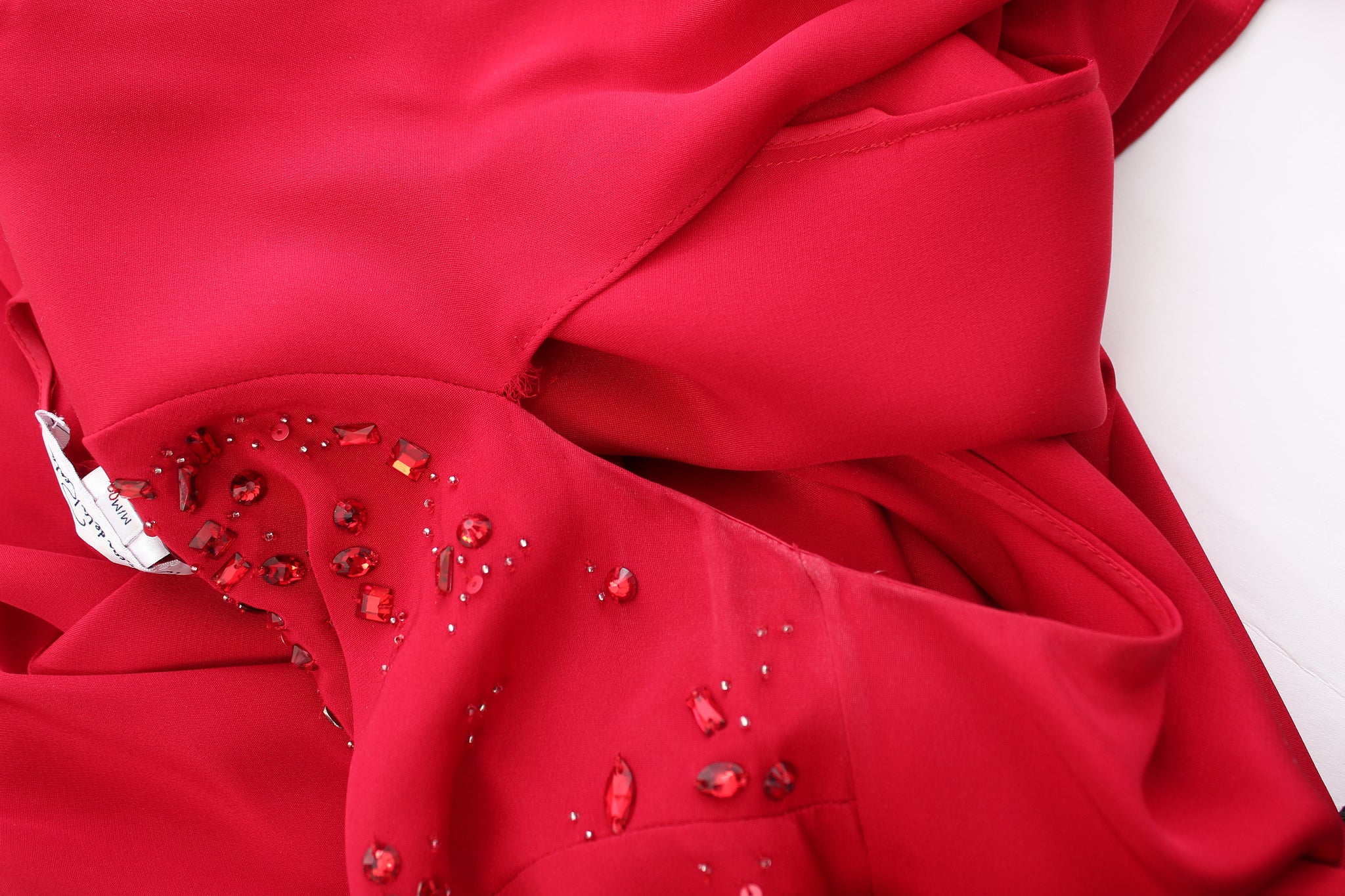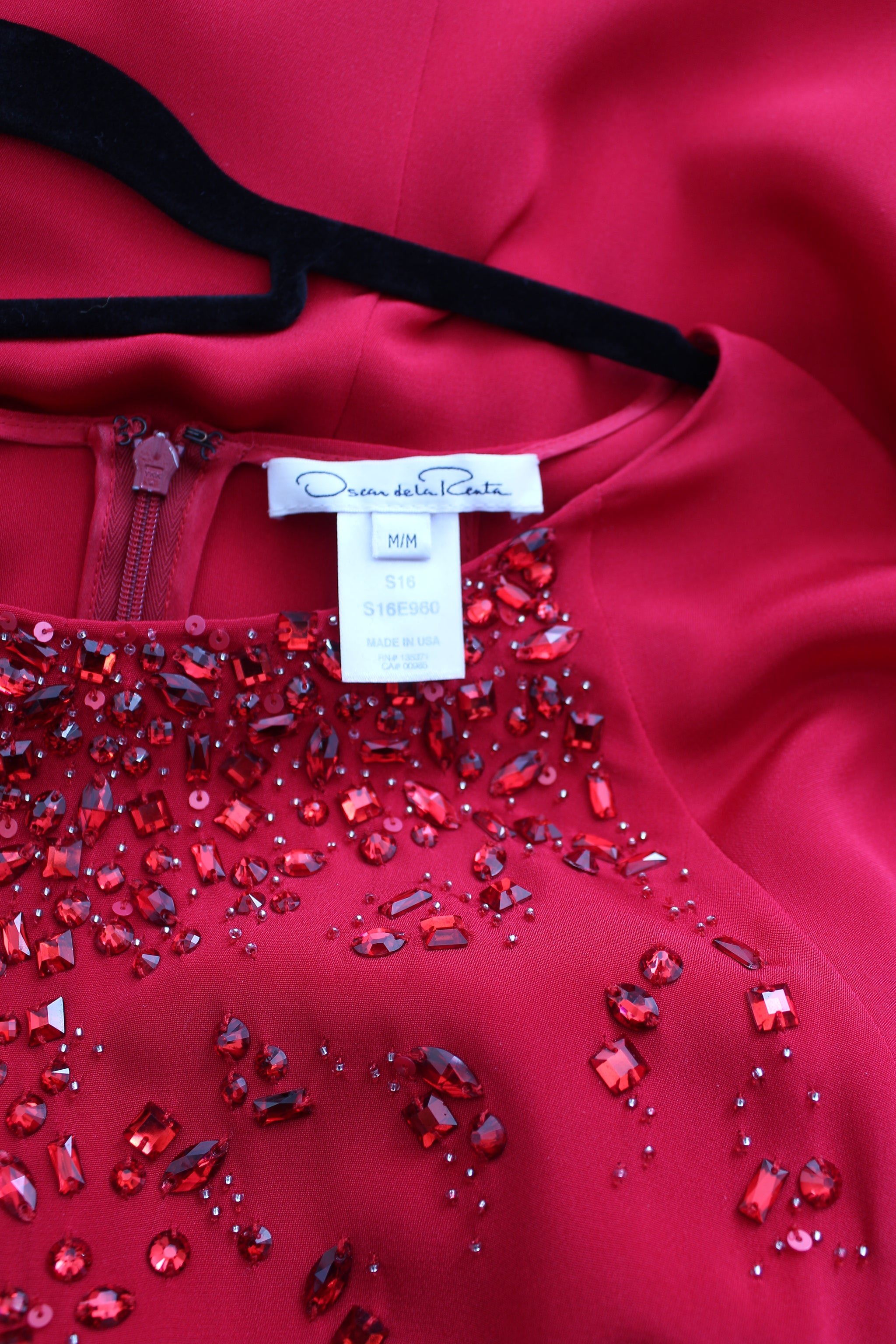 A stunning red carpet worthy gown from Oscar de la Renta. Finished with embellishments and cape style sleeves, it has a floor sweeping length and opening at the skirt. Zip fastening. Lined