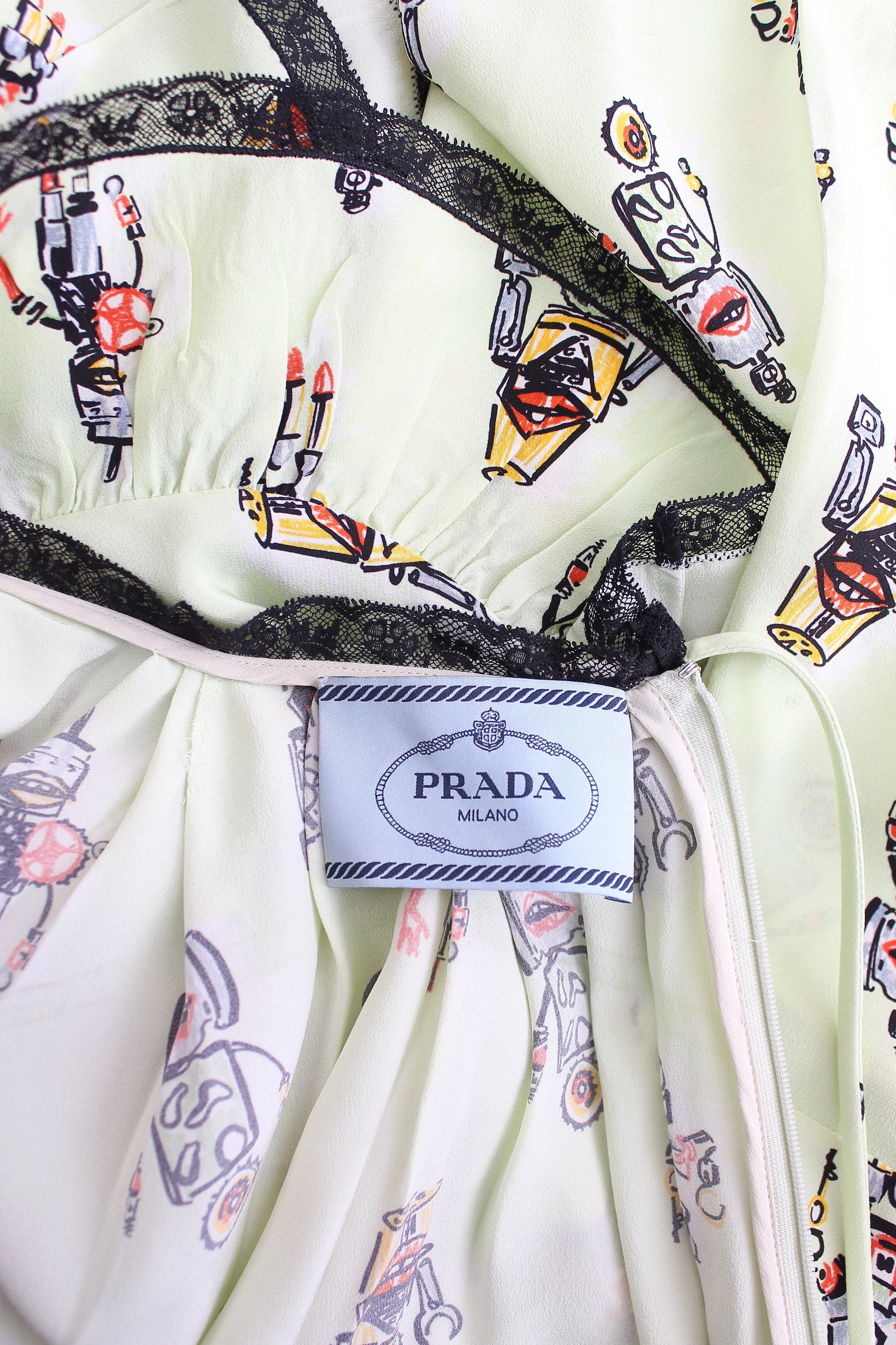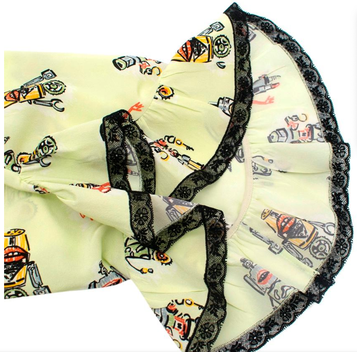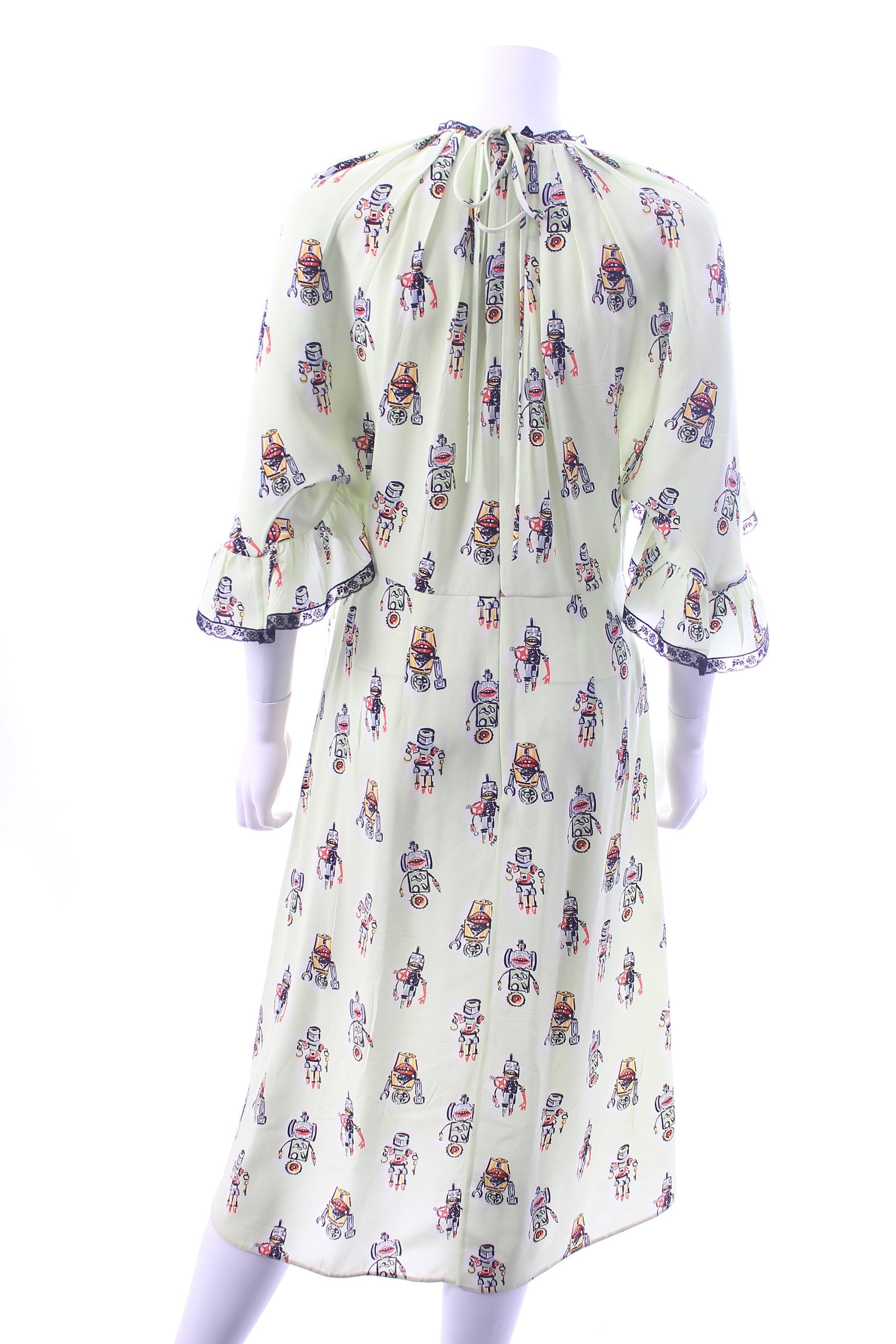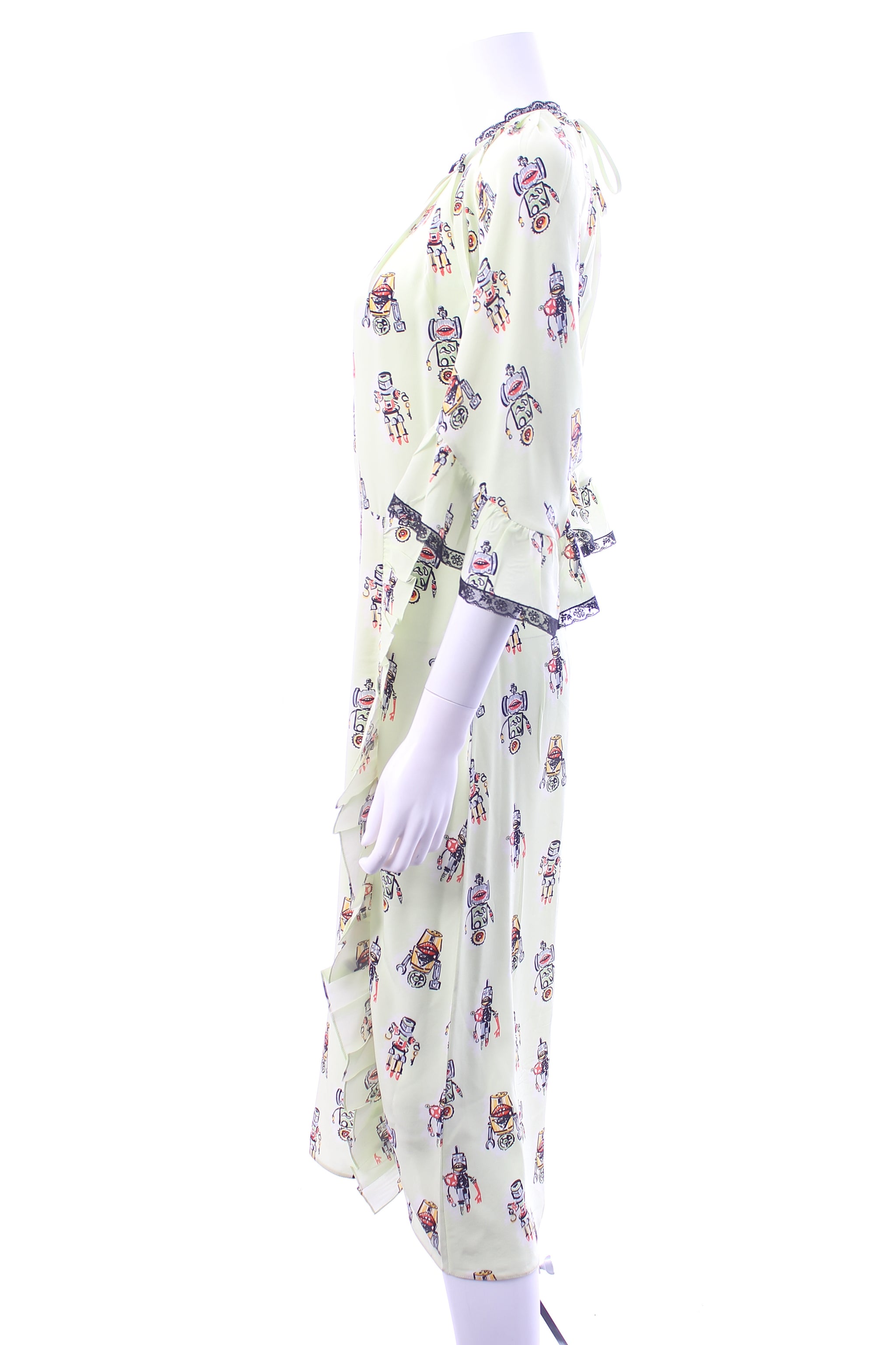 Robot printed silk midi dress with ruffle details and lace trim. Zip fastening. Note: colour is stronger in real life then mannequin photos. See close up of sleeve for indication. Fabric composition label removed