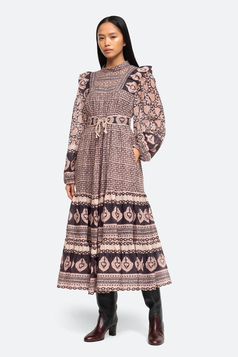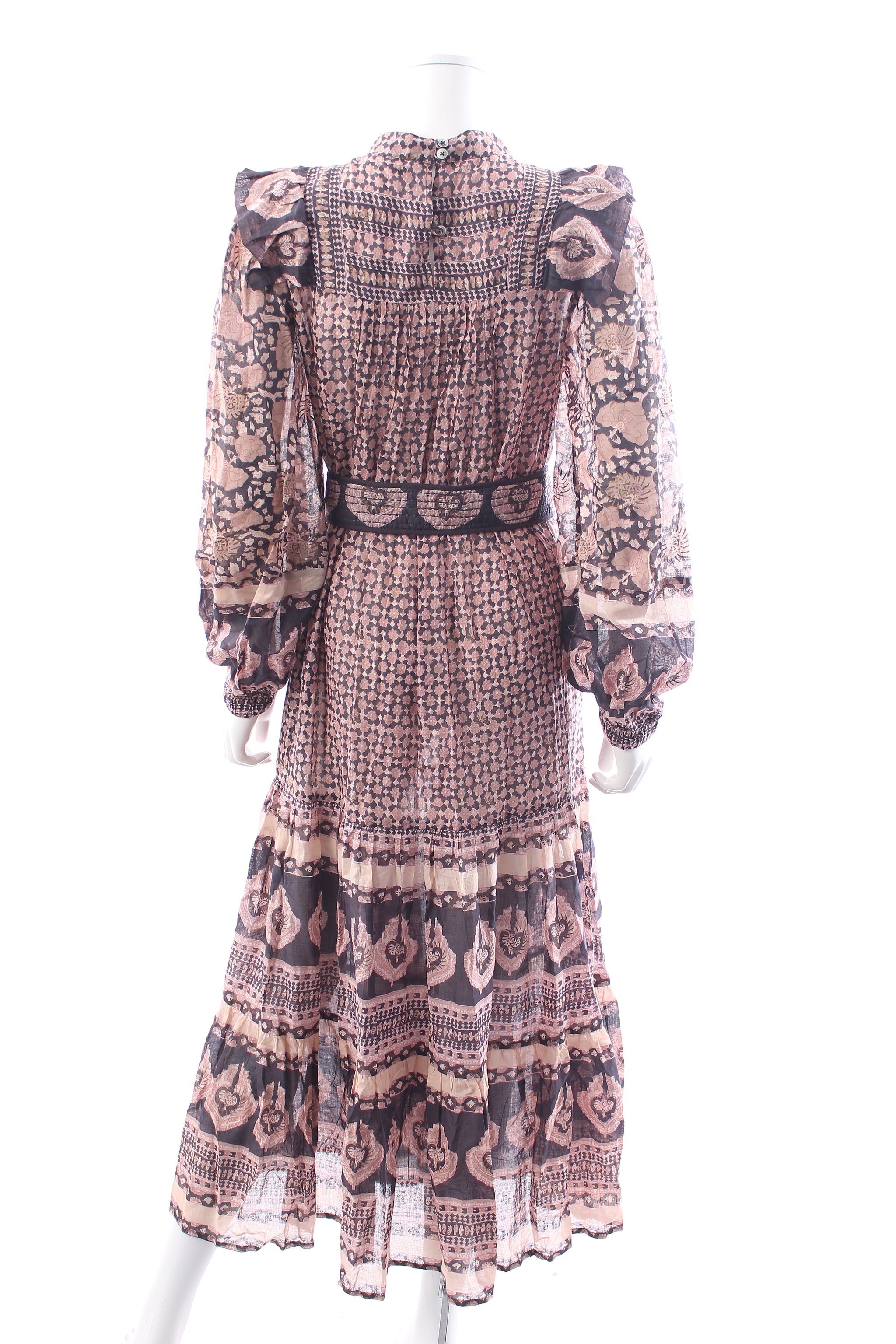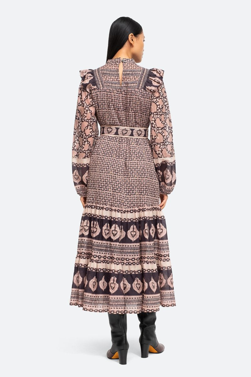 The Margo border print dress features a detachable belt, long puff sleeves with ruffle trim and is designed for a relaxed fit