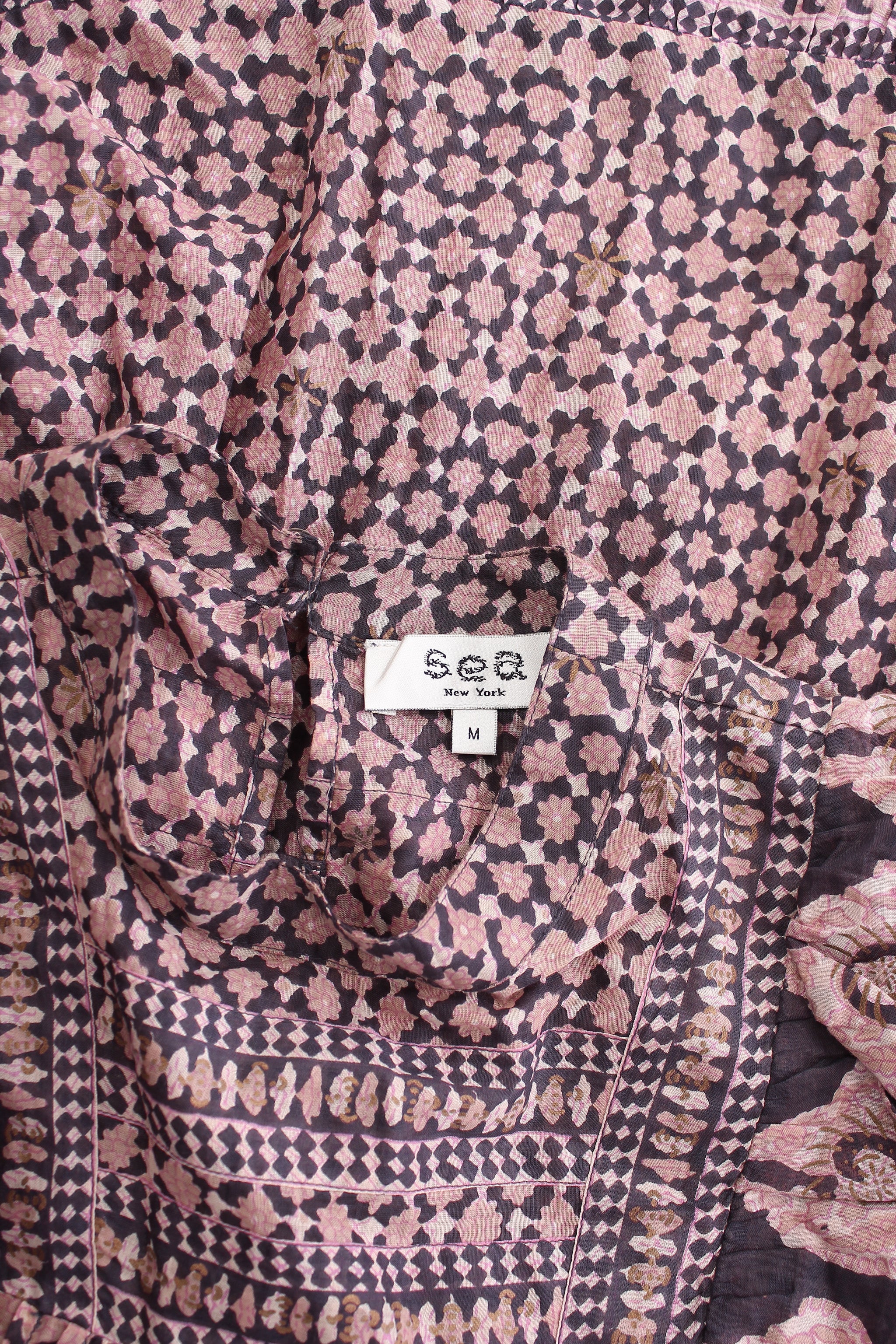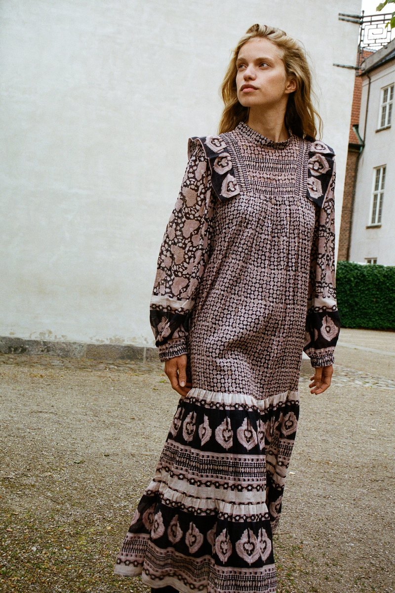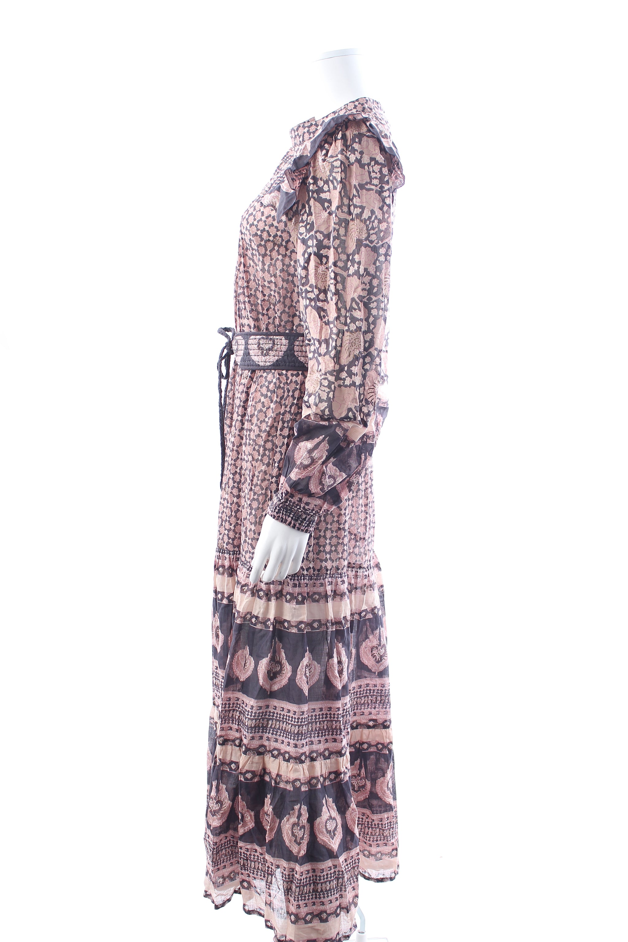 The Margo border print dress features a detachable belt, long puff sleeves with ruffle trim and is designed for a relaxed fit
