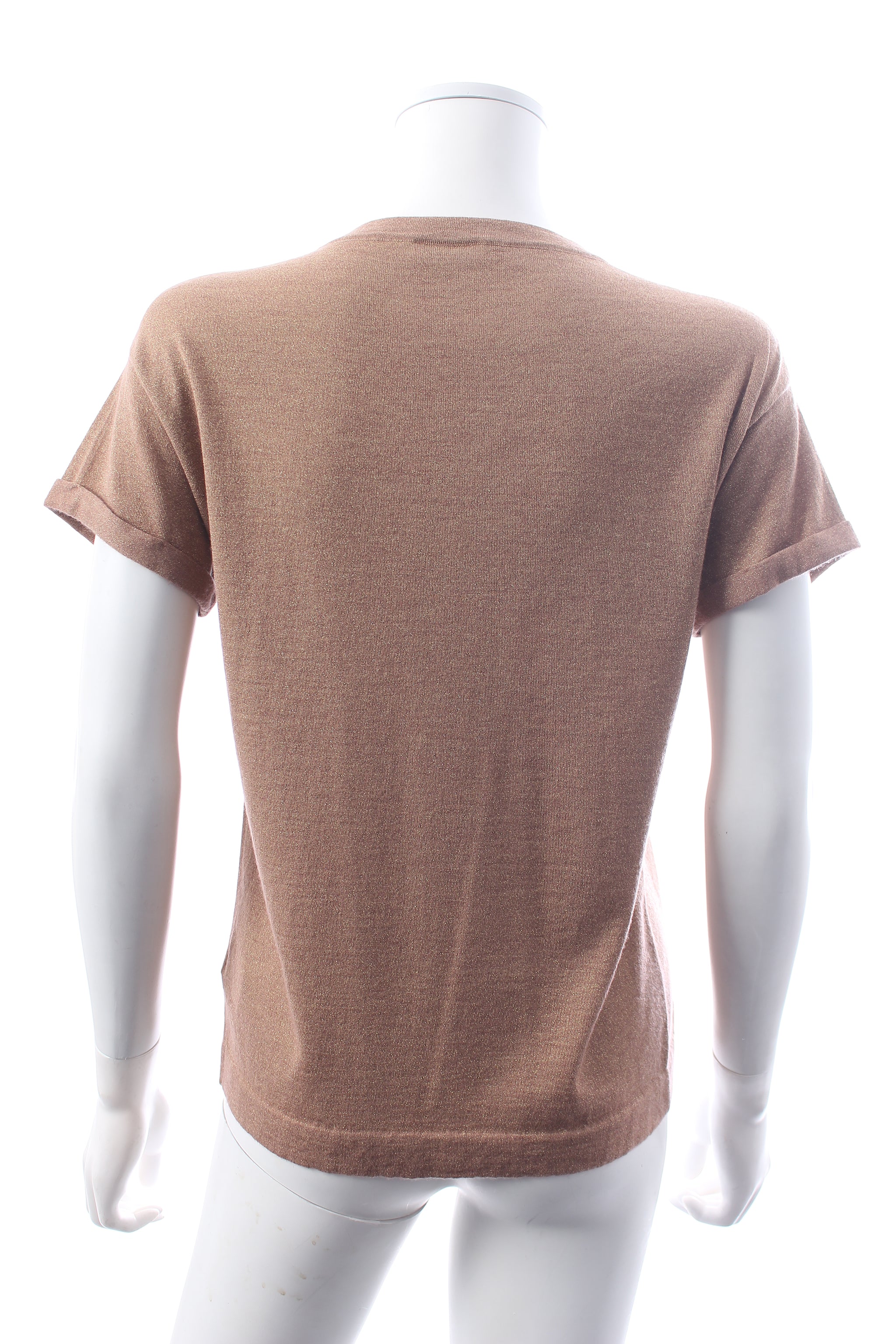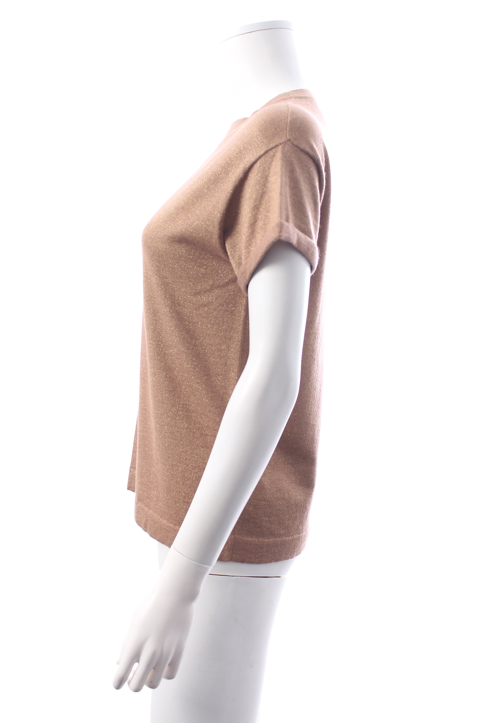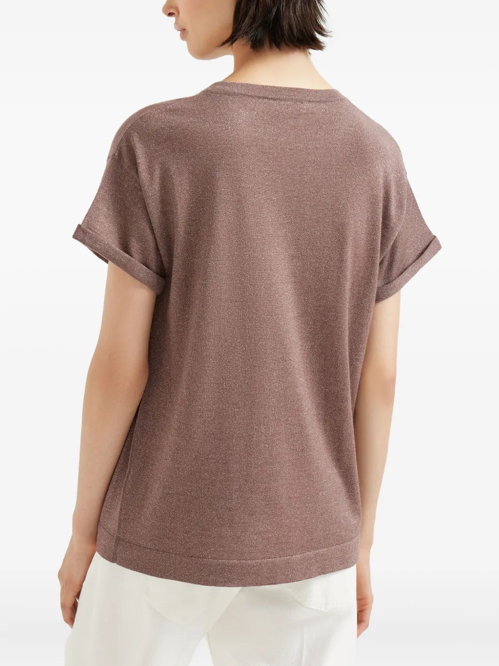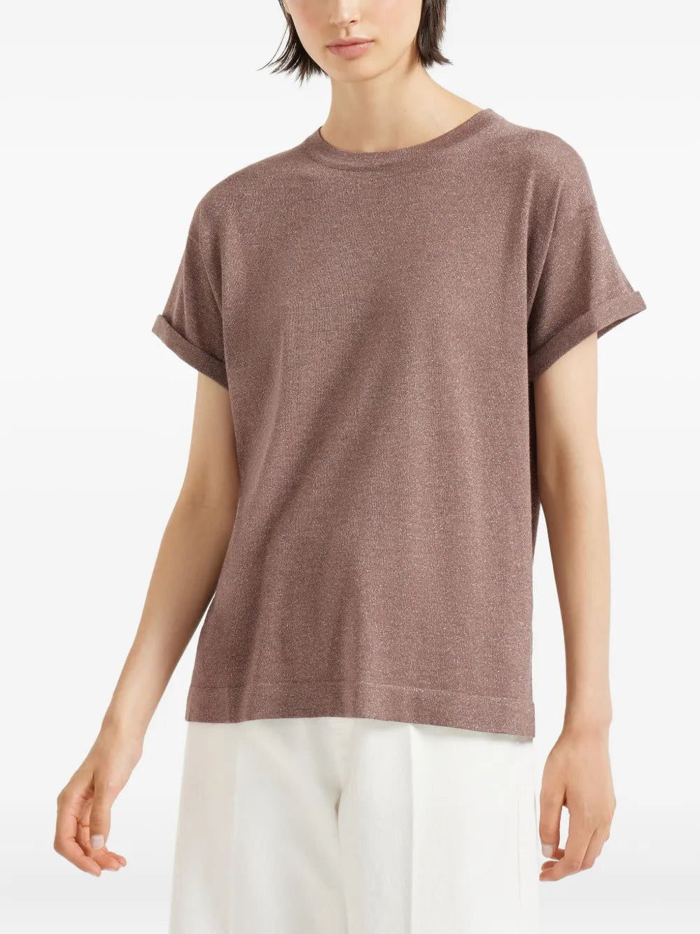 In stores now, this metallic-knit t-shirt features short turned up sleeves, round neck and straight hem