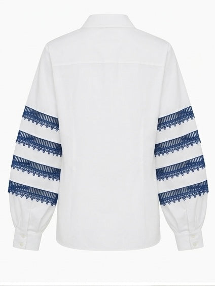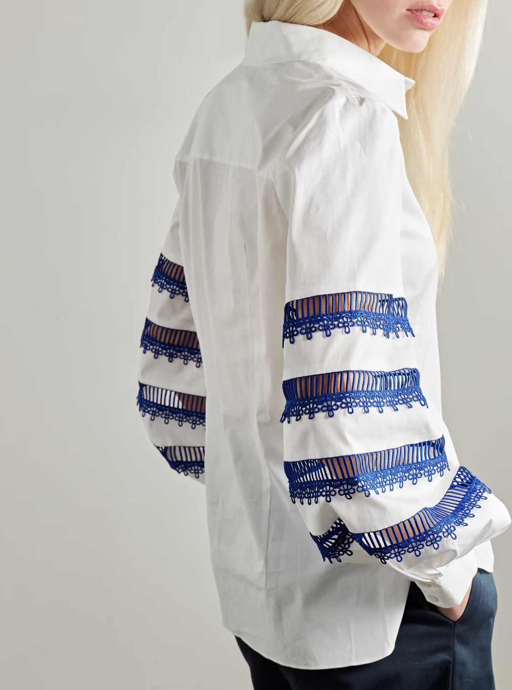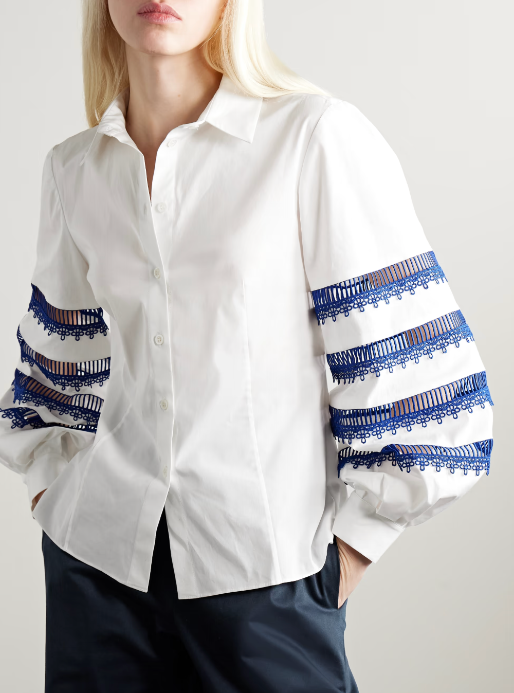 Carolina Herrera's shirt is part of the 'Cabana' collection, which is designed for warm days in the sun. It's made from cotton-blend poplin and has guipure lace trims along the blouson sleeves. Undo a few top buttons to your liking
