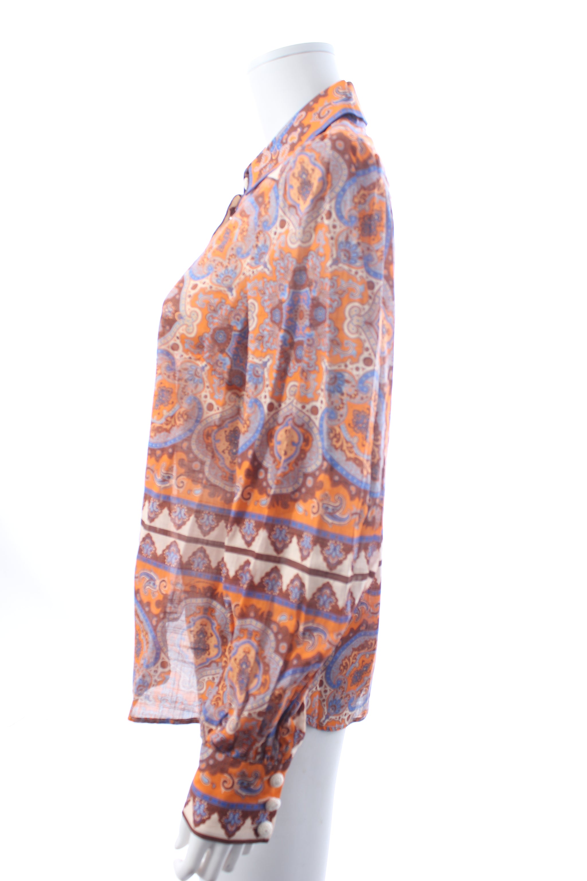 Paisley printed shirt in cotton-gauze fabric with gathered sleeves, buttoned cuffs and button fastenings through front