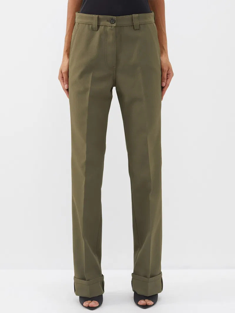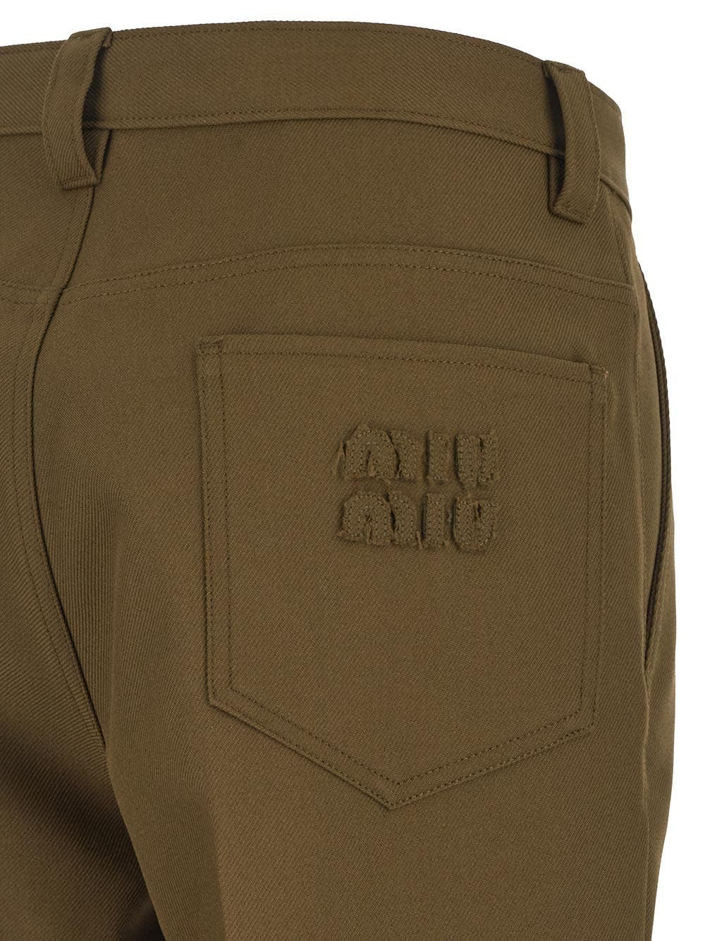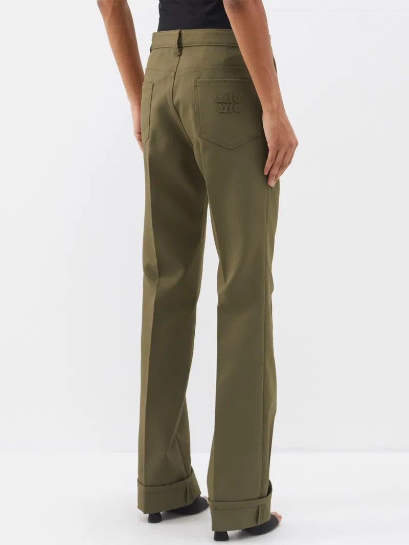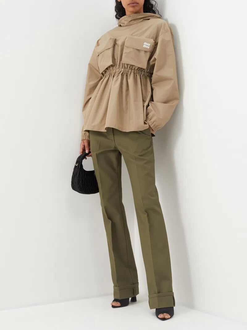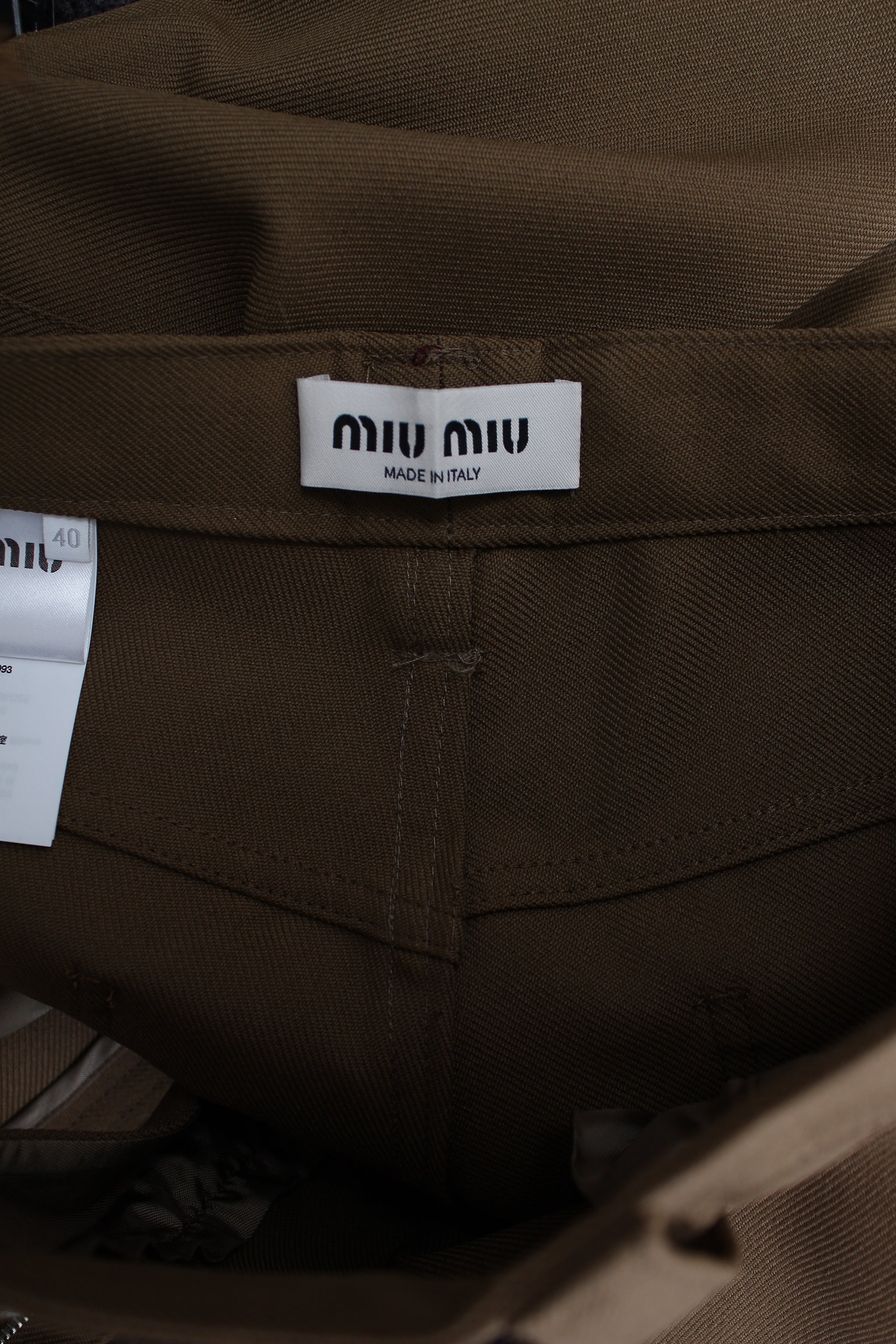 Miu Miu takes a low-key approach to tailoring codes with these khaki-brown trousers, cut from recycled fibres and accented with an appliquéd logo at the pocket