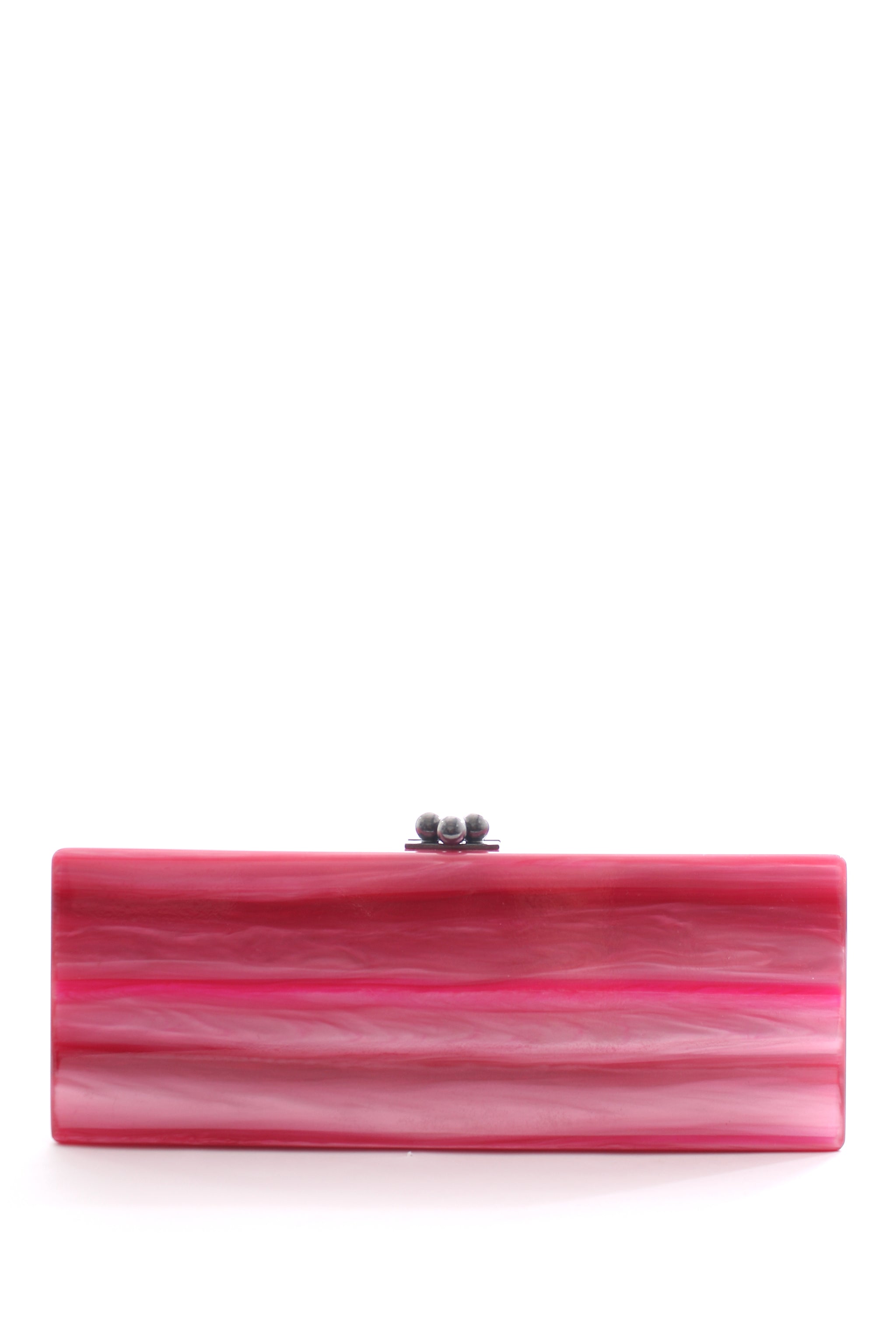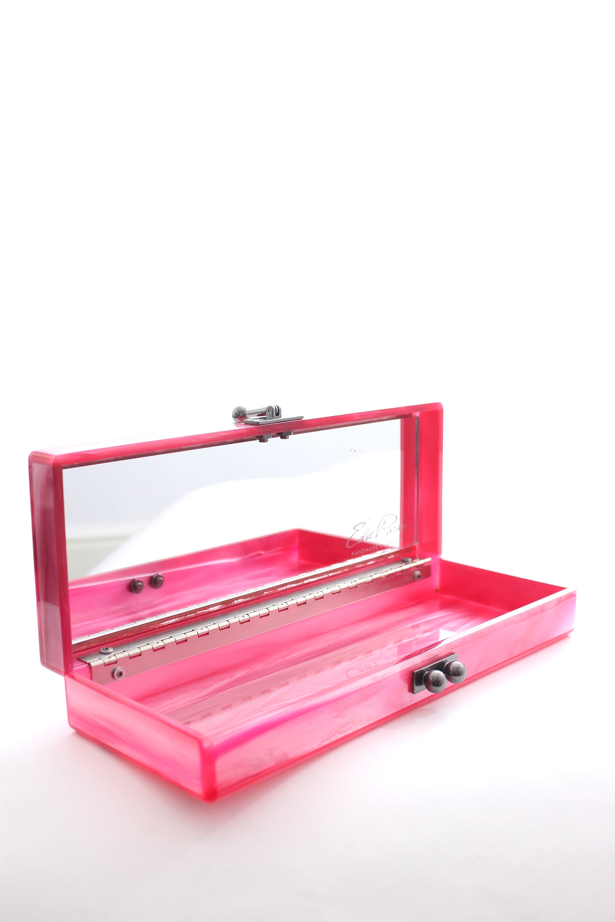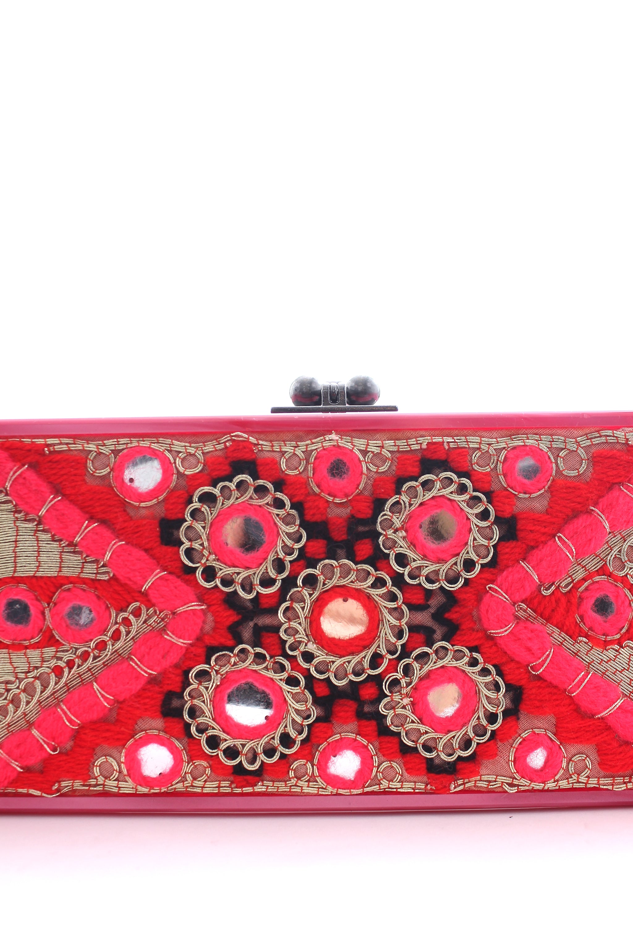 Acrylic box clutch bag in a sleek rectangular shape with textile embellishments. Opens to a mirrored interior. Measures: 25.5 cm W x 9.5 cm H x 5 cm D