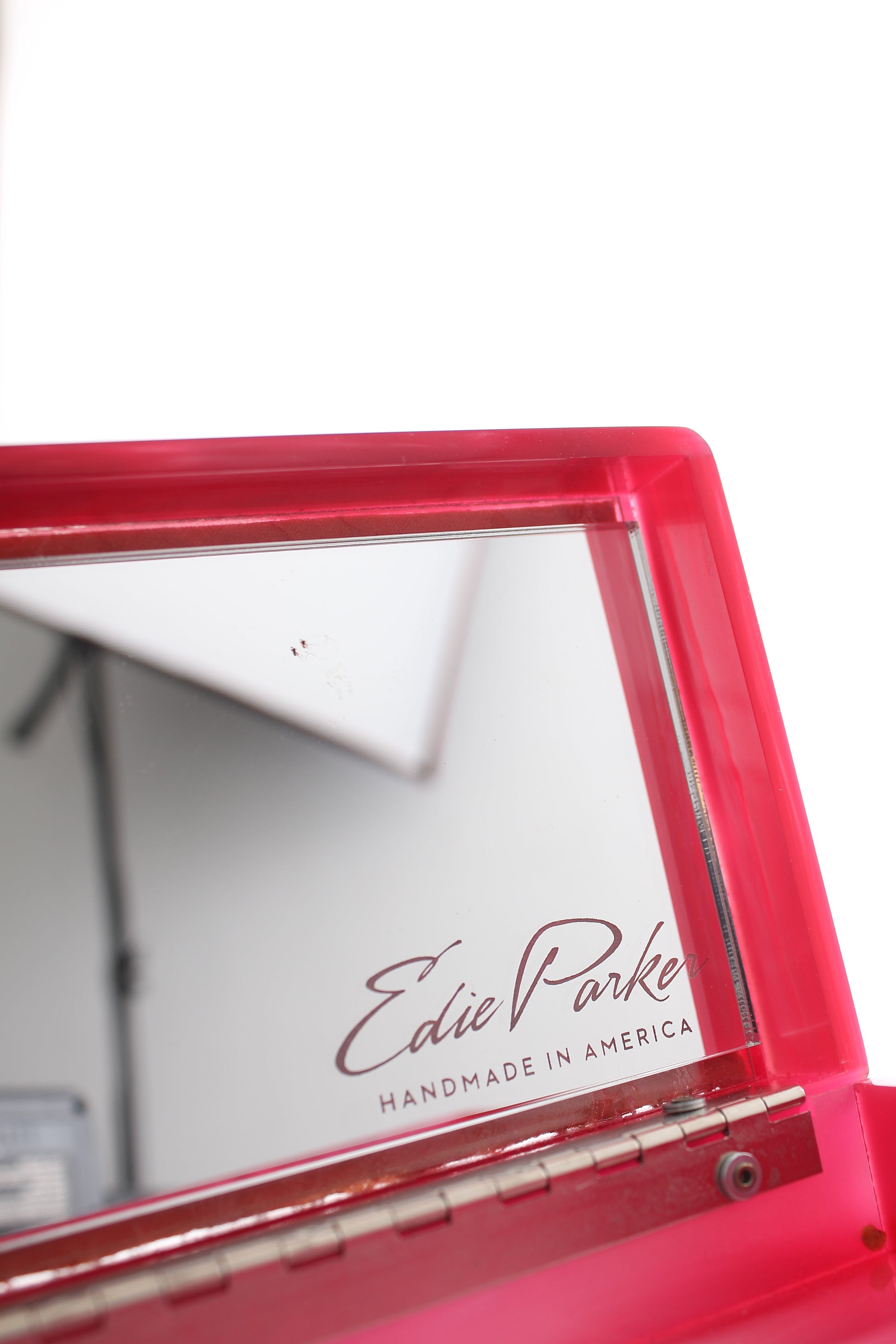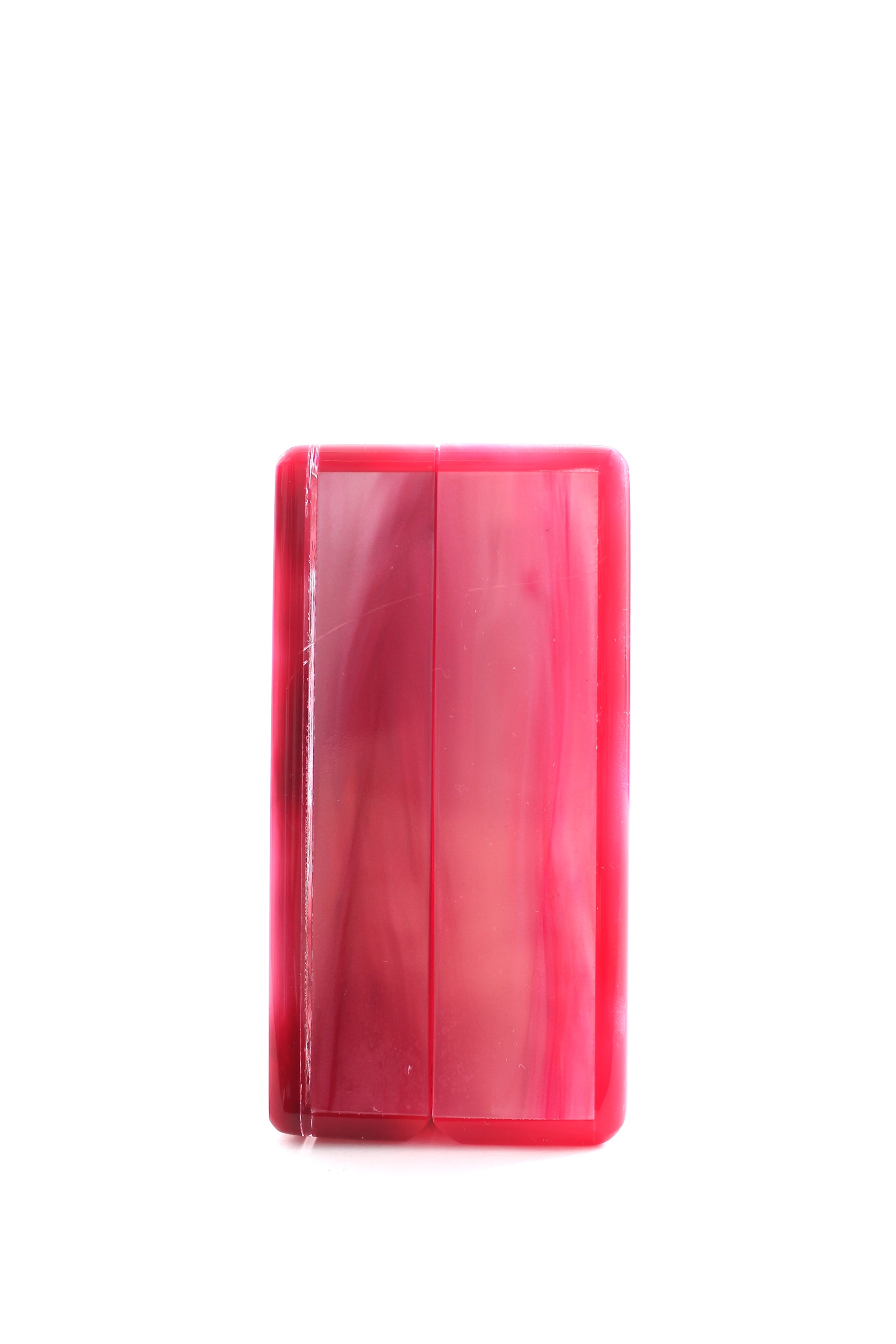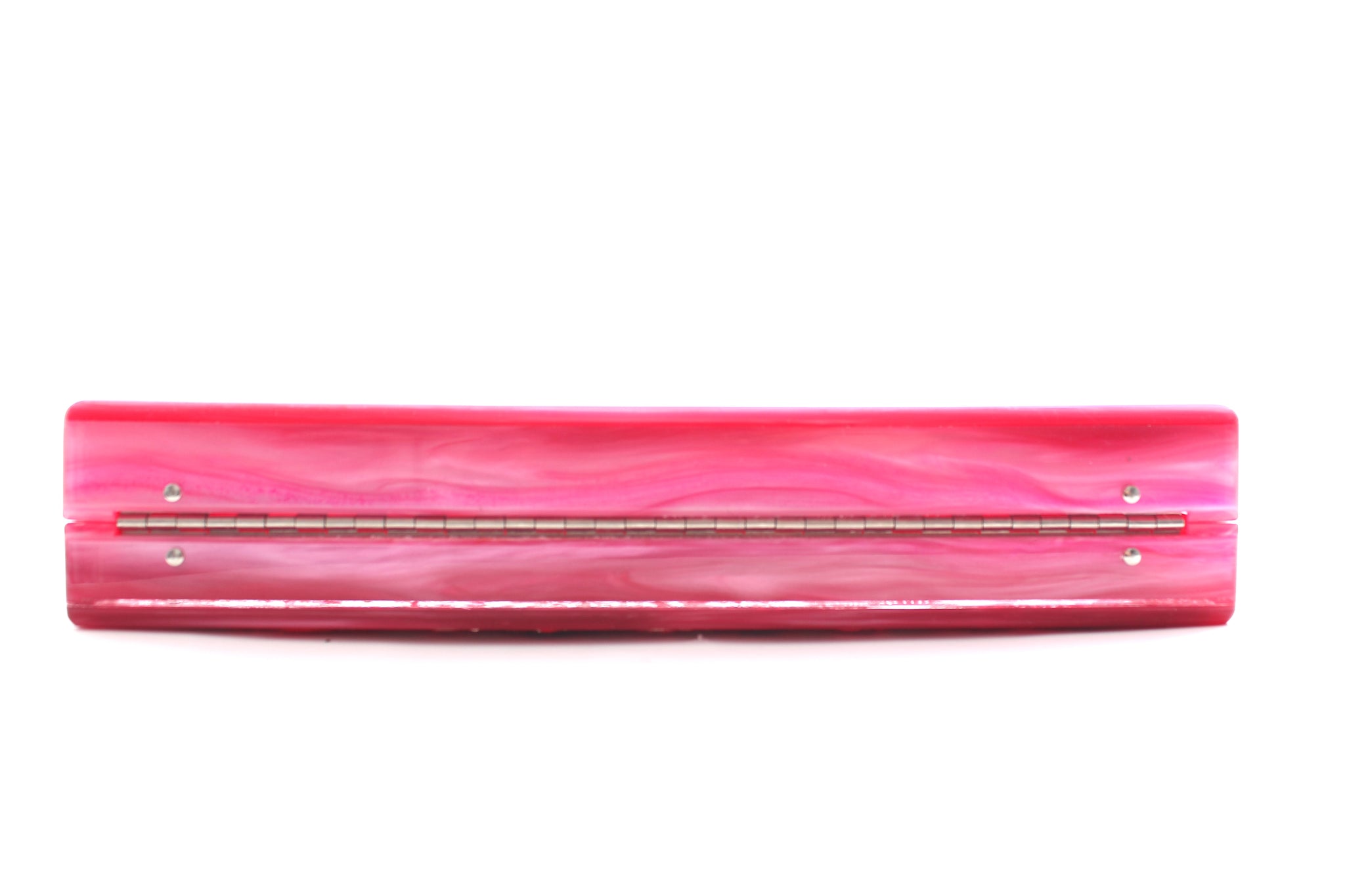 Acrylic box clutch bag in a sleek rectangular shape with textile embellishments. Opens to a mirrored interior. Measures: 25.5 cm W x 9.5 cm H x 5 cm D