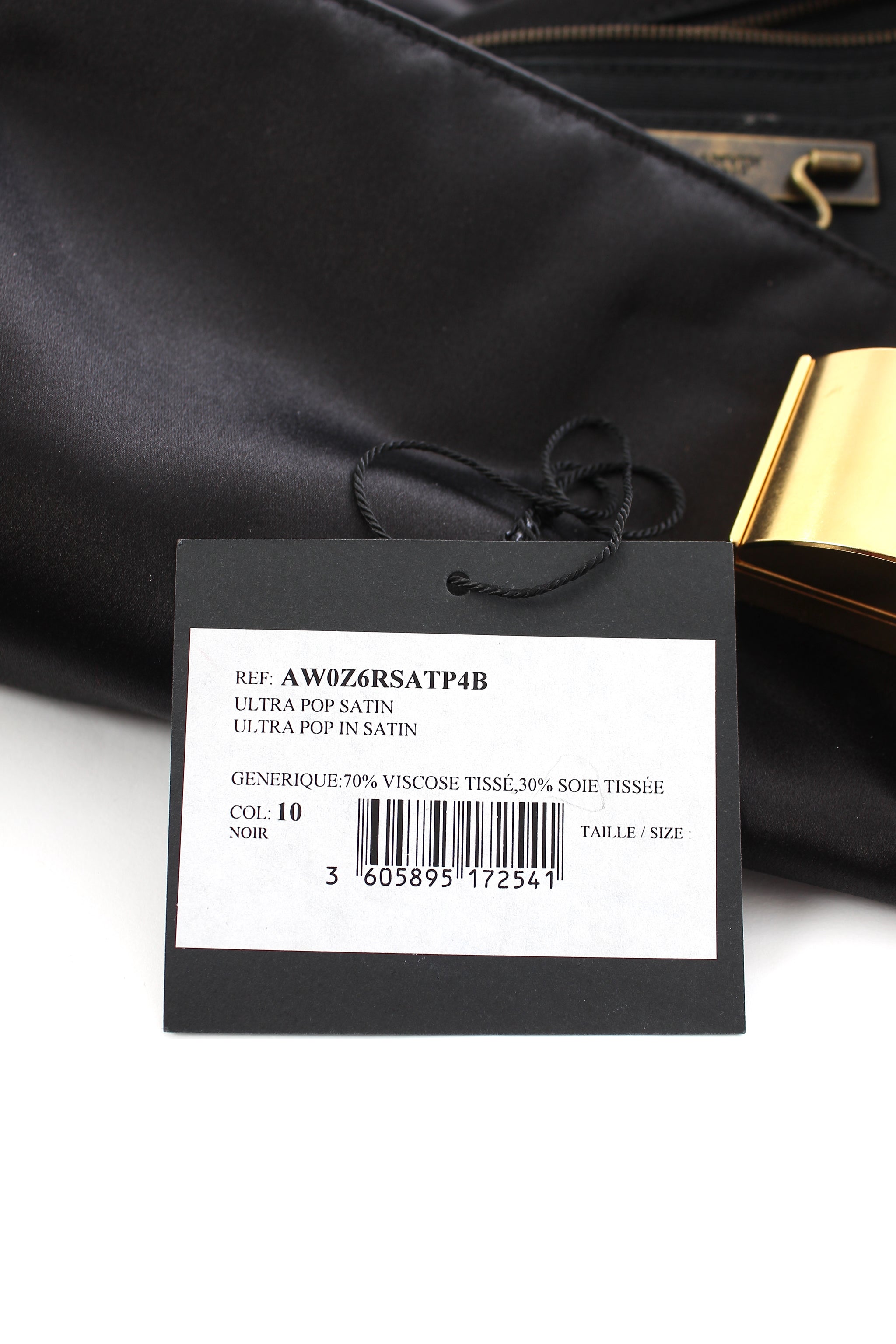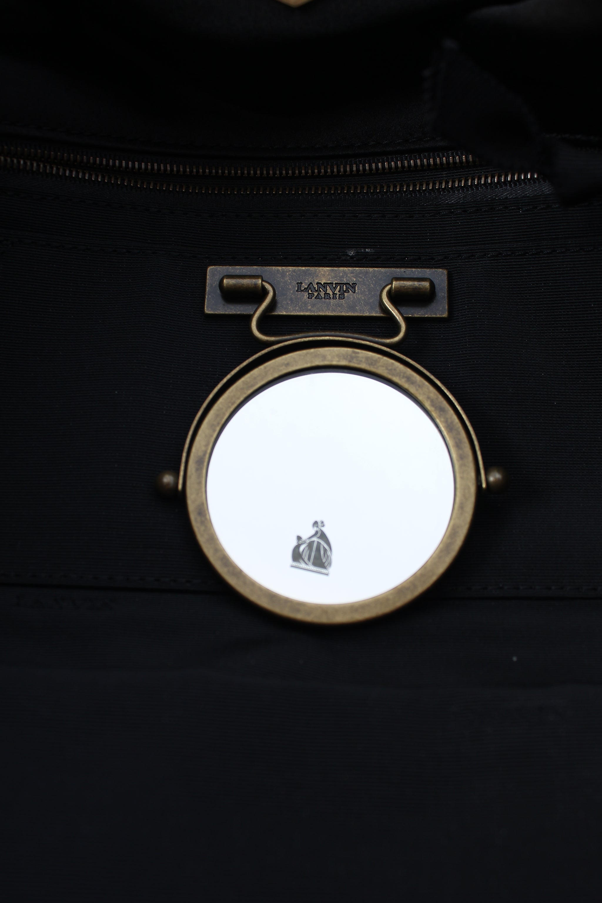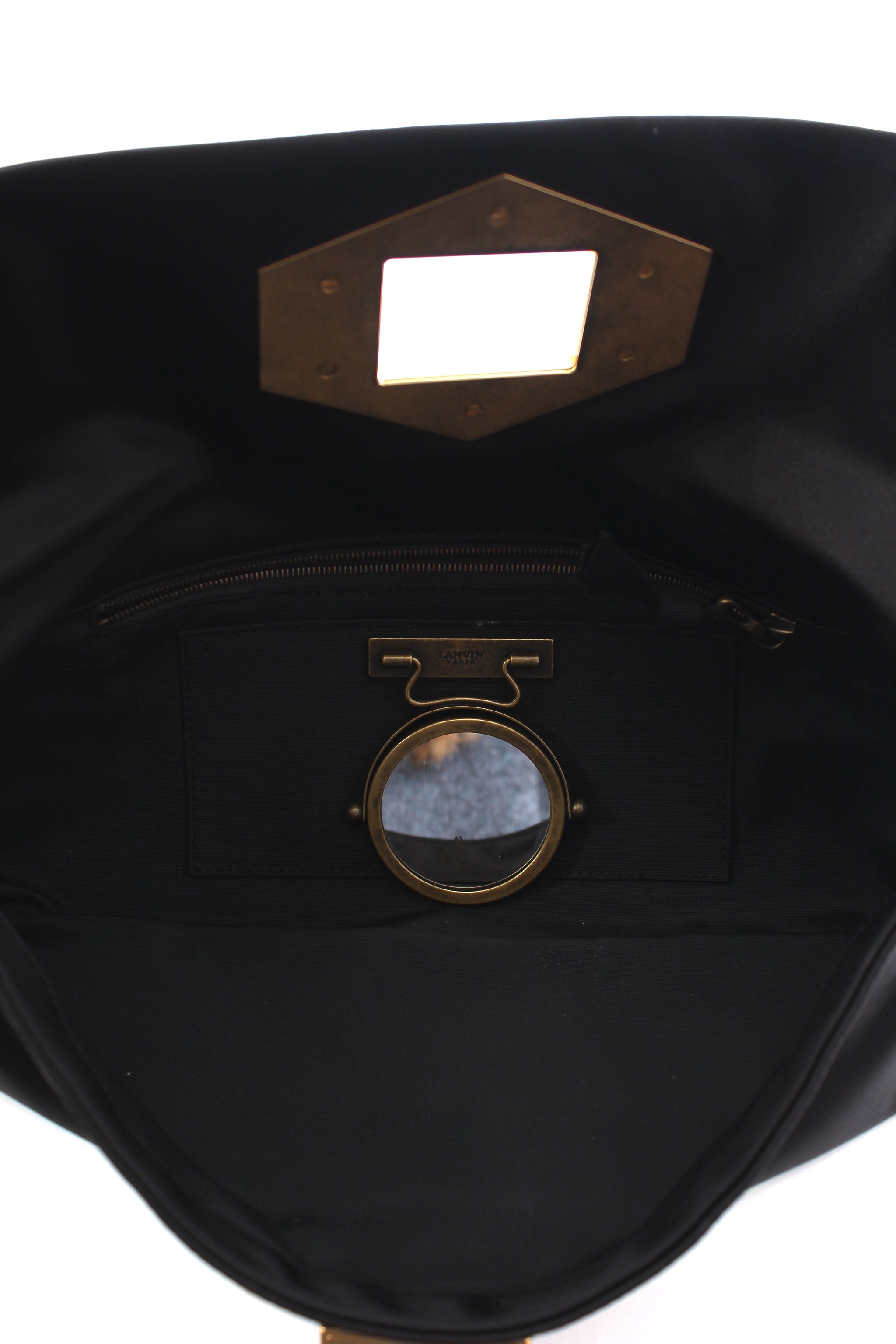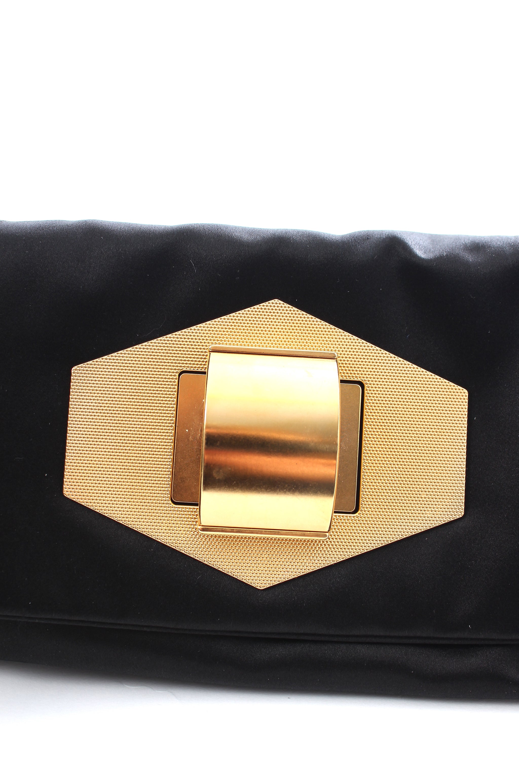 Lanvin satin evening clutch bag with foldover design and statement gold-tone lock fastening. Vanity mirror attached inside. Zippered pocket. Dust bag not included. Measures: 14.5 inches W x 6.5 inches H