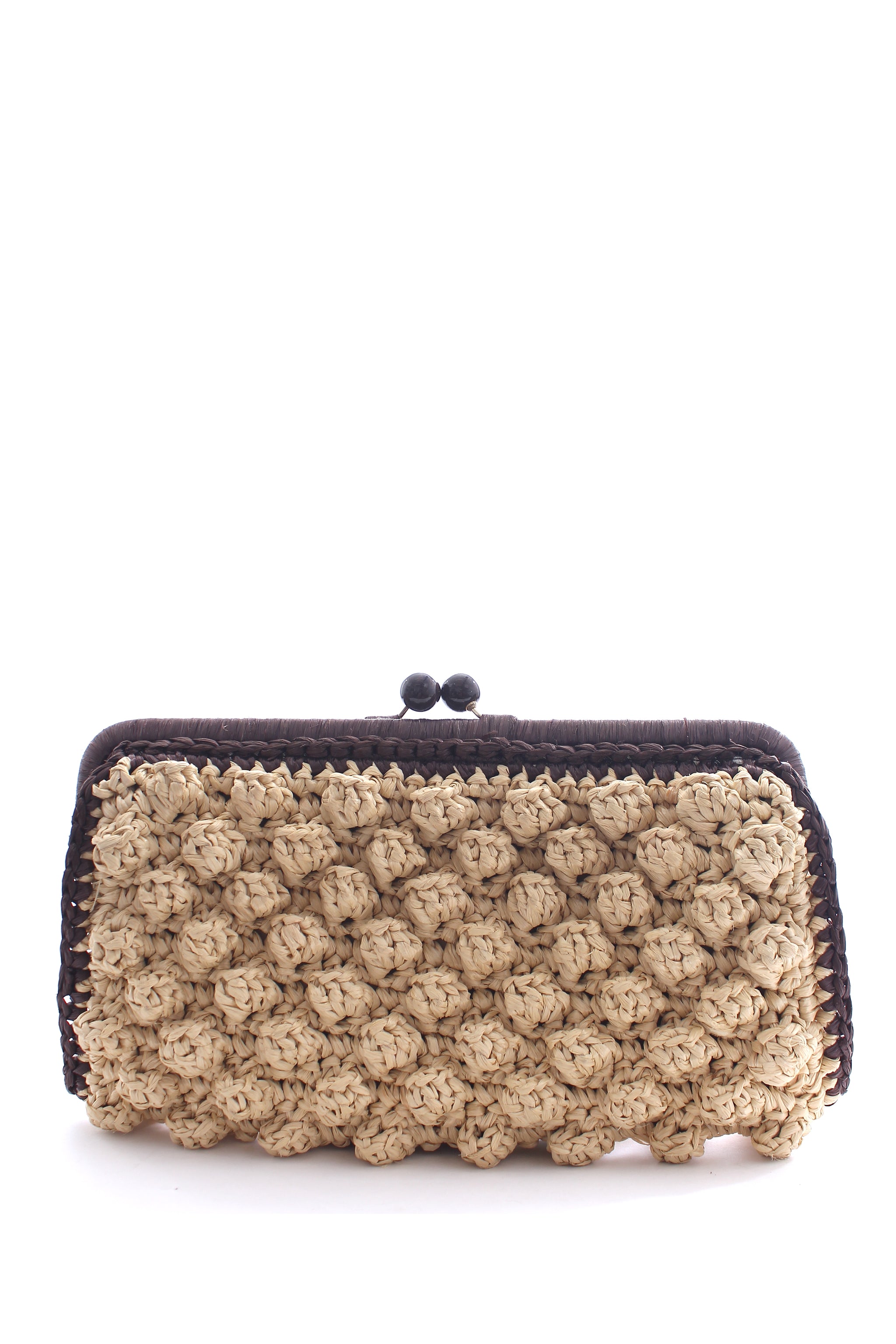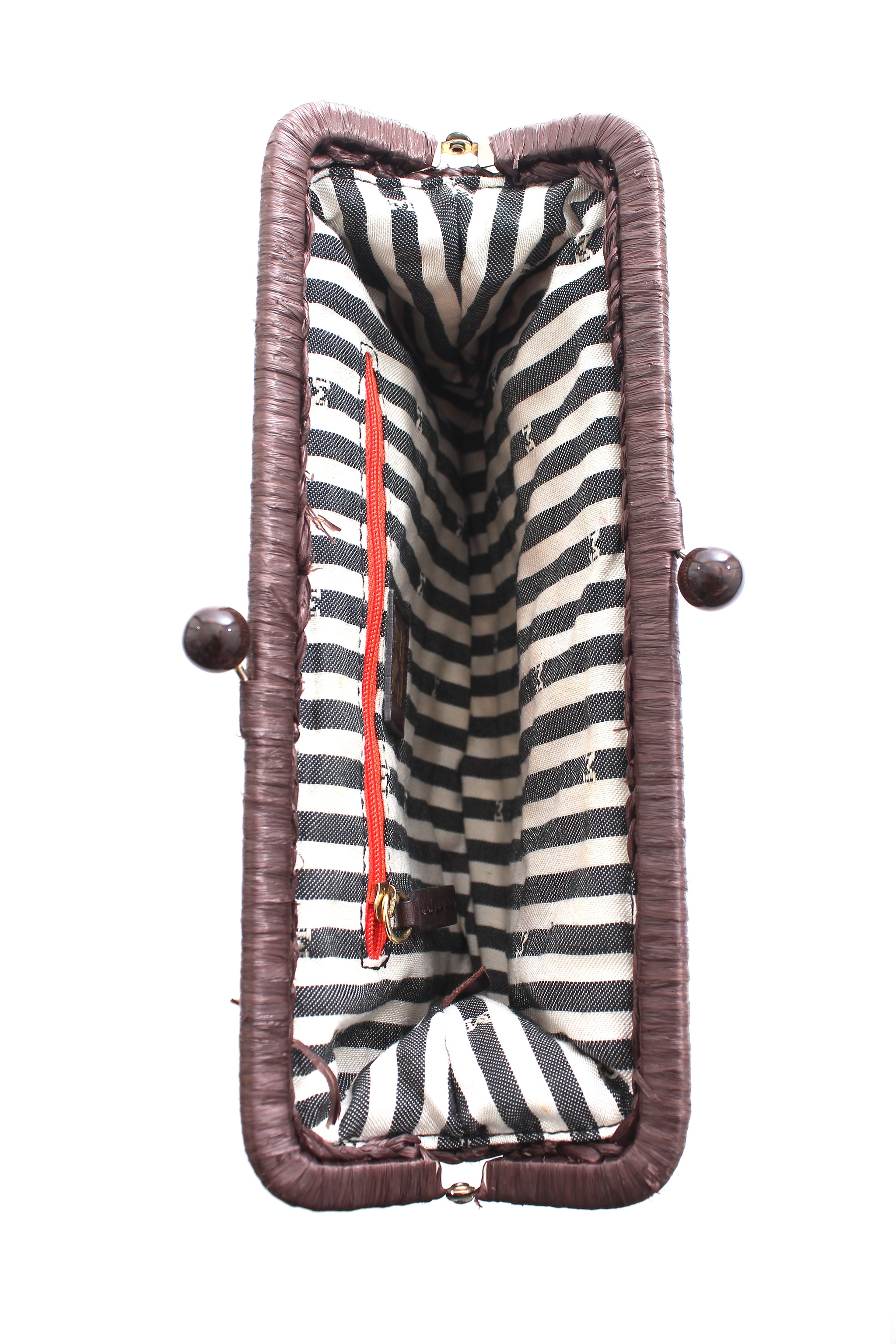 Raffia clutch bag with snap top fastening and a striped lined interior. Internal zippered pocket. Measures: 11" W x 6" H x 2" D