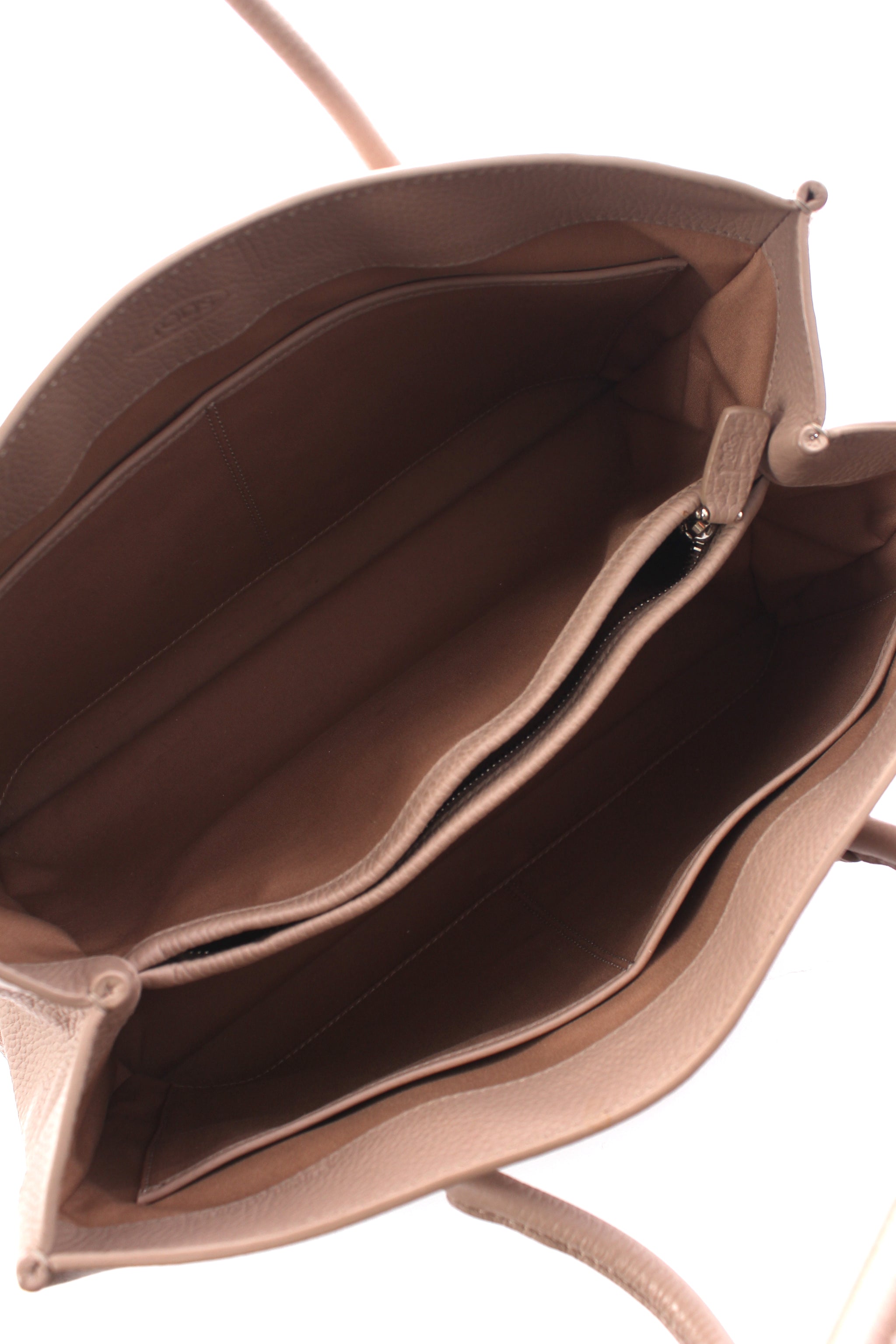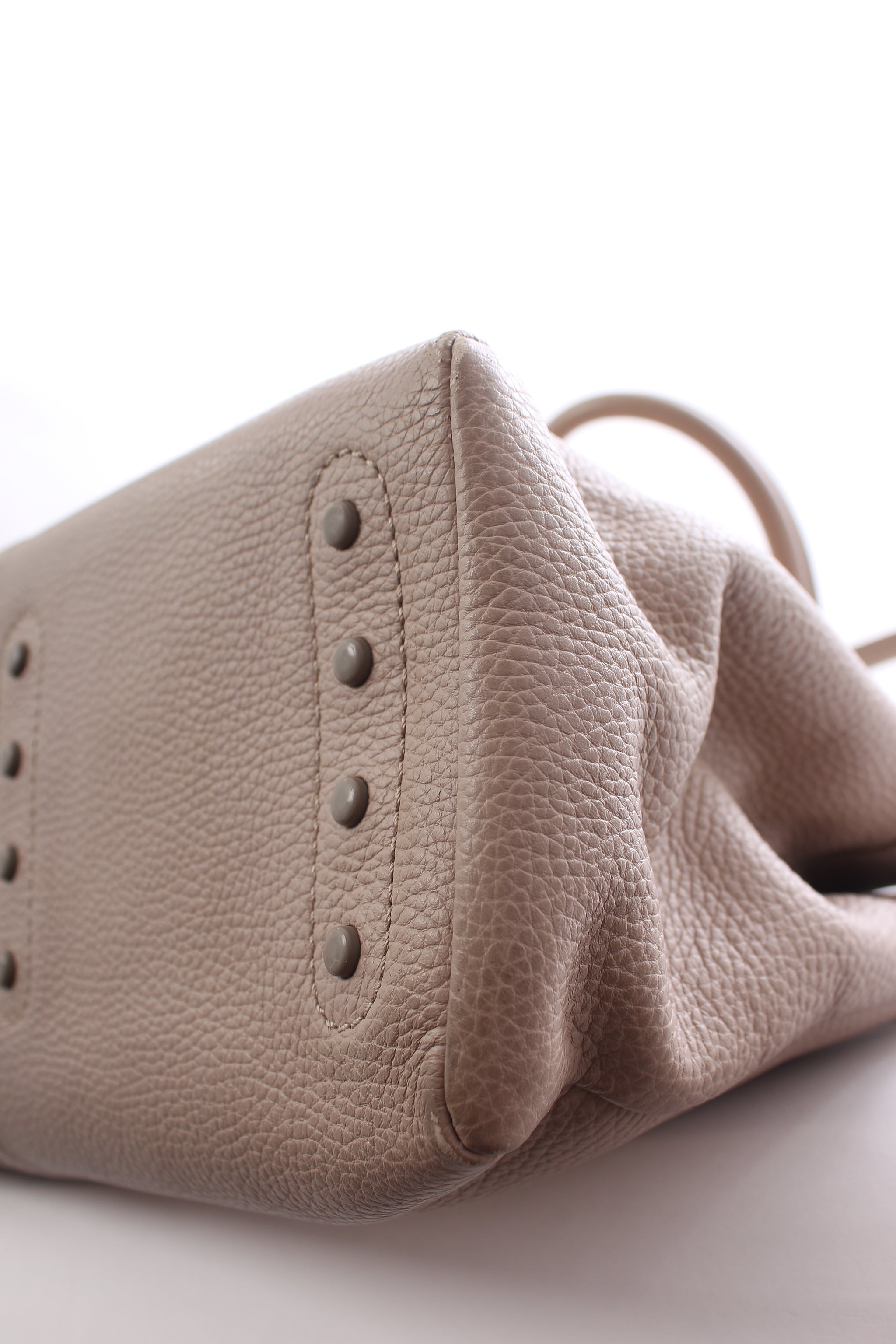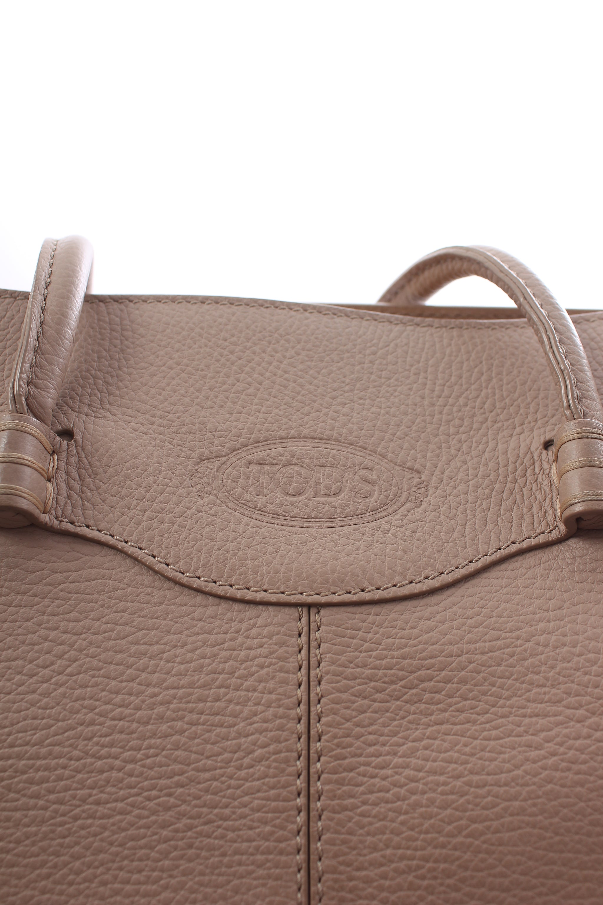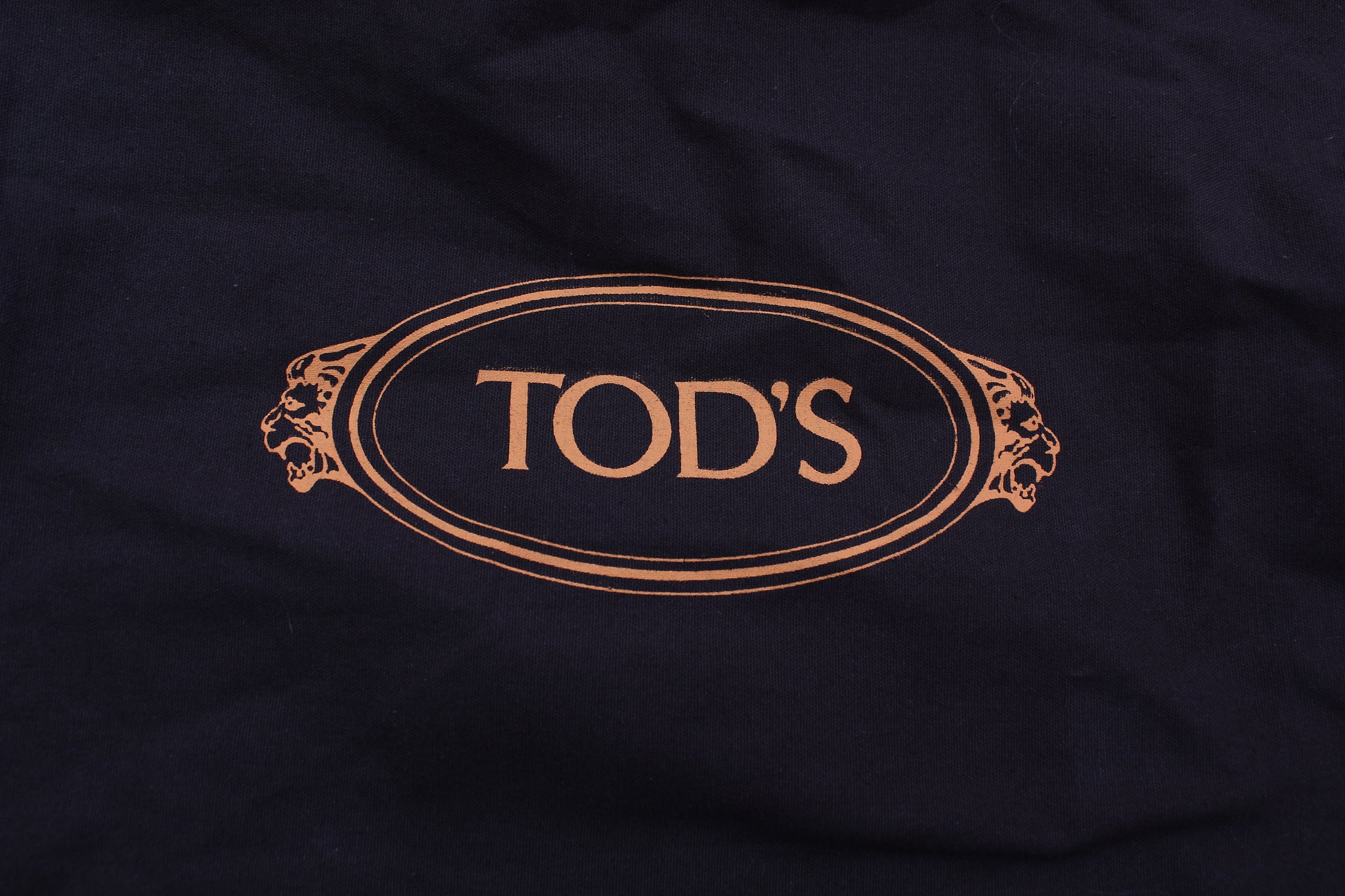 Tod's classic Mocassino tote bag with two shoulder straps, tonal stitching and signature studs at the base. Spacious lined interior with multiple compartments, slip pockets and zippered pocket. Measures: 14.5" W x 9.5" H x 5" D. Dust bag included