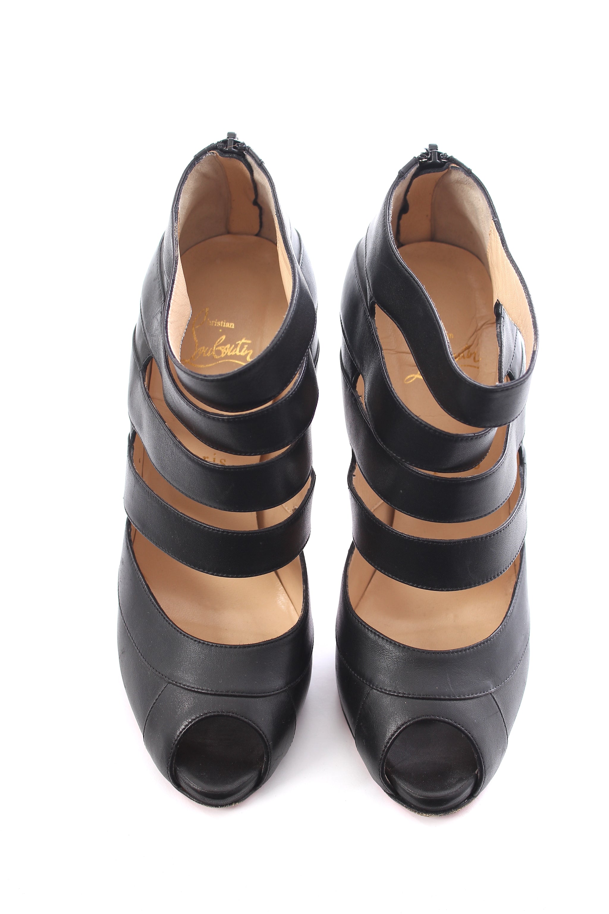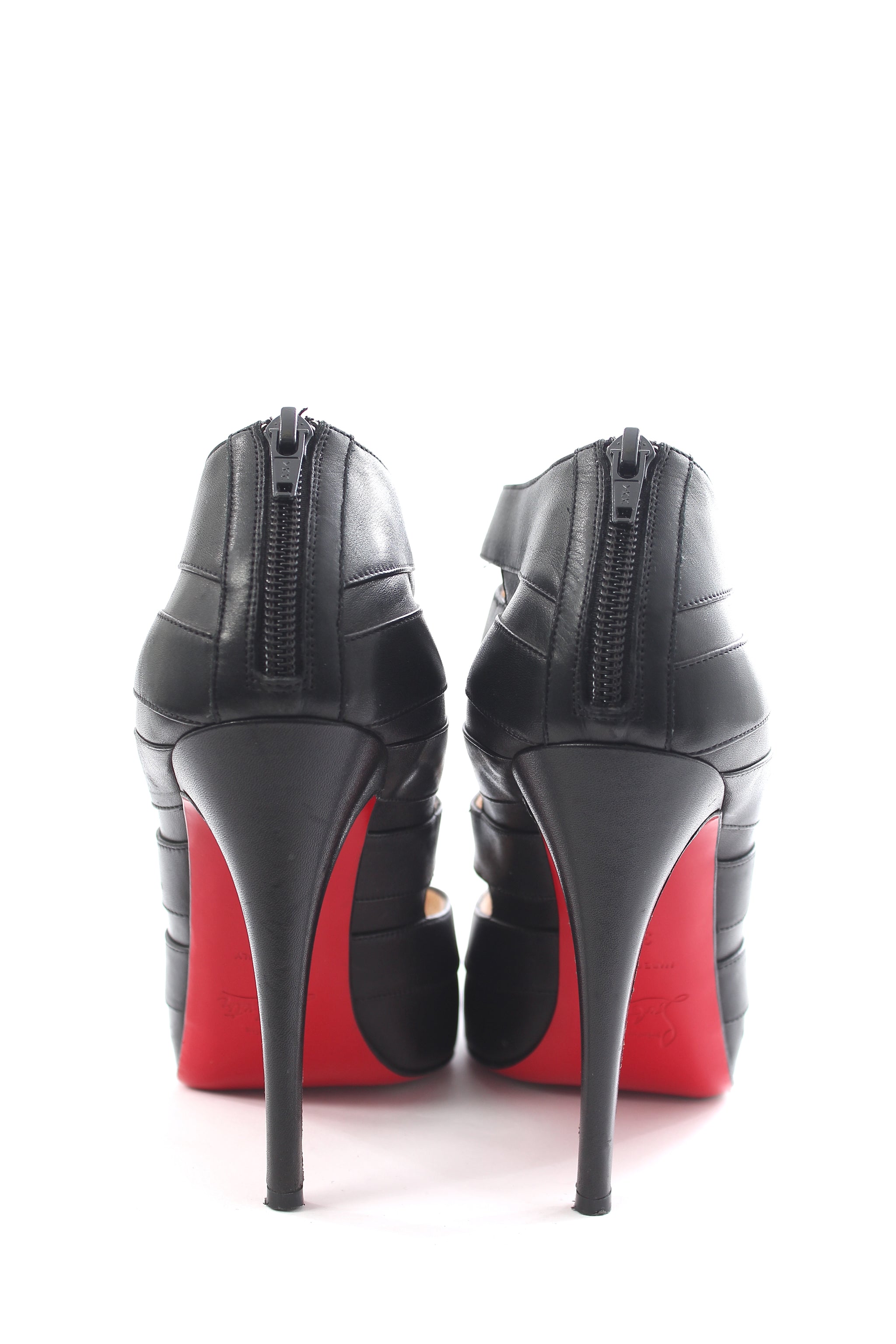 Cutout leather boots with open toe and zip fastening at the back. Signature red soles. 12cm heel. Box not included