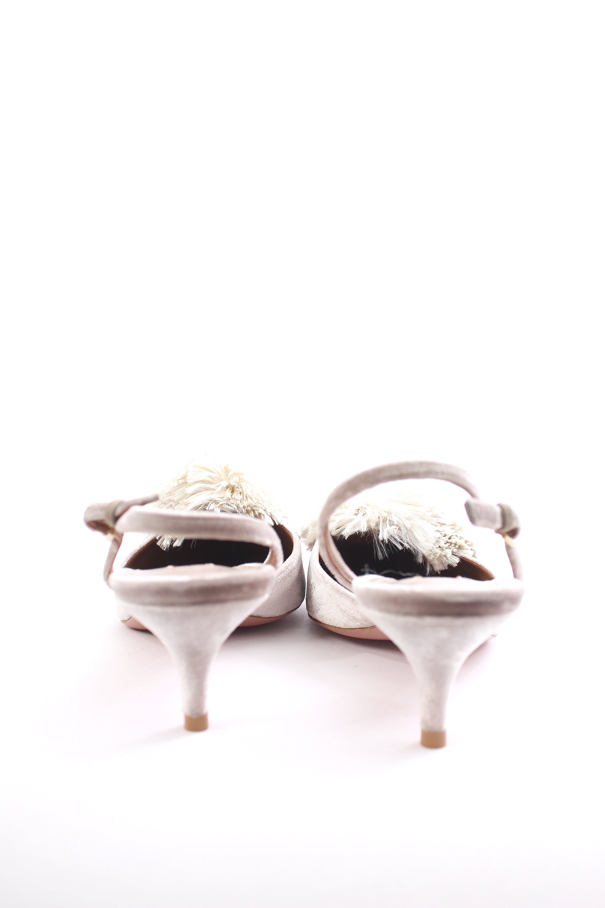 The Powder Puff velvet pumps with pom pom embellishment, pointed toe and slingback strap with buckle fastening. 5 cm heel. Box not included