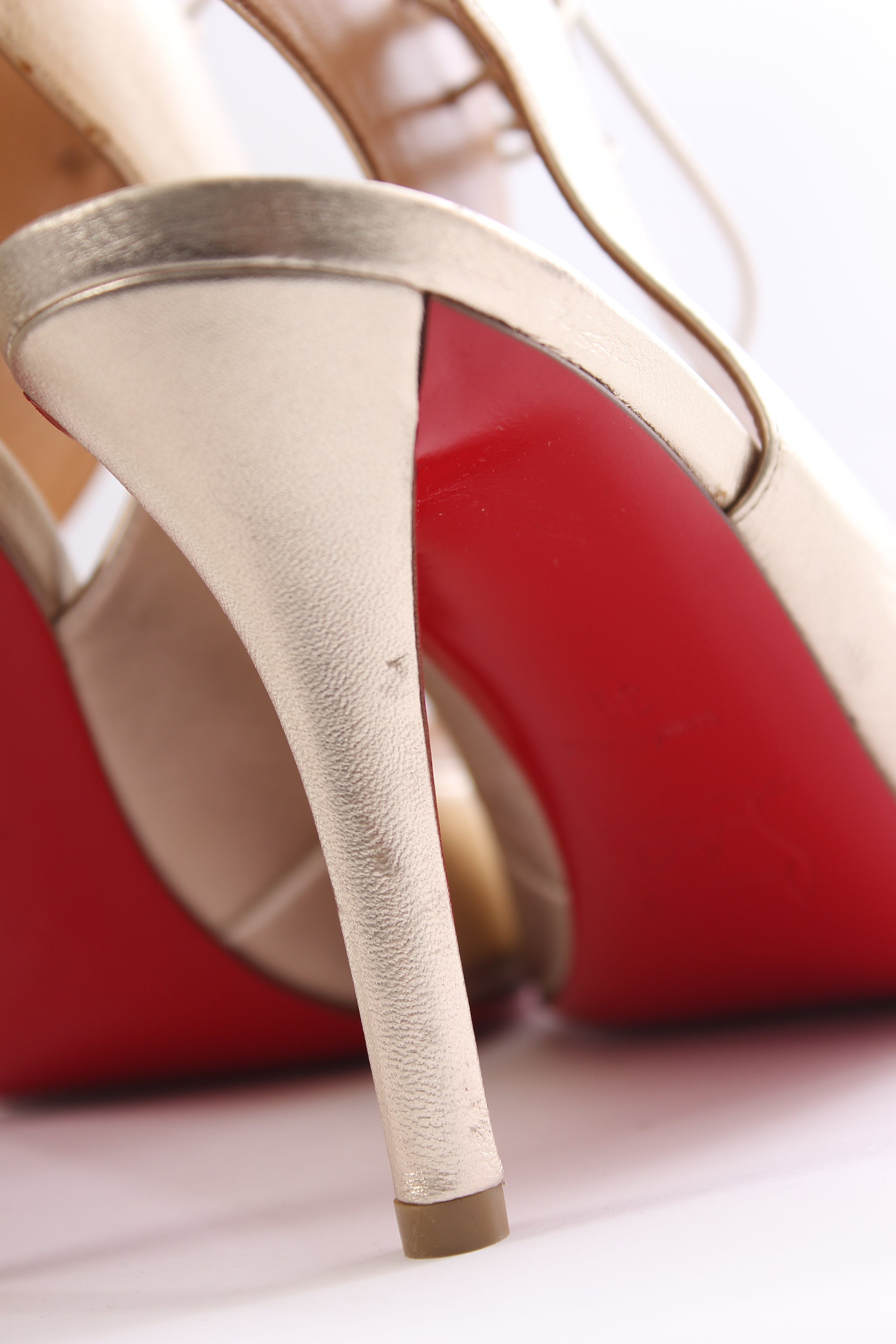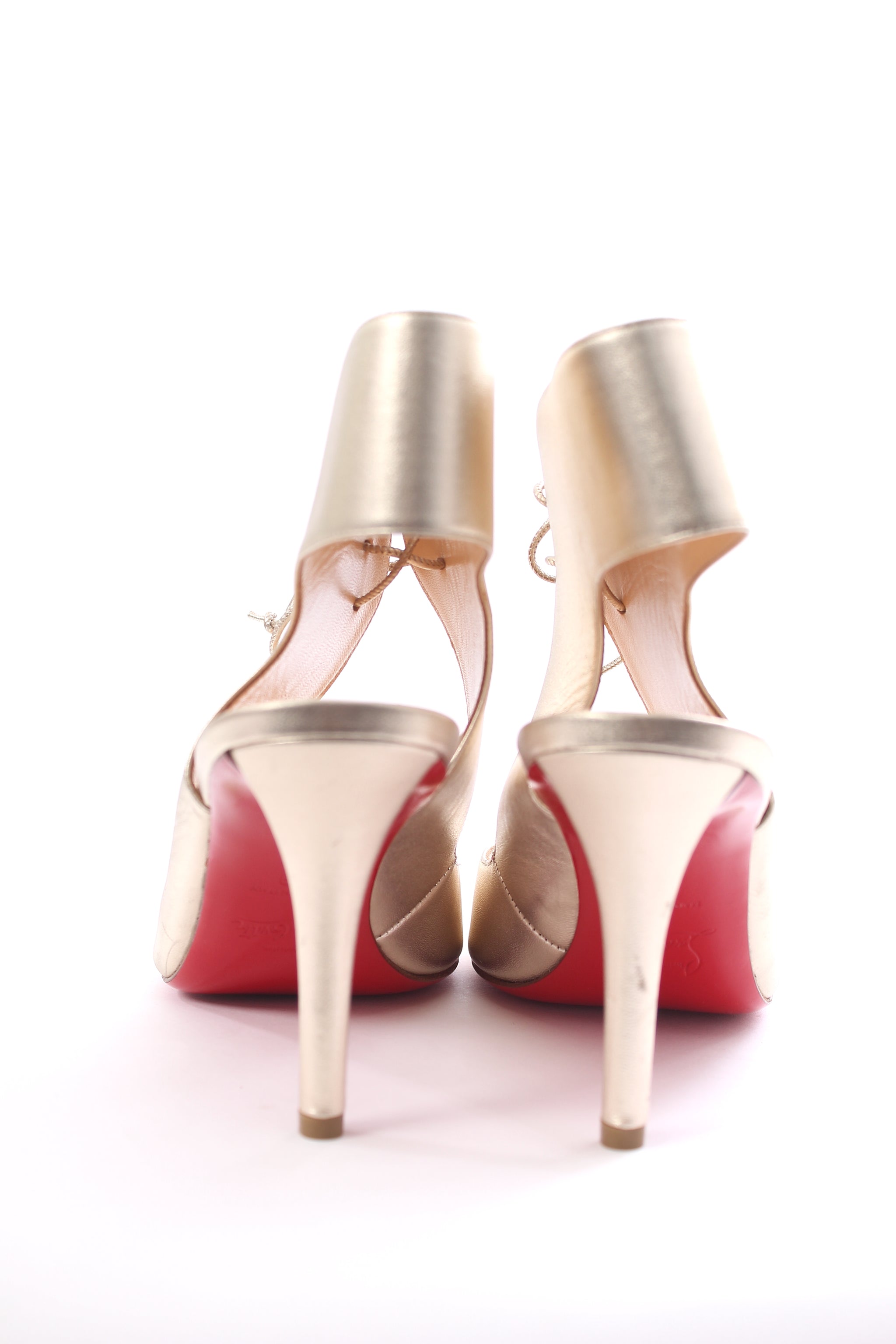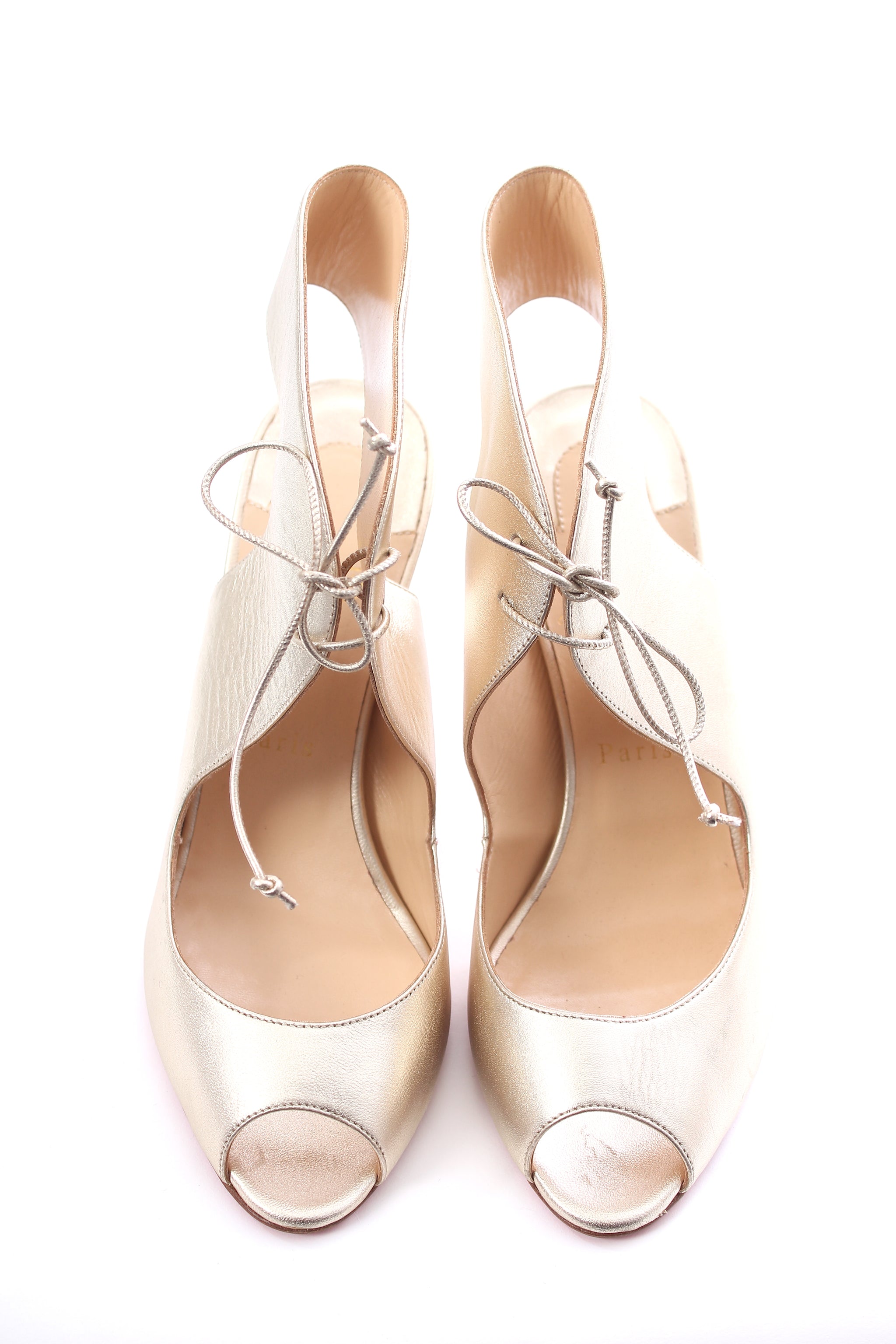 Christian Louboutin metallic leather sandals with ankle ties and a 85 mm stiletto heel. Signature red soles. Box/dust bags not included
