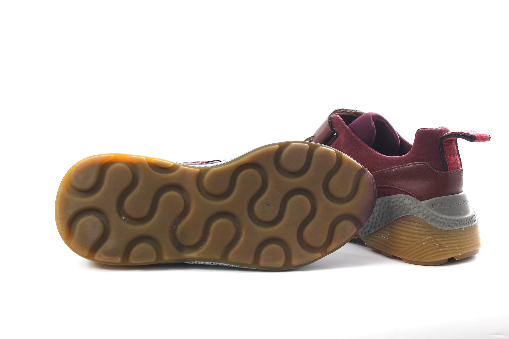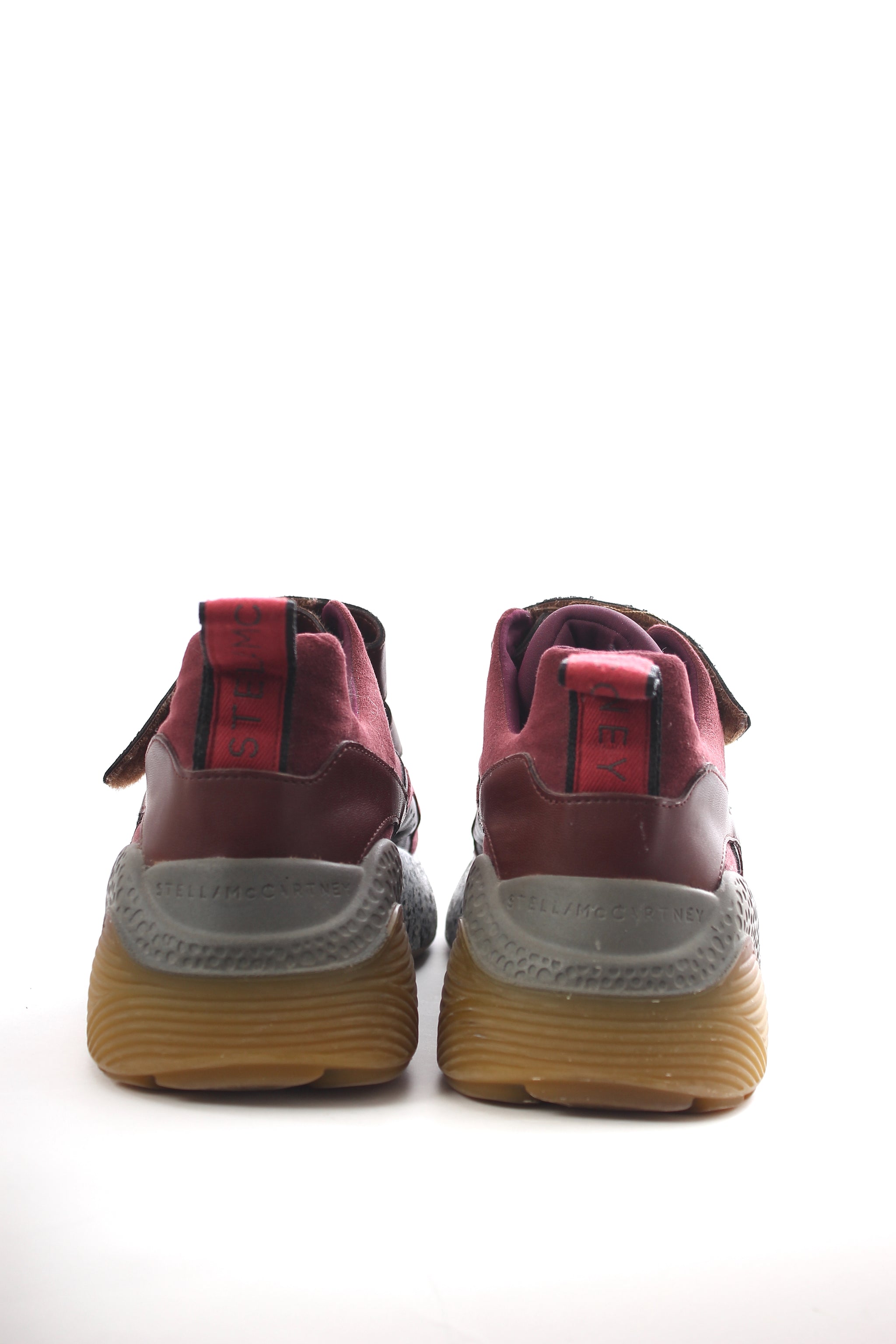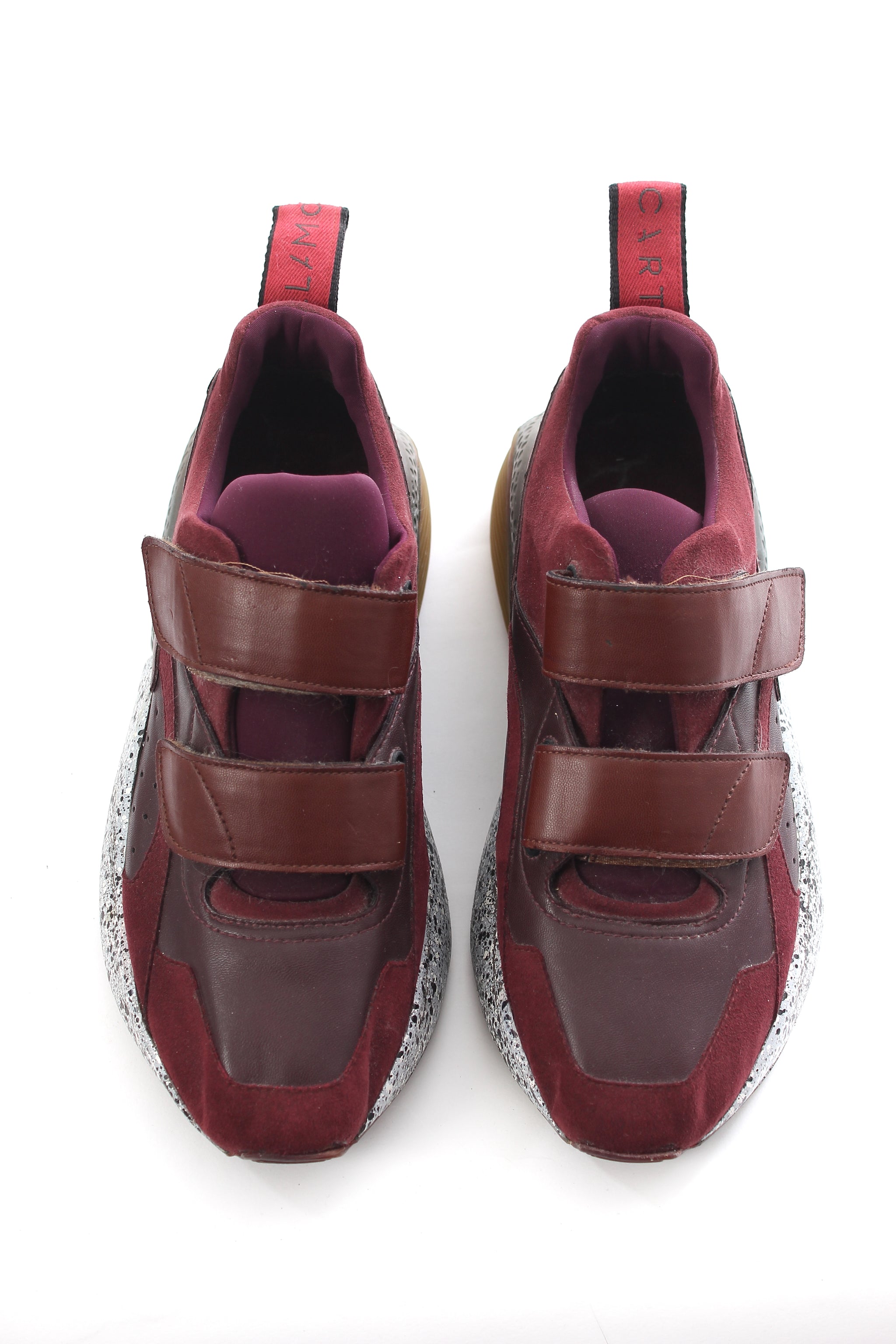 Low-top faux-suede, faux-leather and textile sneakers in burgundy. Twin Velcro straps at vamp. Perforated detailing at sides. Padded tongue and collar. Logo pull-loop at heel collar. Textured rubber midsole in grey featuring graphic pattern in tones of white grey and black. Treaded rubber outsole in brown. Box not included