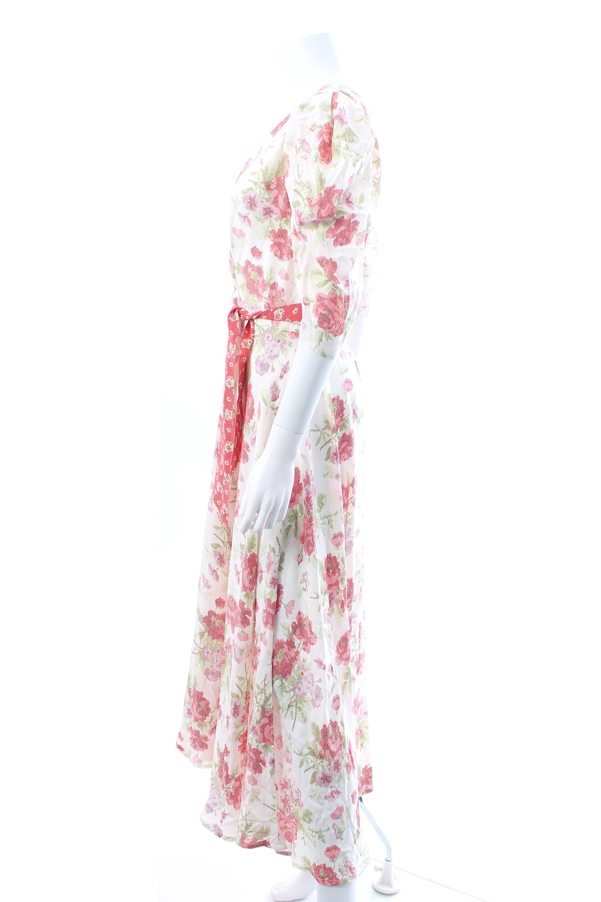 Floral silk printed dress with pleats and short puff sleeves. V-neck. Contrasting waist tie