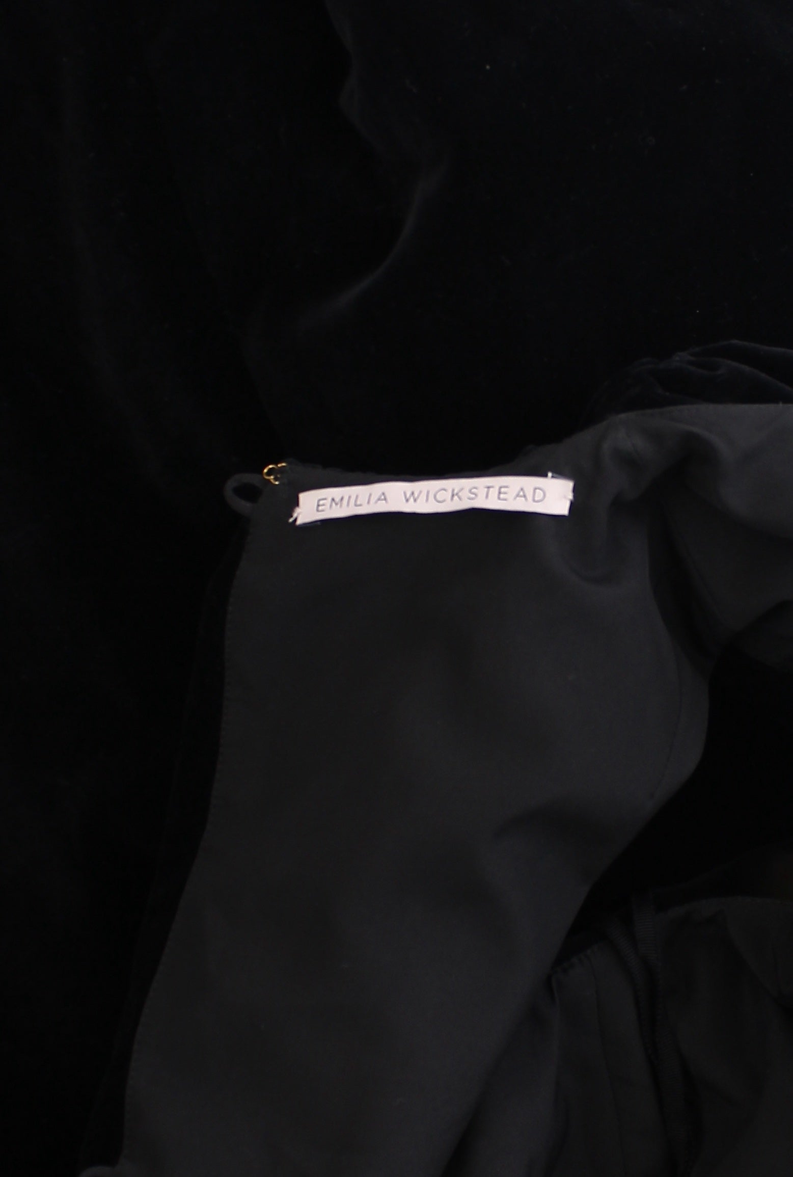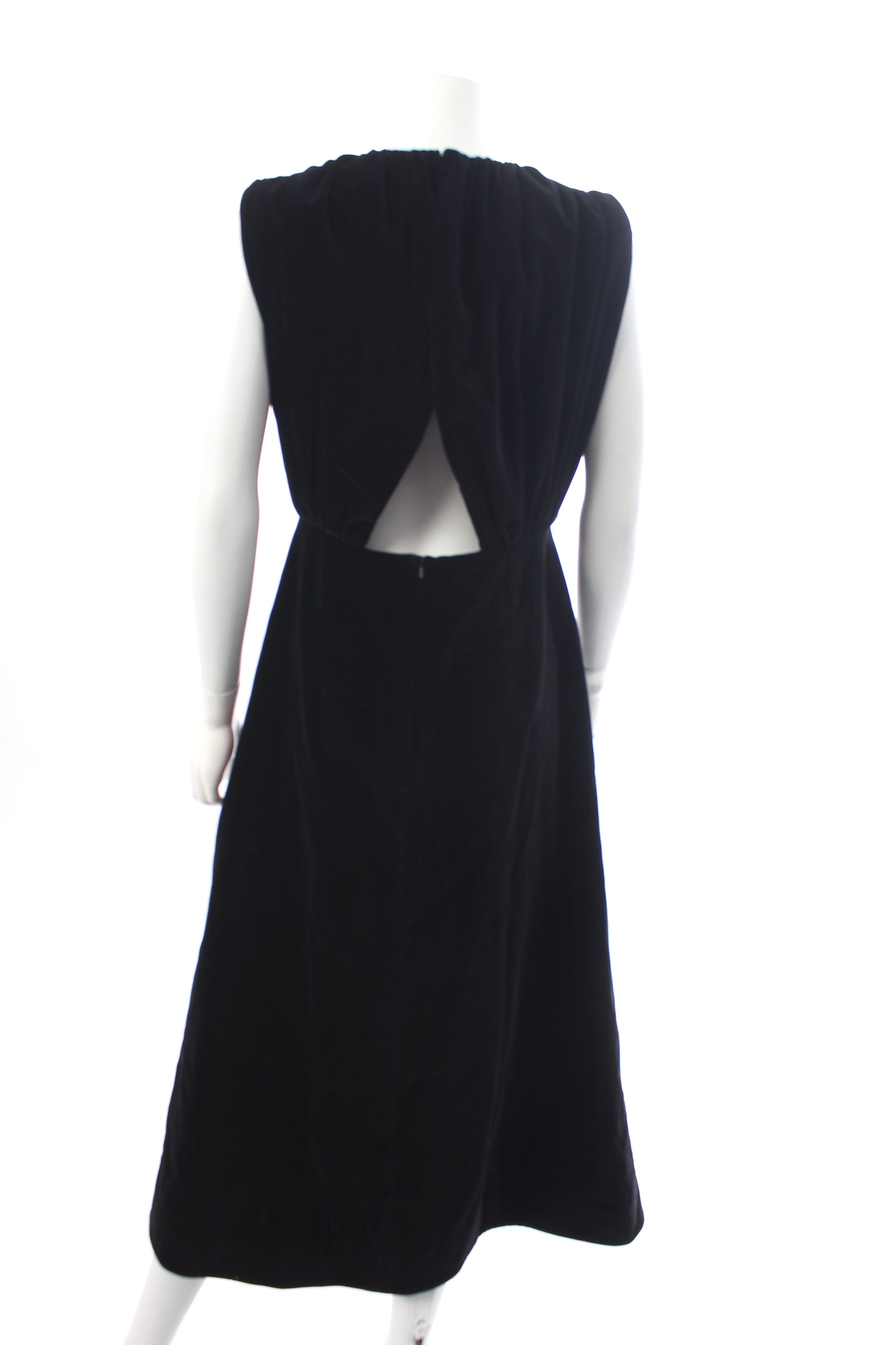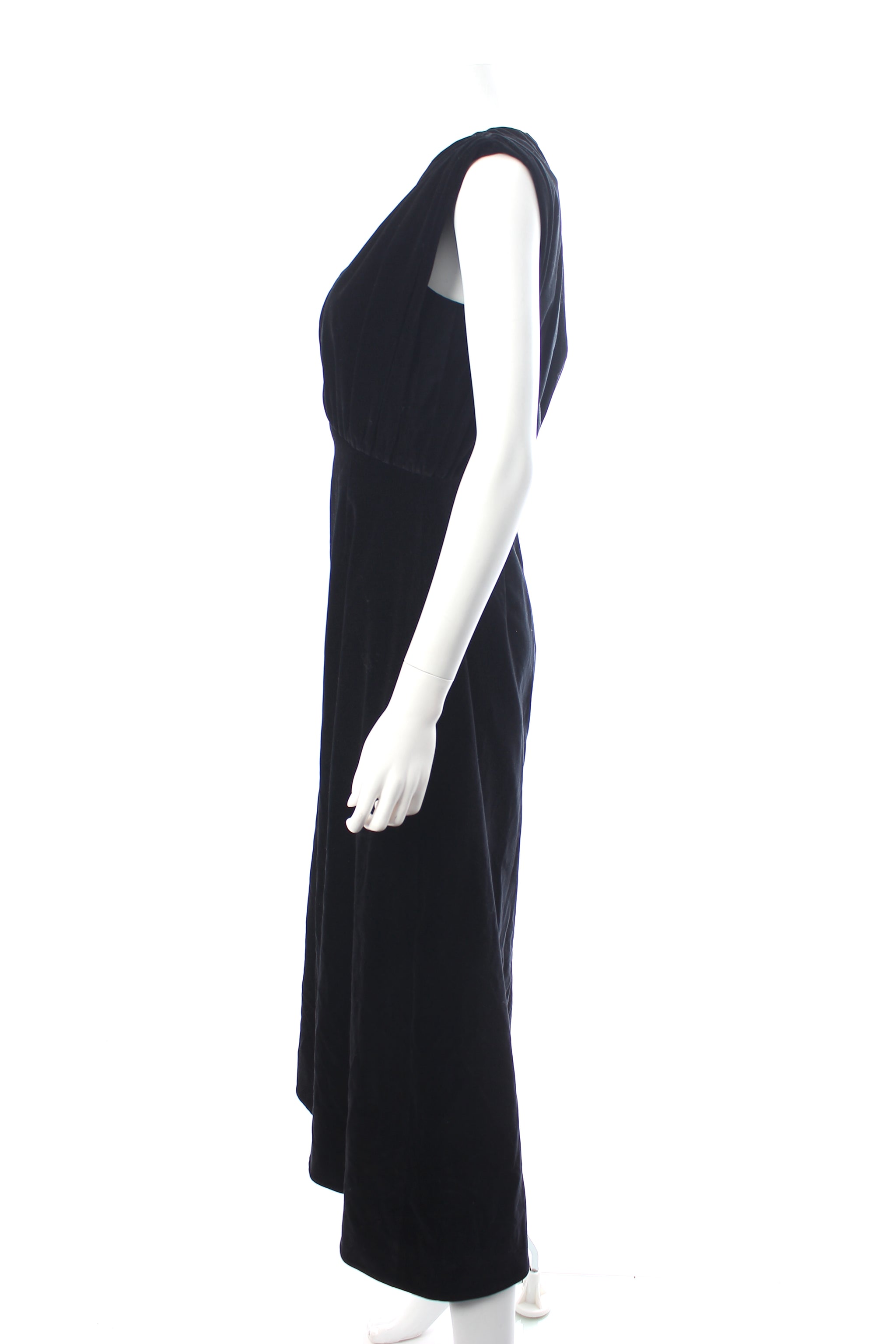 Velvet long dress with gathering at the shoulders and an a-line cut skirt. Cut outs and the front and back. Zip and button fastenings. Lined. NOTE: size and care labels were removed. Dress fits 12-14 UK
