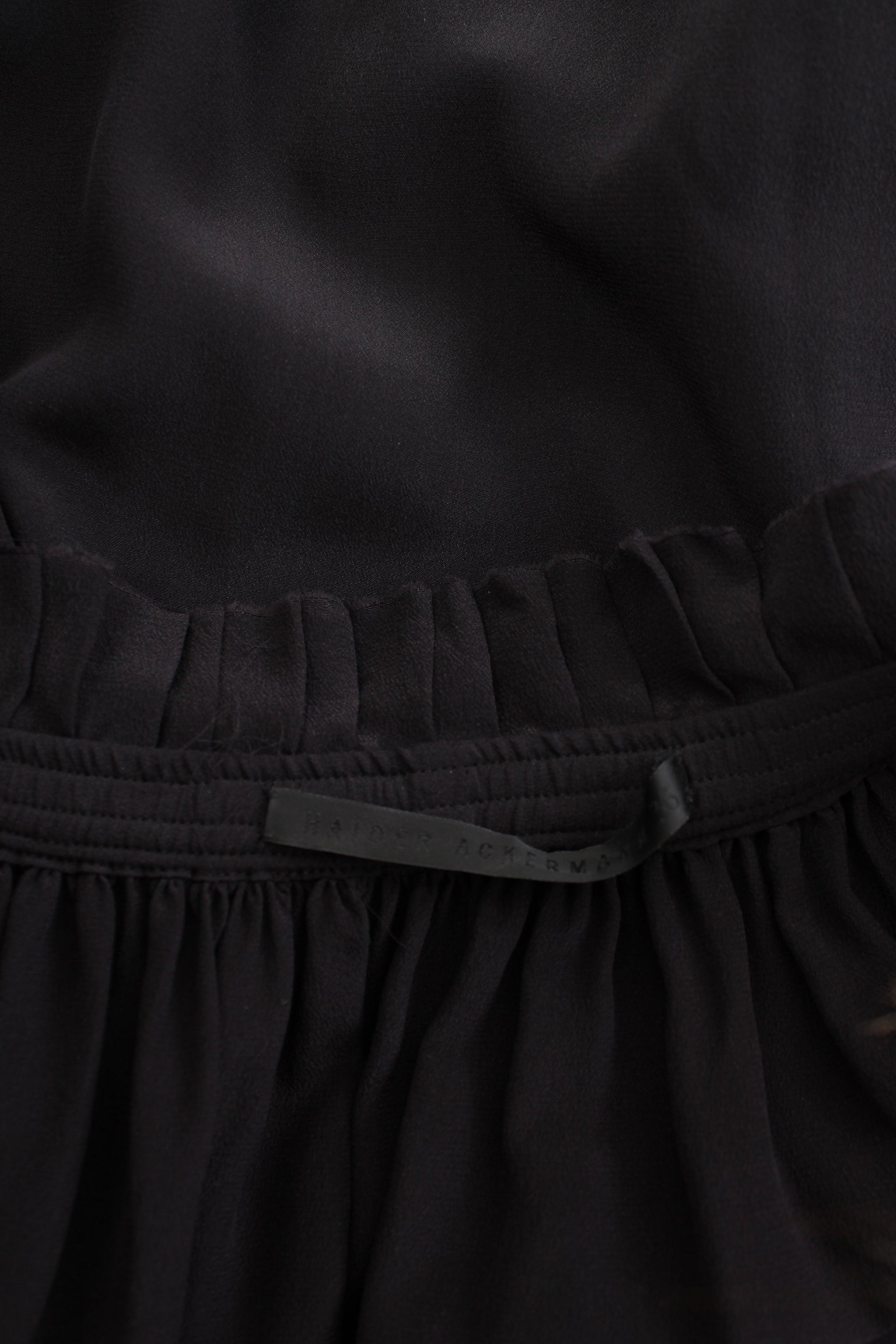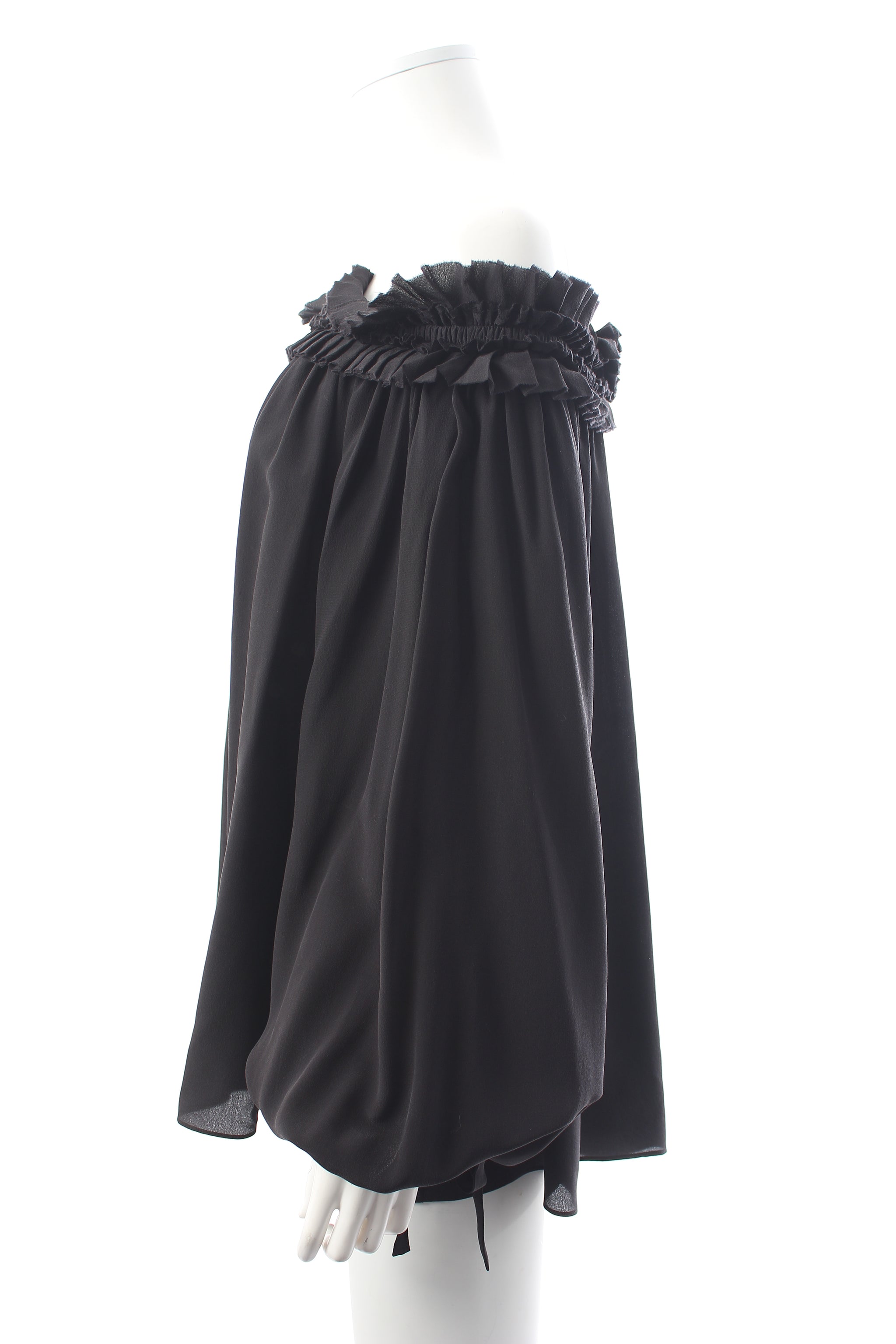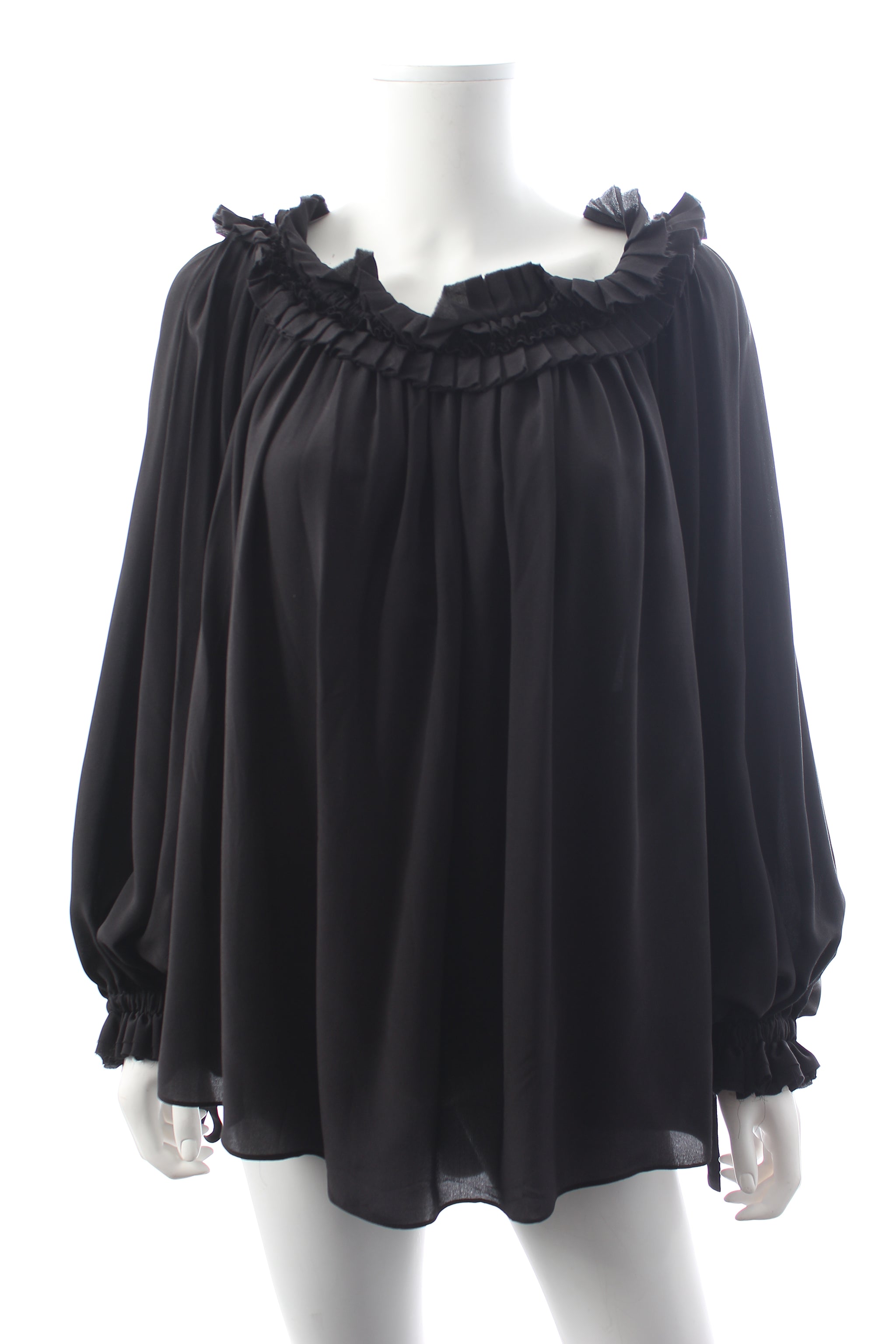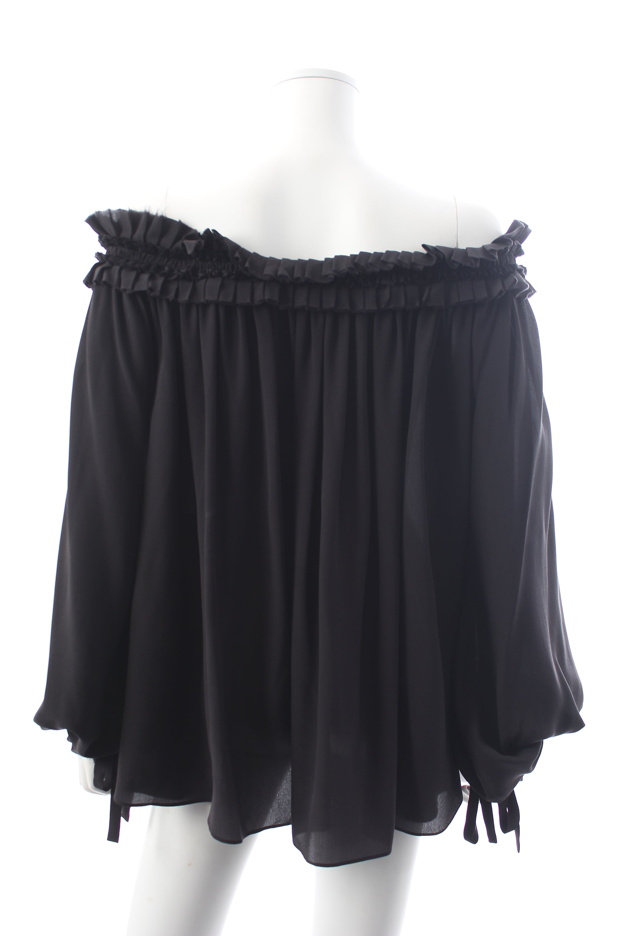 Silk blouse with ruffled pleated detailing. Off-the-shoulder style. Ties at the cuffs