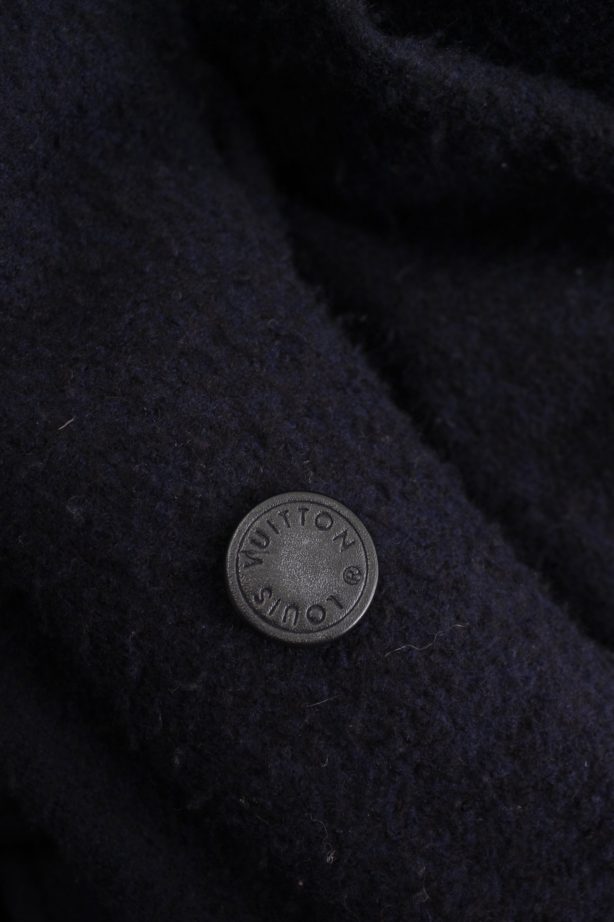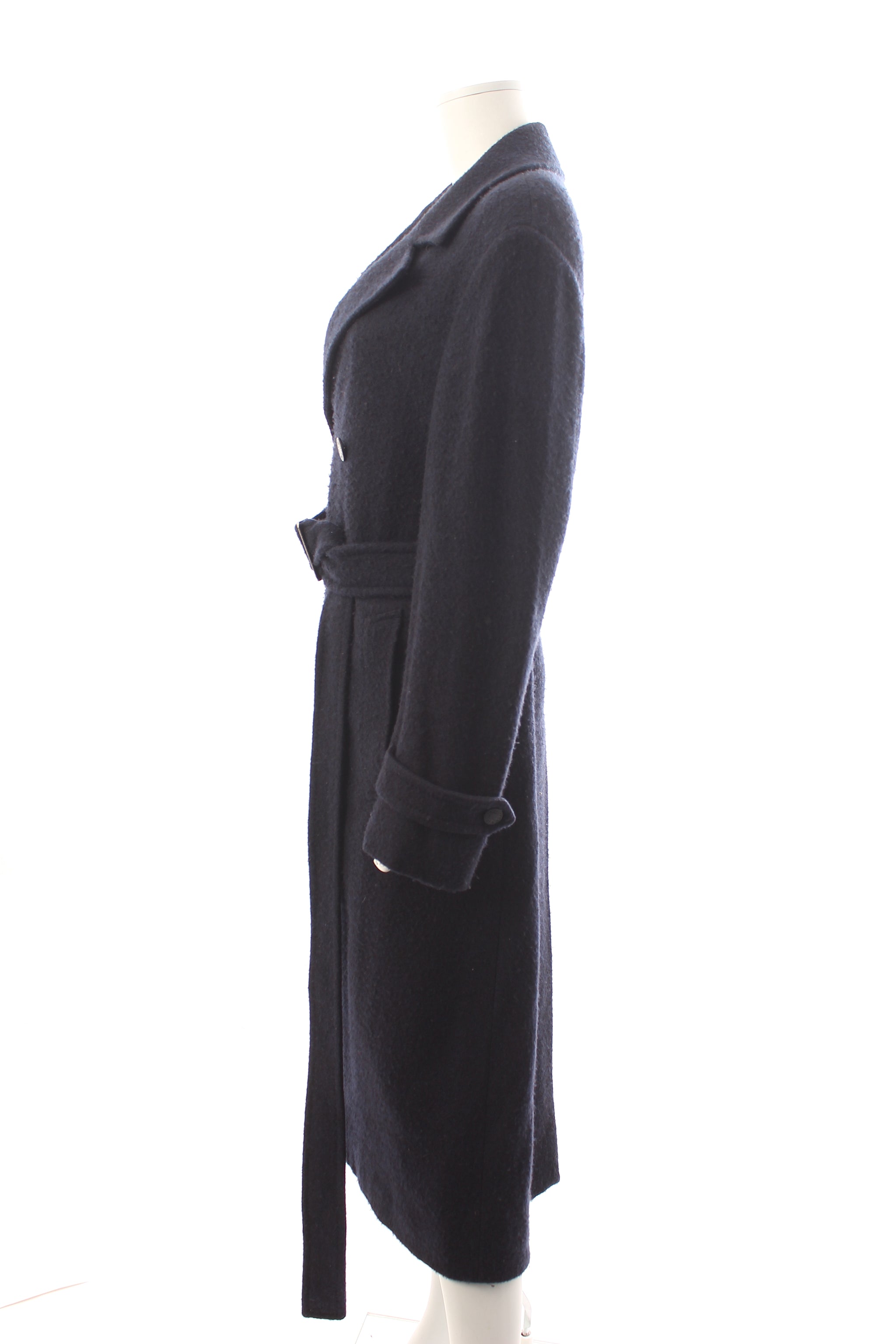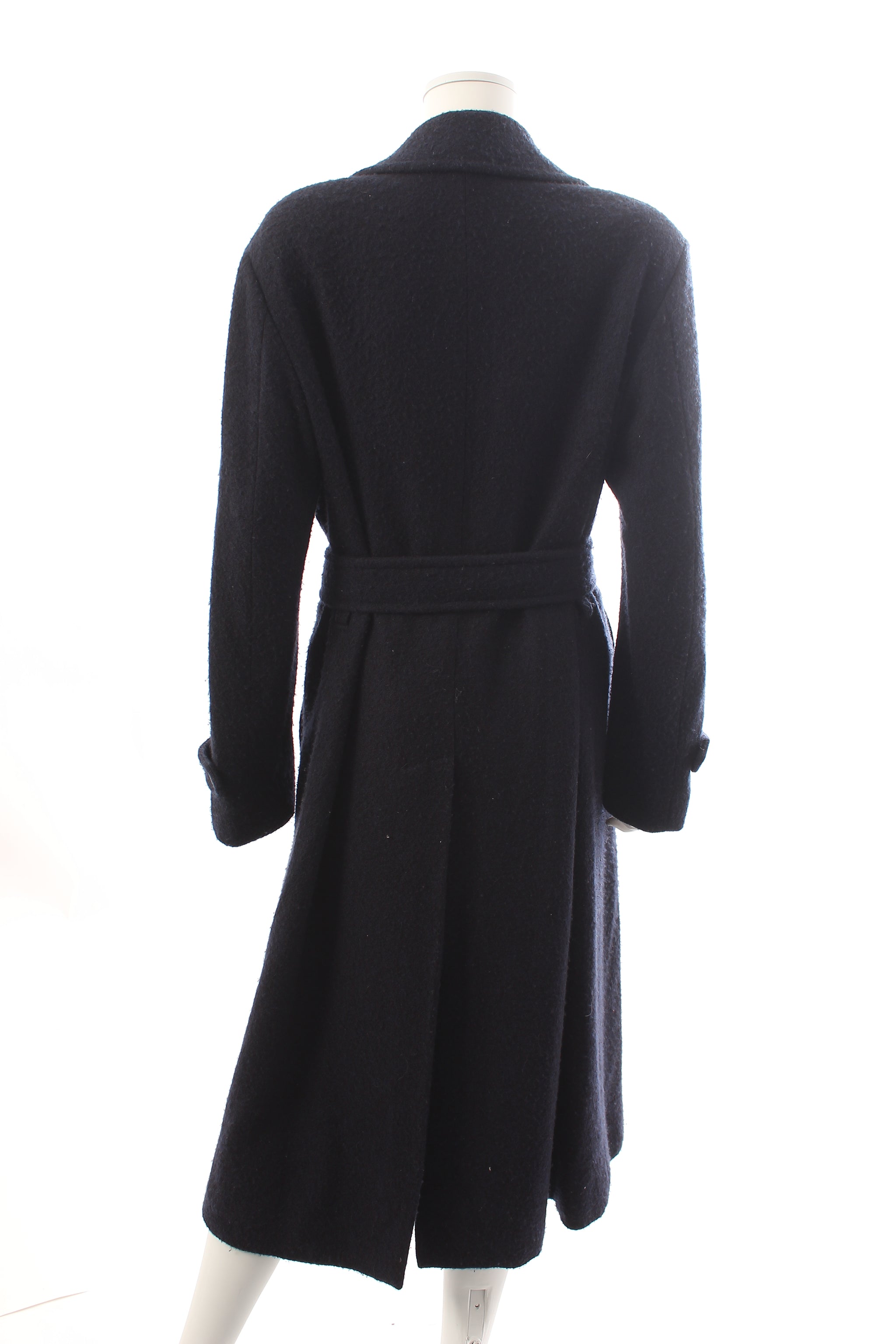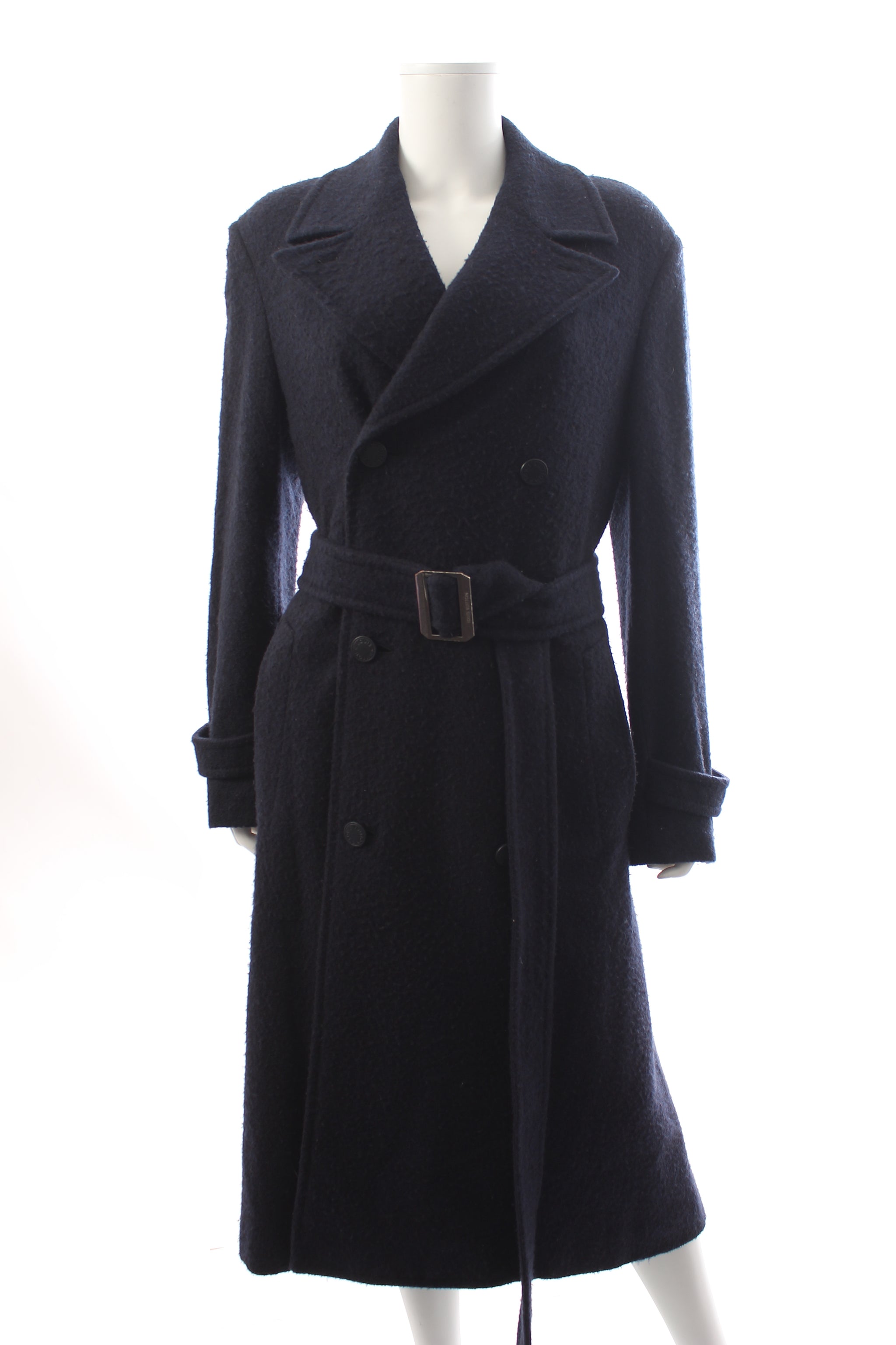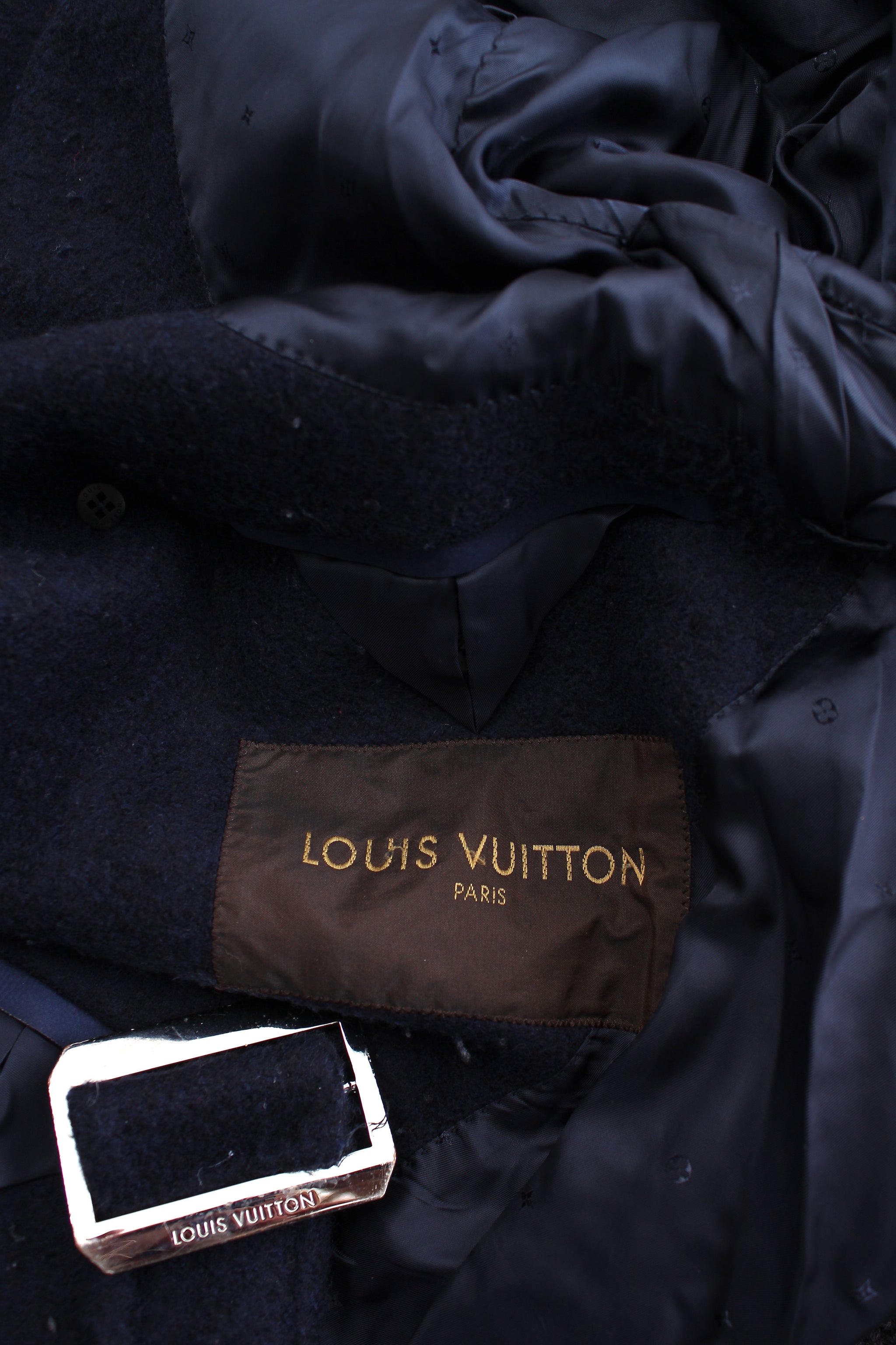 Textured wool coat with double breasted front fastening and waist belt. Louis Vuitton engraved buckle. Lined. NOTE: fabric/size labels were removed. Coat fits a size medium/12 UK. Fabric has a pilled-like texture throughout which is the nature of the fabric, not from wear