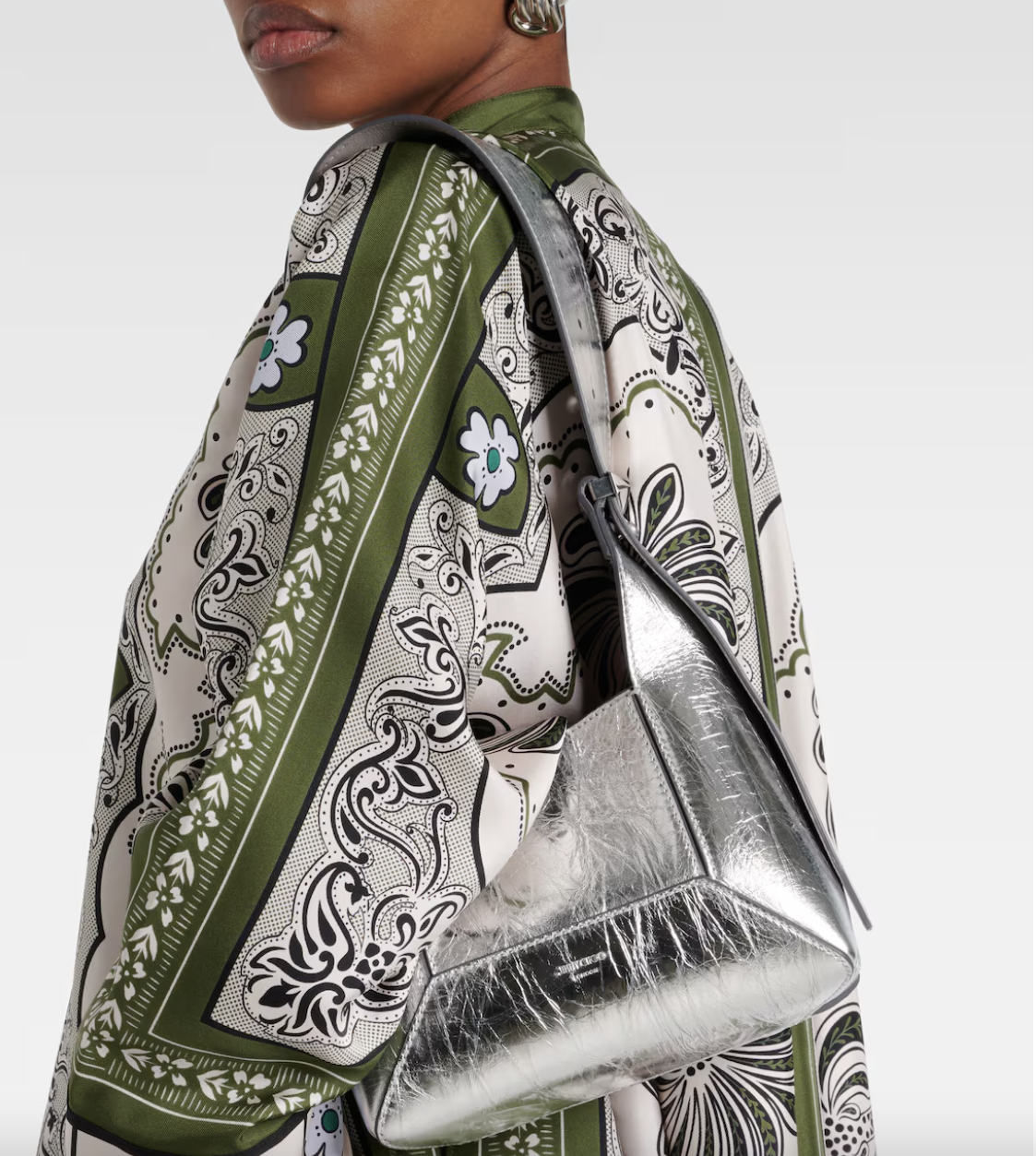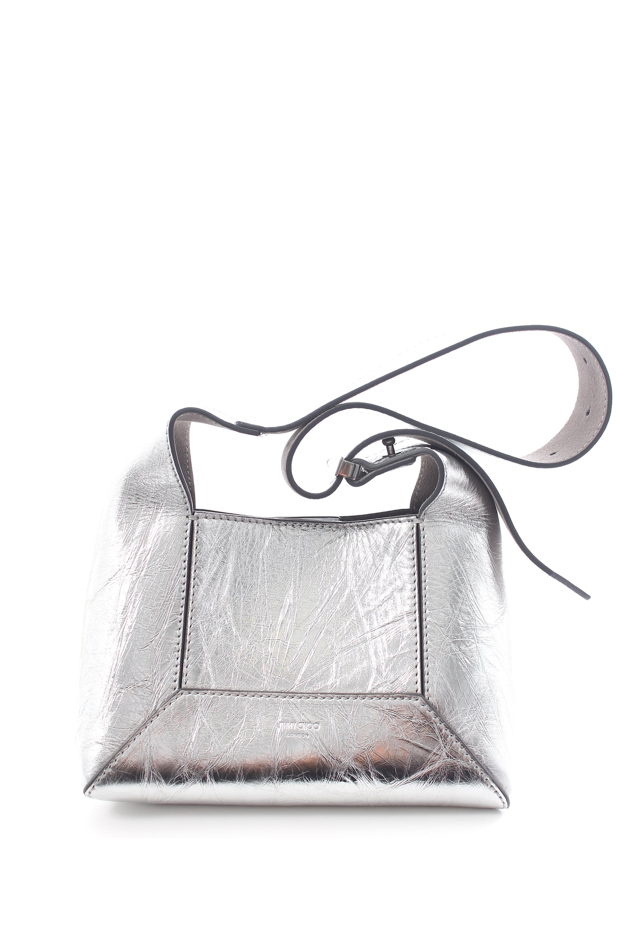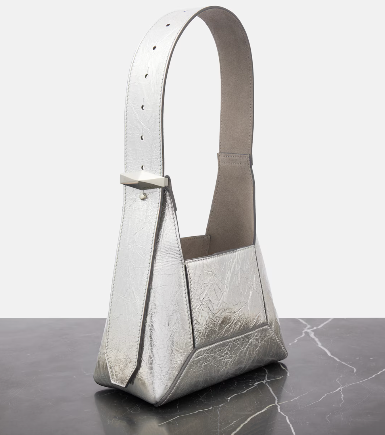 The Diamond Shoulder Bag is an epitome of contemporary elegance and sophistication. This radiant silver handbag boasts a distinctive geometric form. in a subtle crinkled texture leather. The interior is lined with suede. Adjustable shoulder strap and a magnetic clasp. Dust bag and authenticity card included. Measures: 21 cm W x 15 cm H x 11 cm D