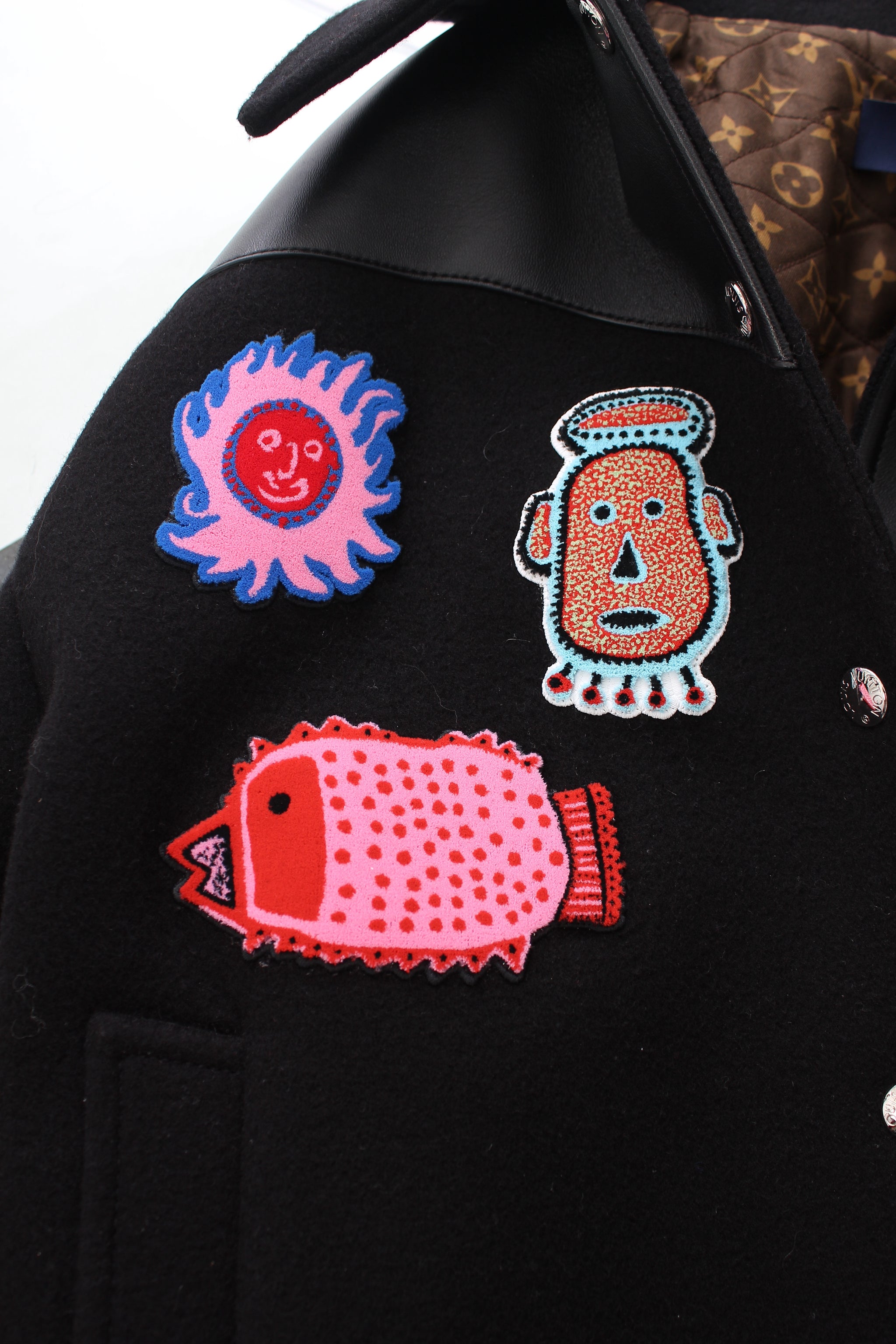 An iconic Collectors Item from the Louis Vuitton x Yayoi Kusama Collaboration. This 23SS varsity jacket is made from a blend of wool and cashmere with embroidered patches, leather panels and a LV monogram silk-blend quilted lining. Snap button fastenings through the front