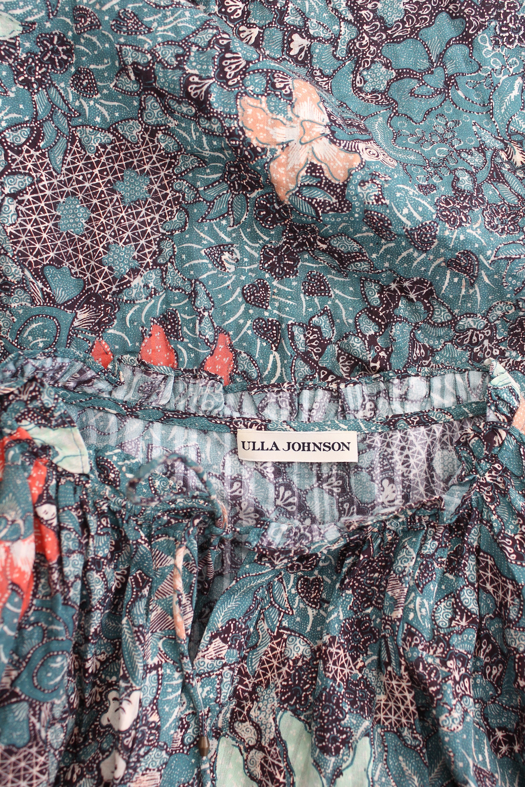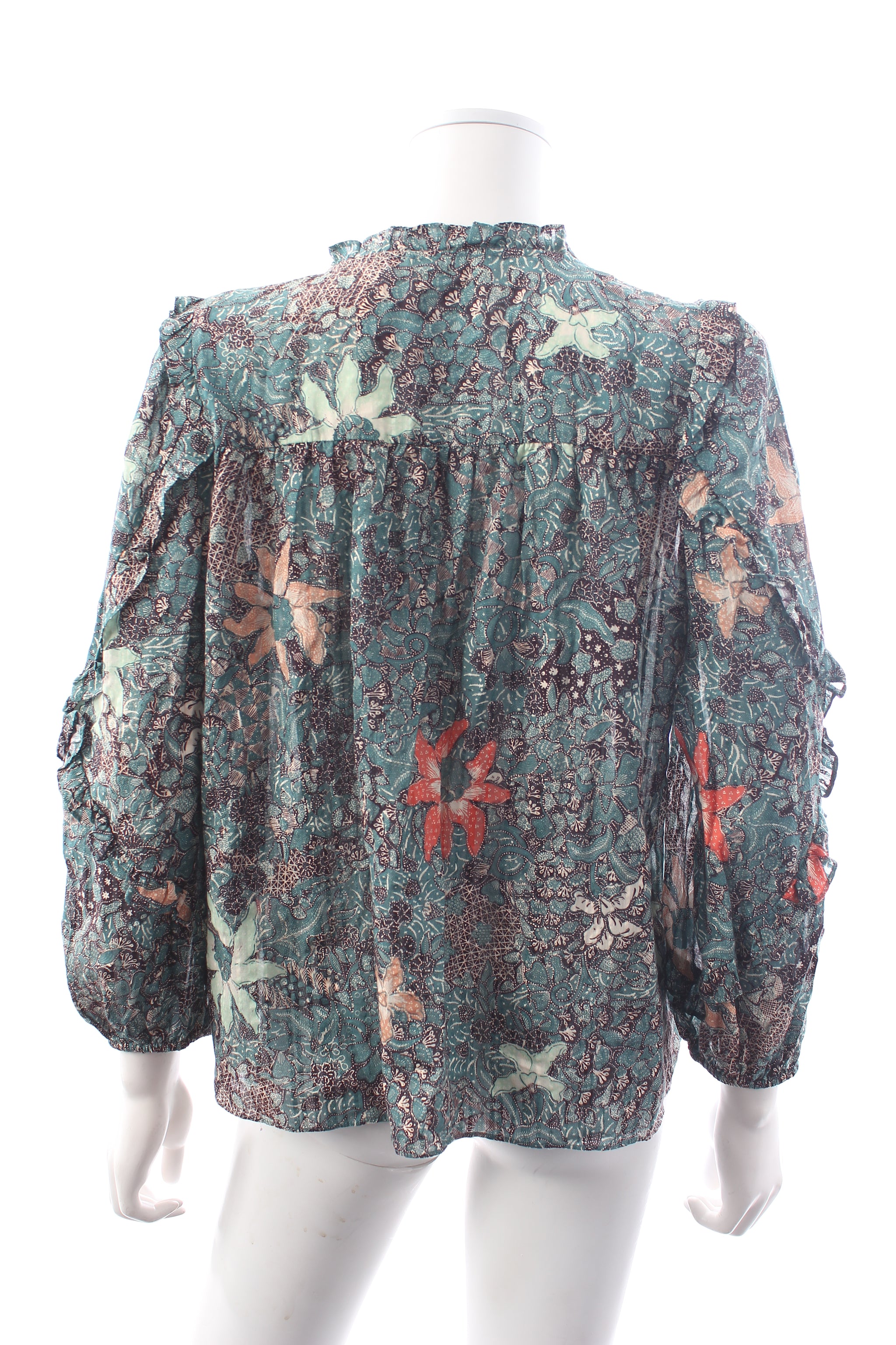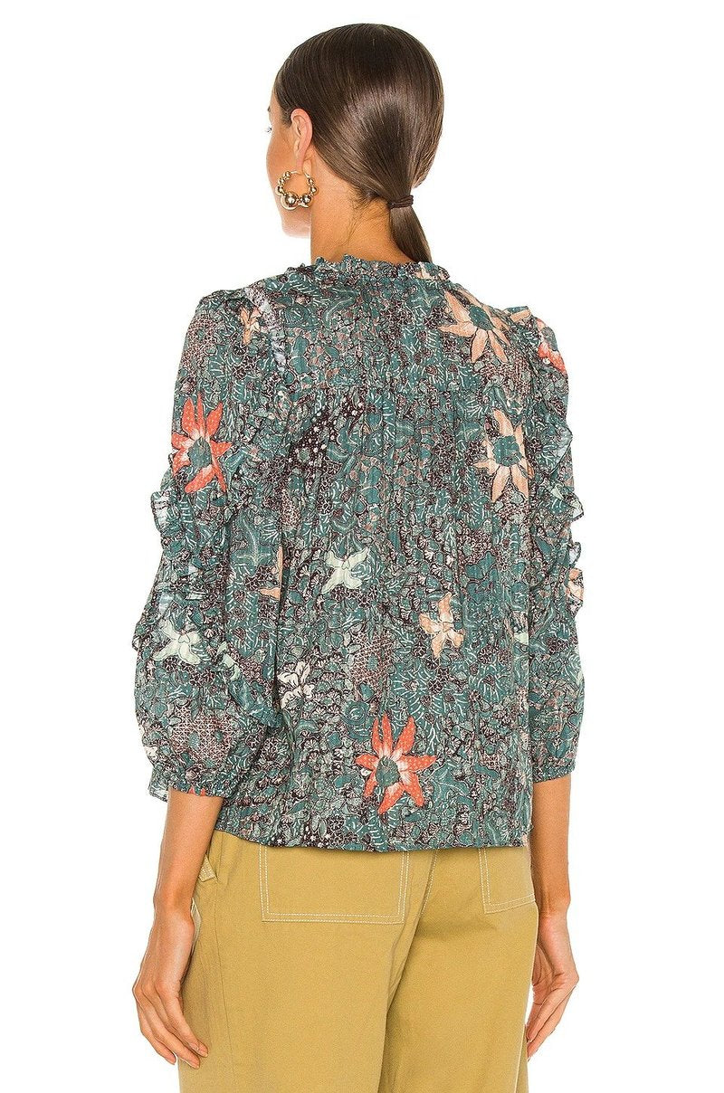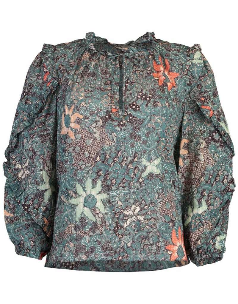 The Manet blouse in lightweight shadow stripe shirting, decorated in a dense geometric floral print. The blouse features a full-length sleeve with wraparound cascade ruffles and finished with an elastic cuff and self-tie closure at the neckline