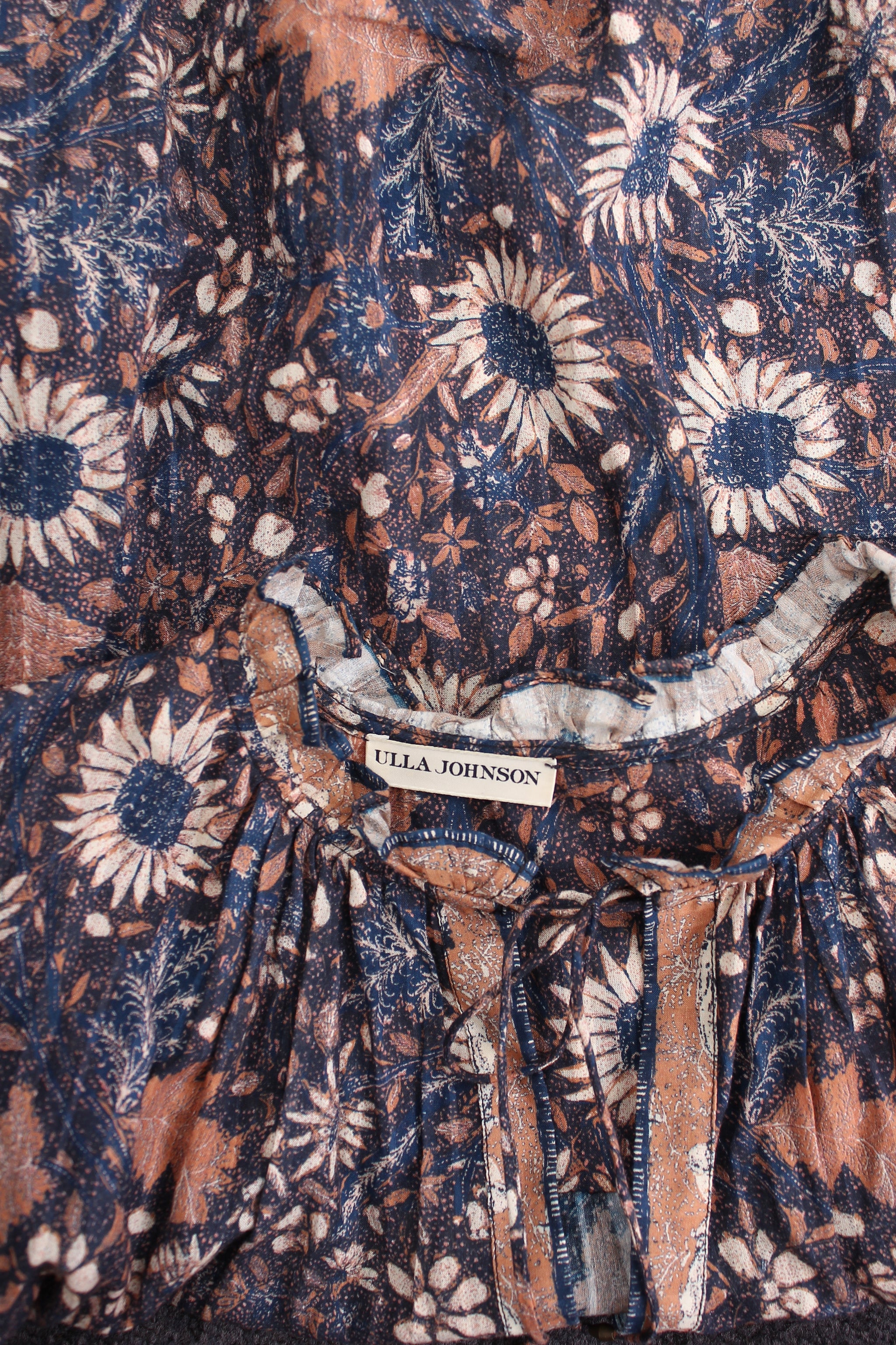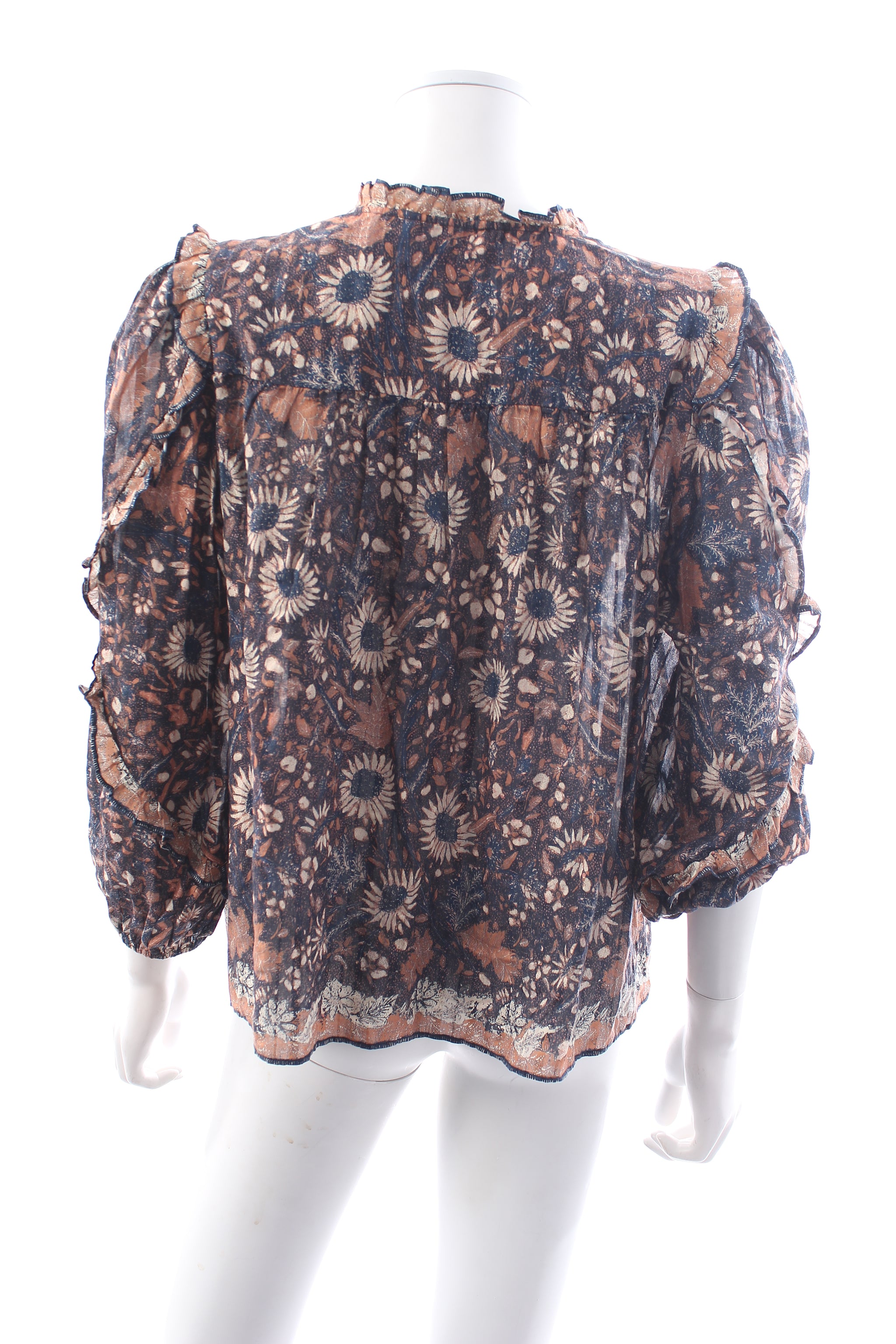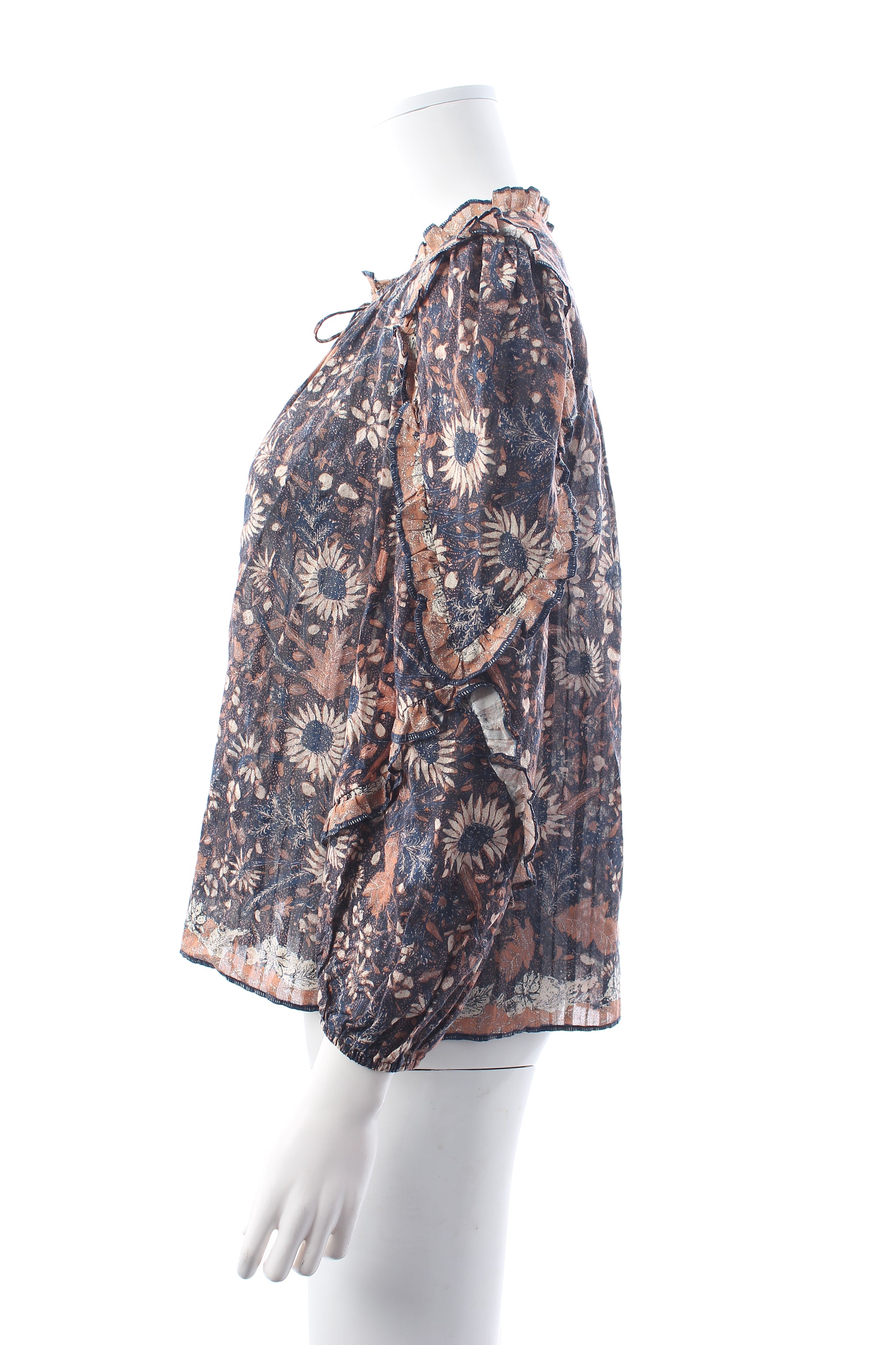 The Manet Blouse in printed shadow stripe shirting featuring a full length sleeve adorned with delicate cascade ruffles and finished with an elastic cuff. Self tie closure at the neckline