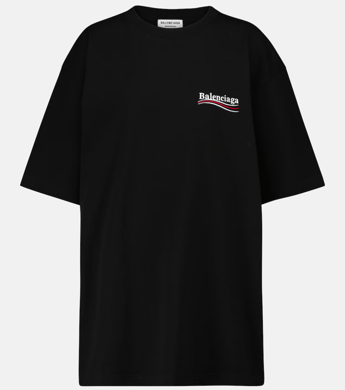 Always an agenda-setting house, Balenciaga designs this black cotton T-shirt with political references. It's made for a generous fit with dropped shoulders and elbow-length sleeves