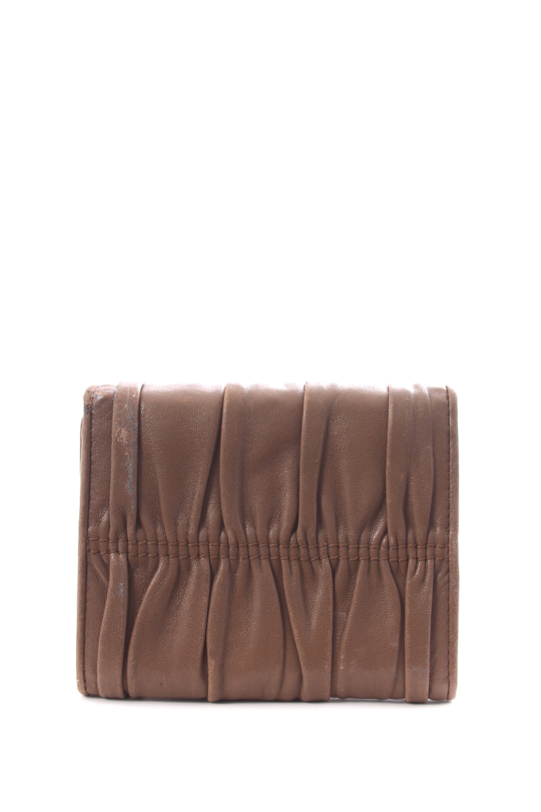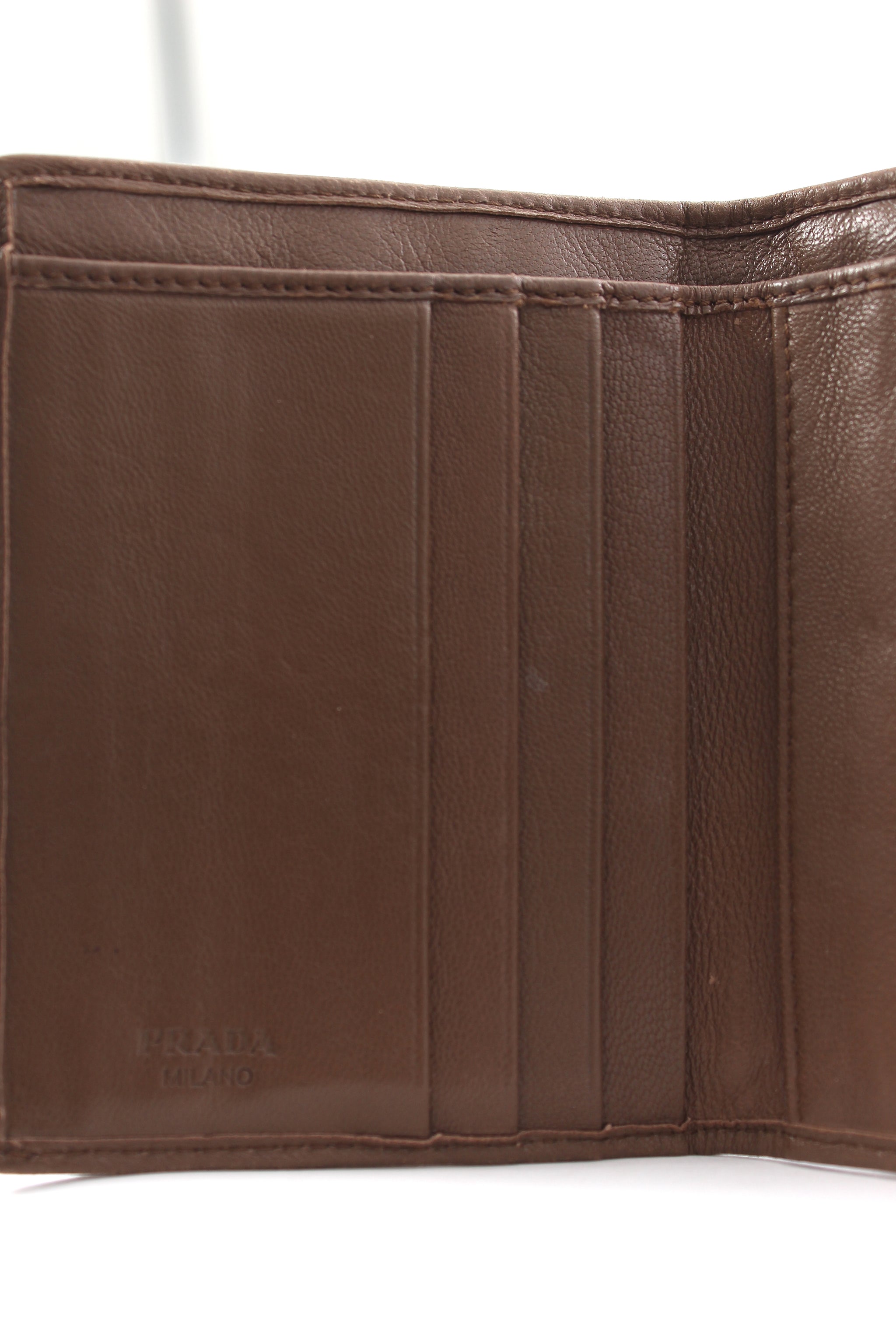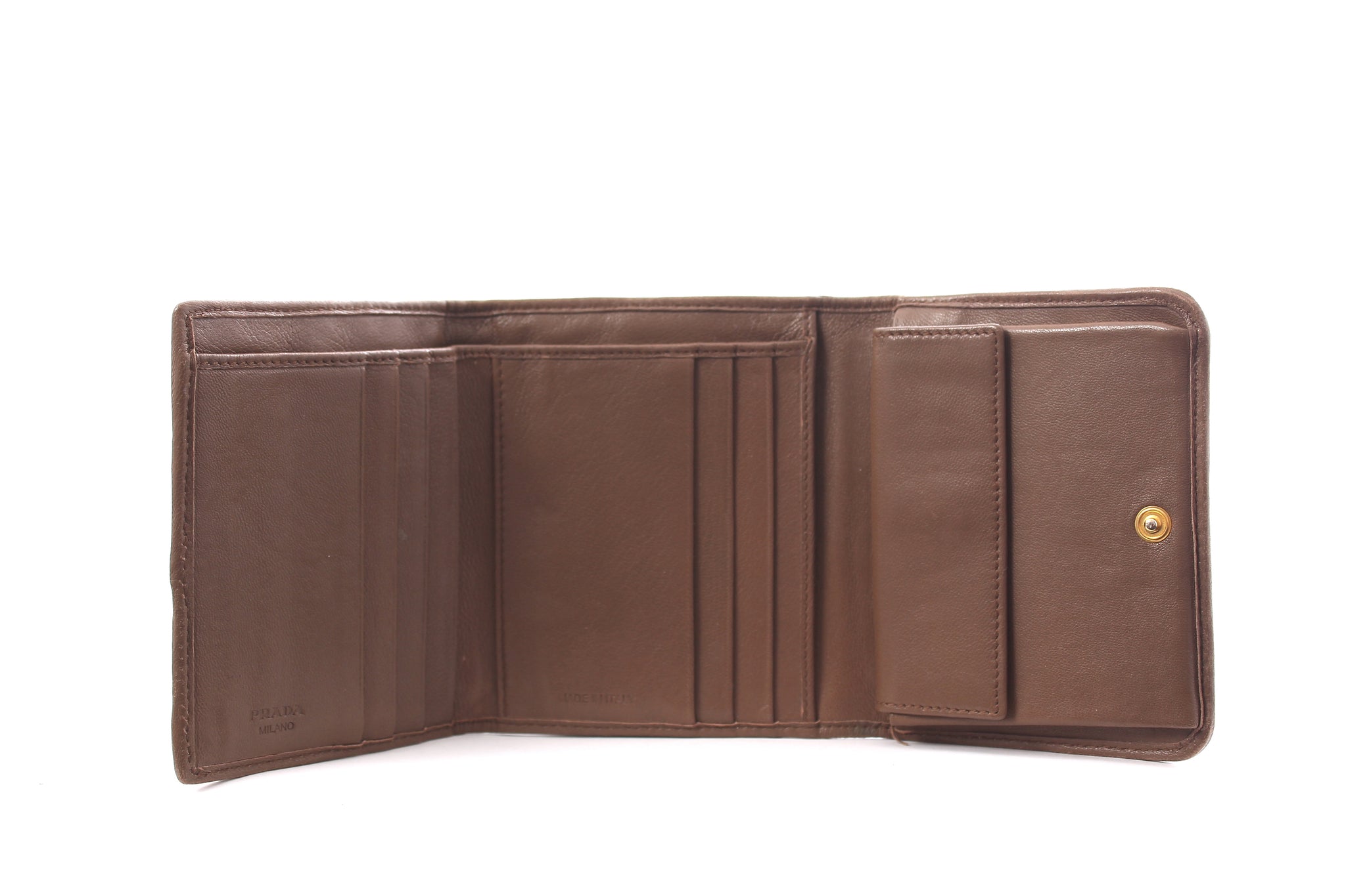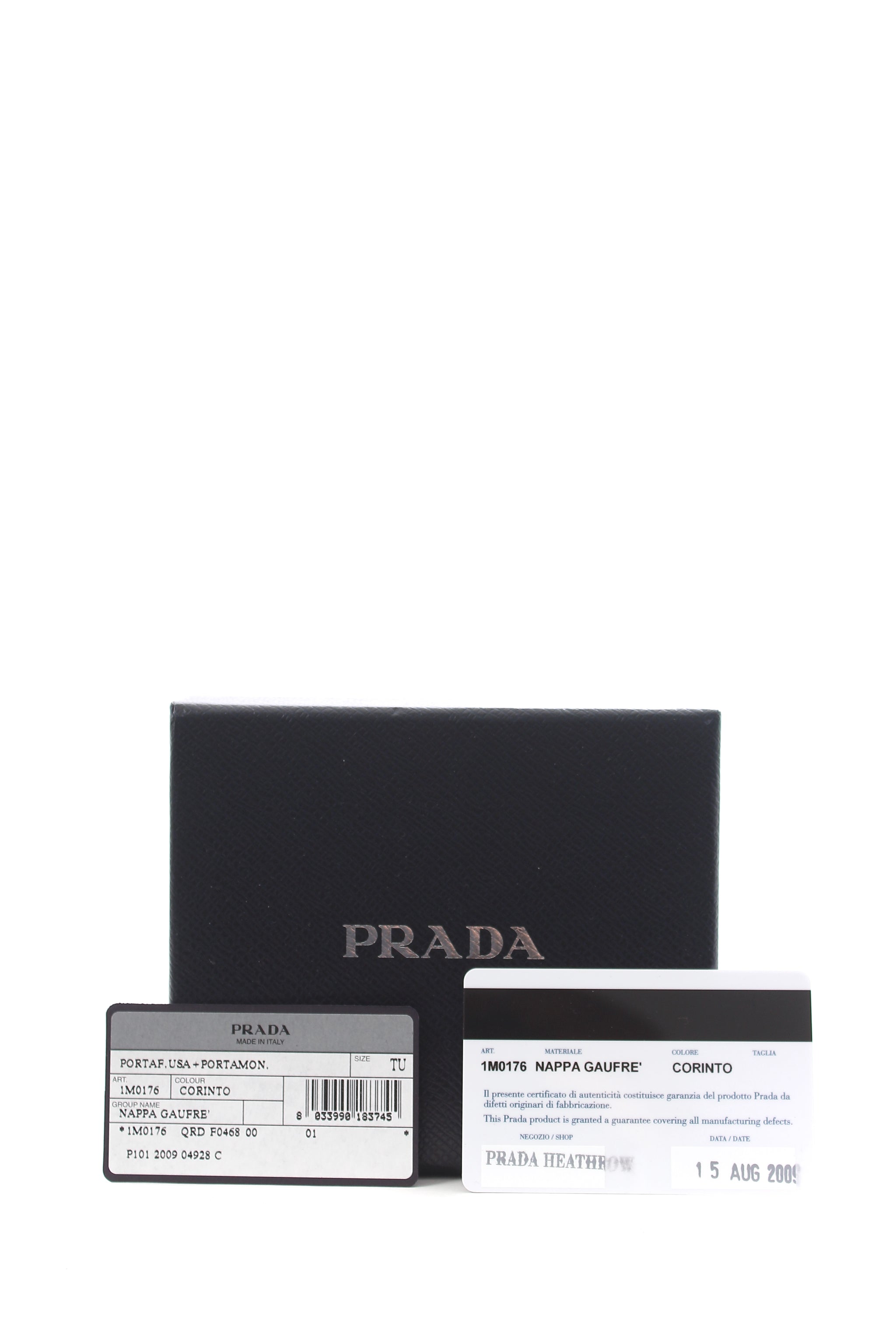 Prada Gaufre leather wallet with logo plaque and compact folded design. Snap button fastening. Note compartment, card slots and pocket. Measures: 11 cm x 9 cm. Box and authenticity card included